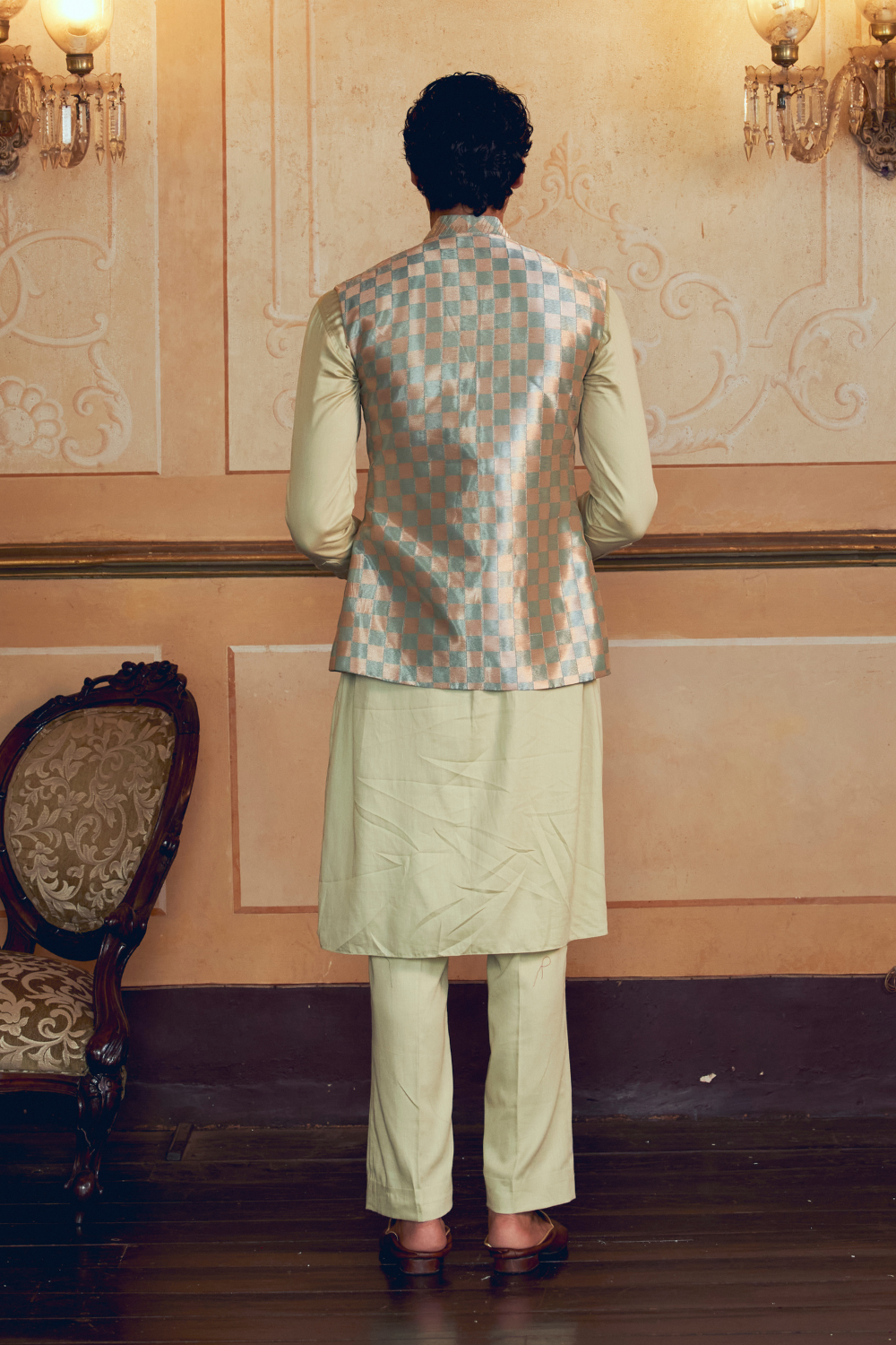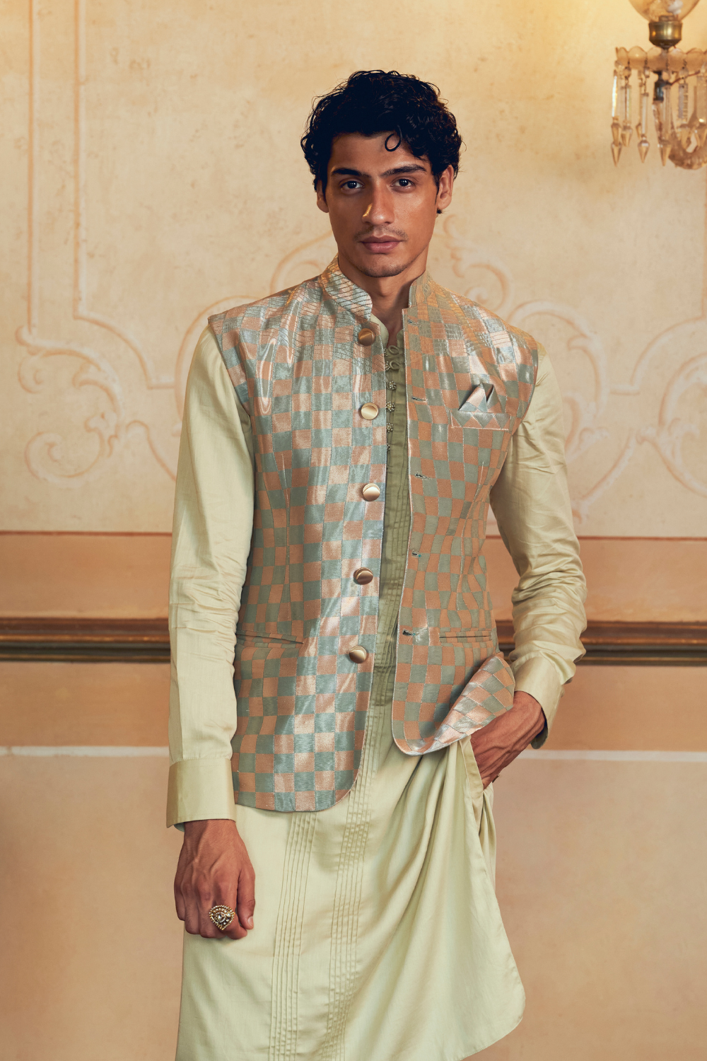 This classic Pearl Silver Checkered Jacquard Banarasi men's jacket set is adorned with semi precious meenakari buttons, is paired with a mint green silk cotton kurta and pants, blending opulence with refined simplicity.