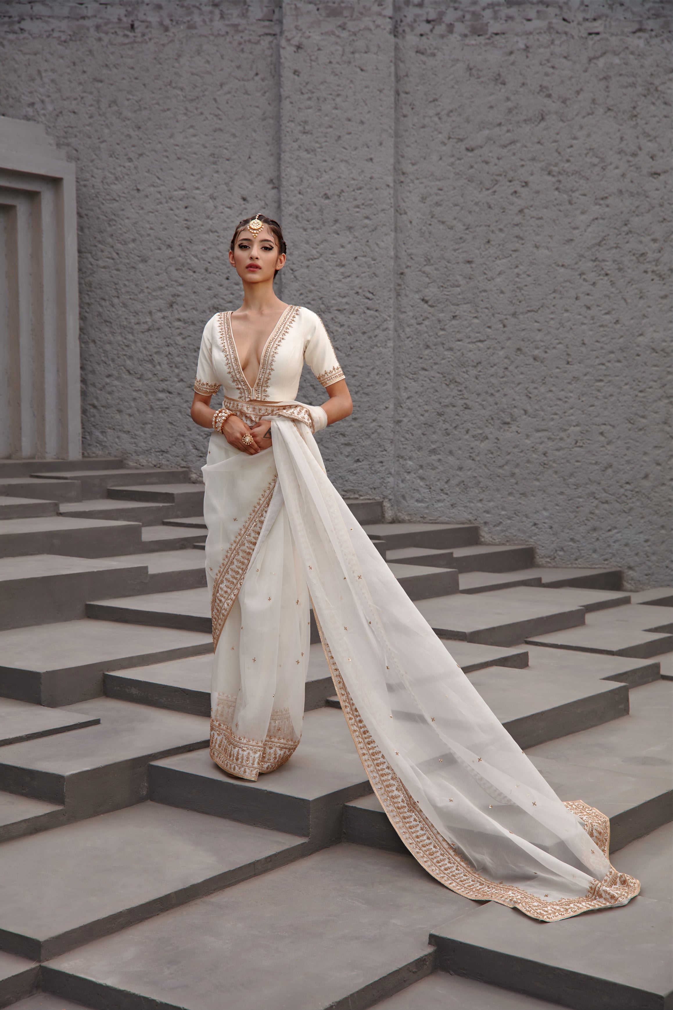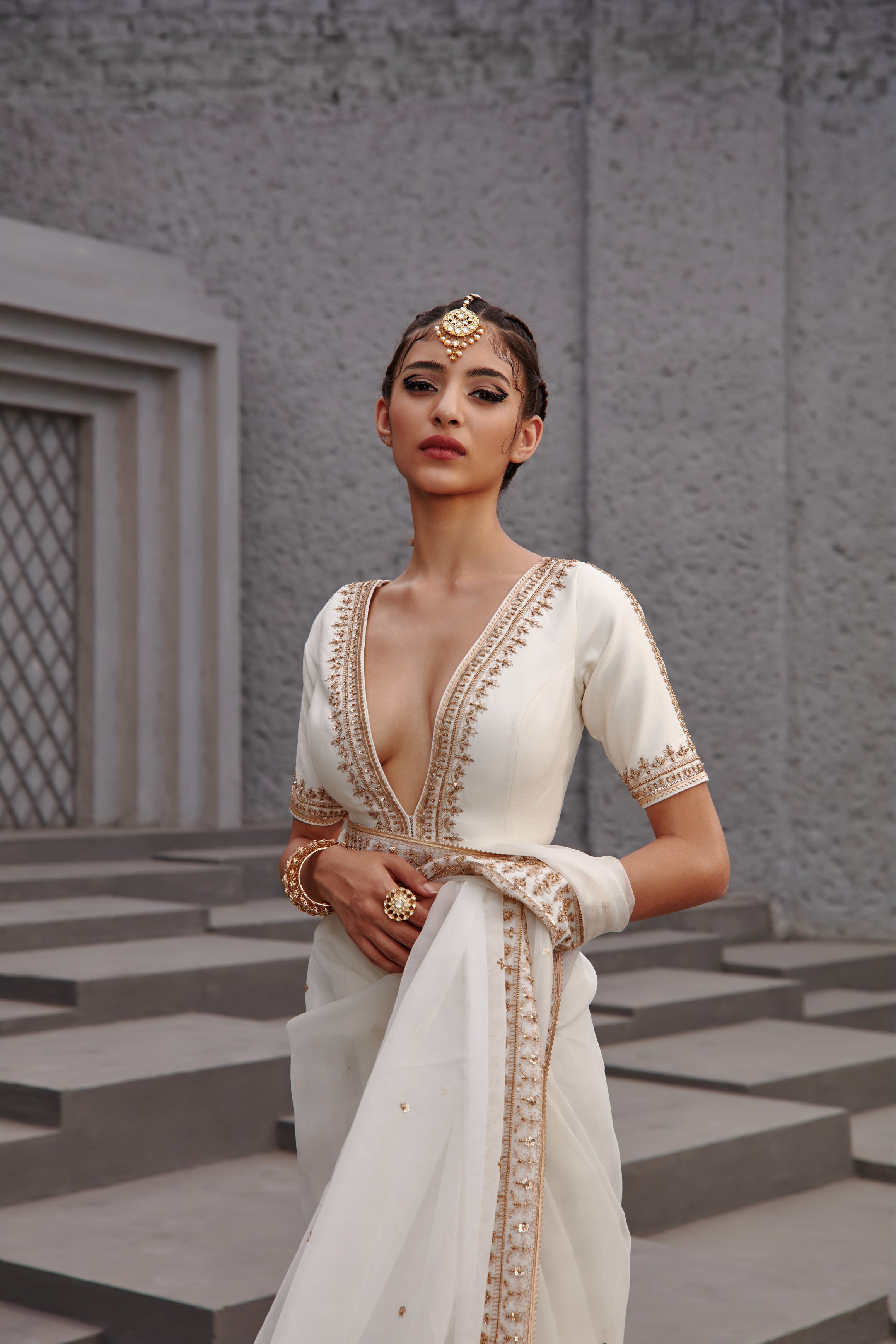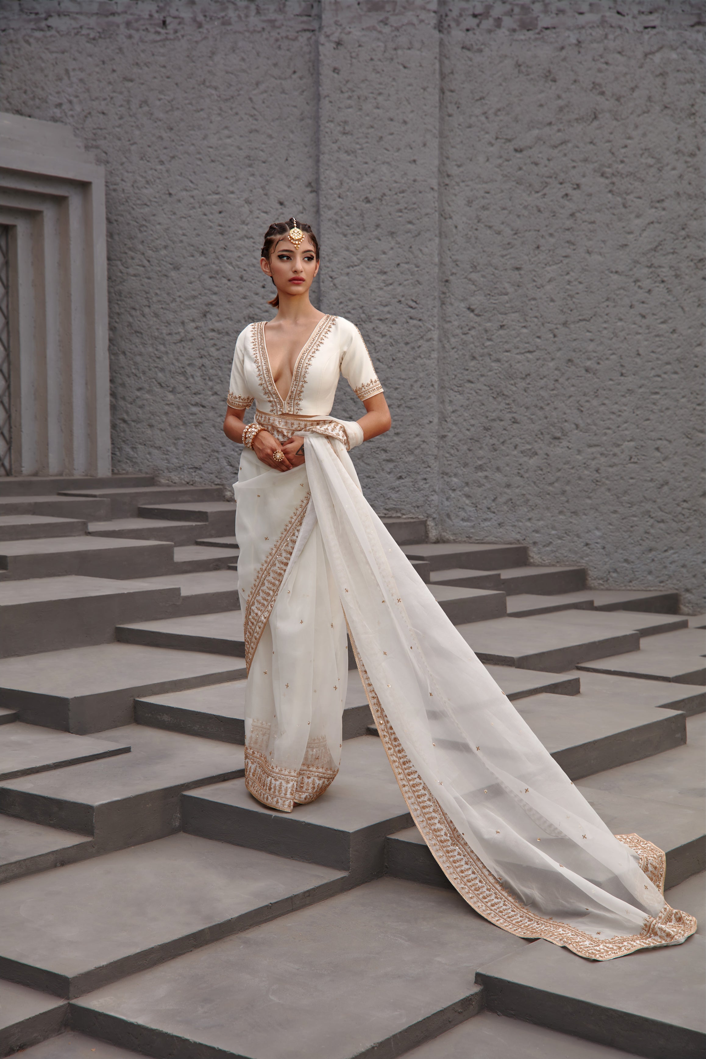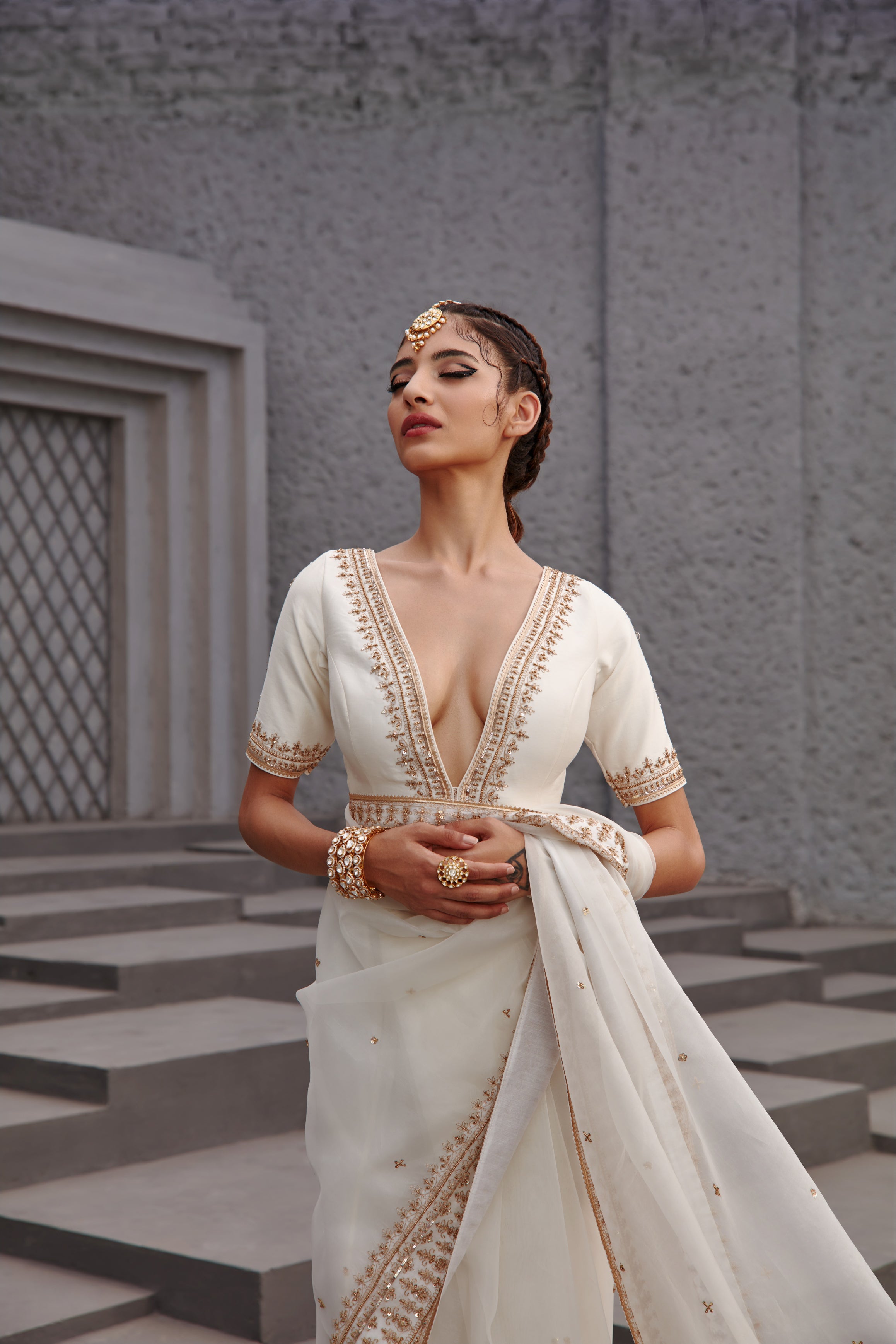 Featuring an organza base pearl white saree paired with a blouse in chanderi with light gold dori and aari work on it.