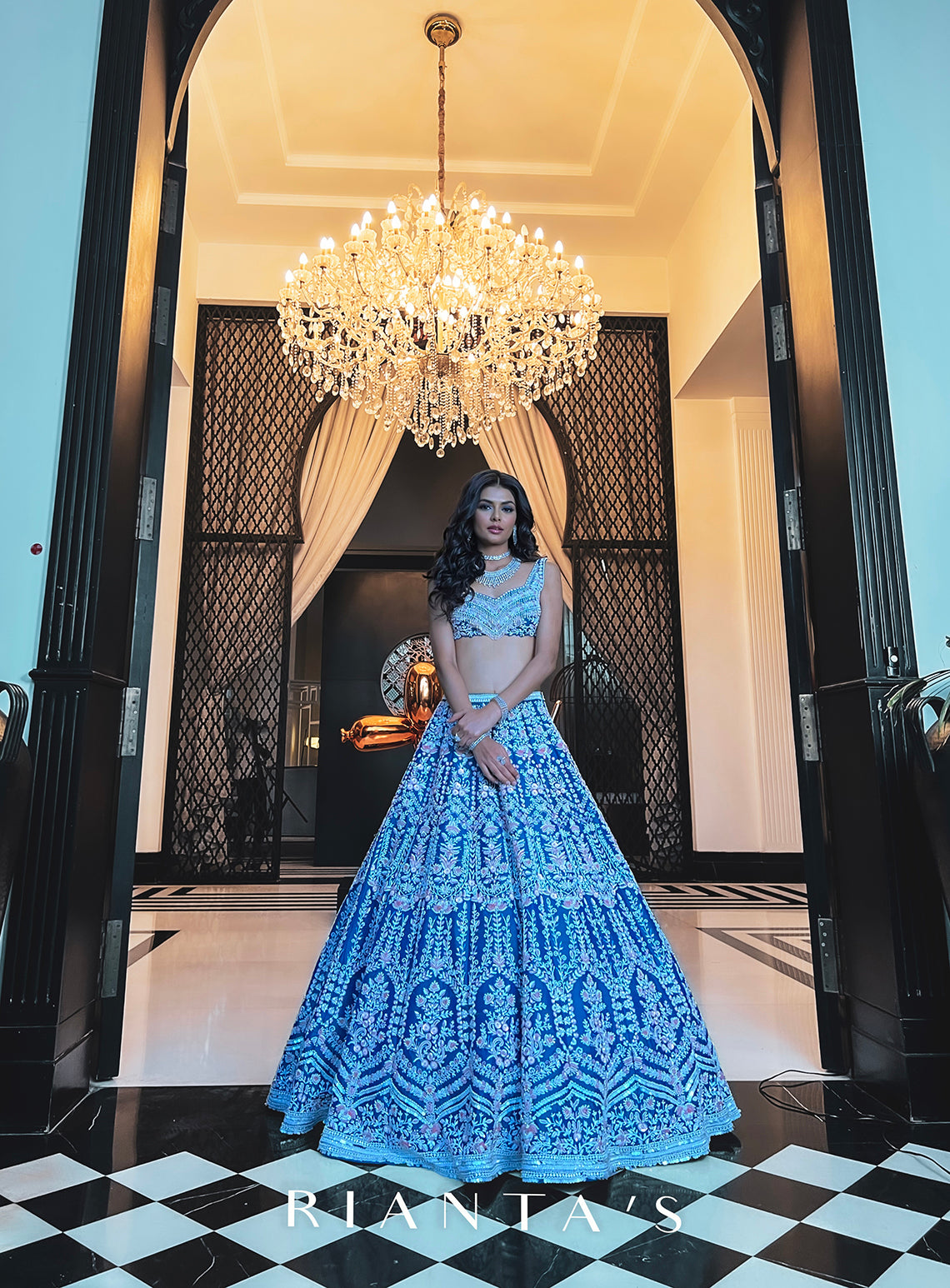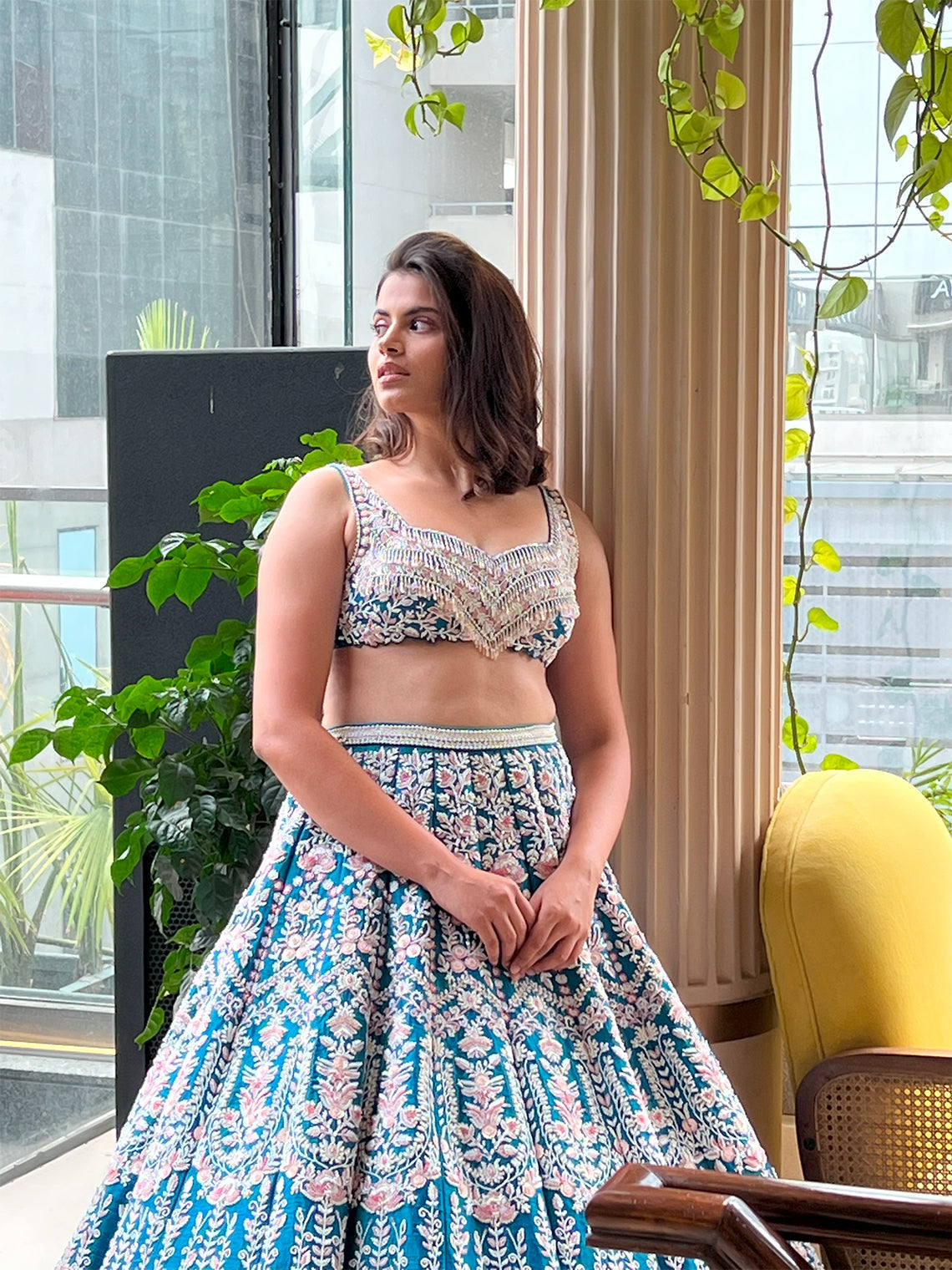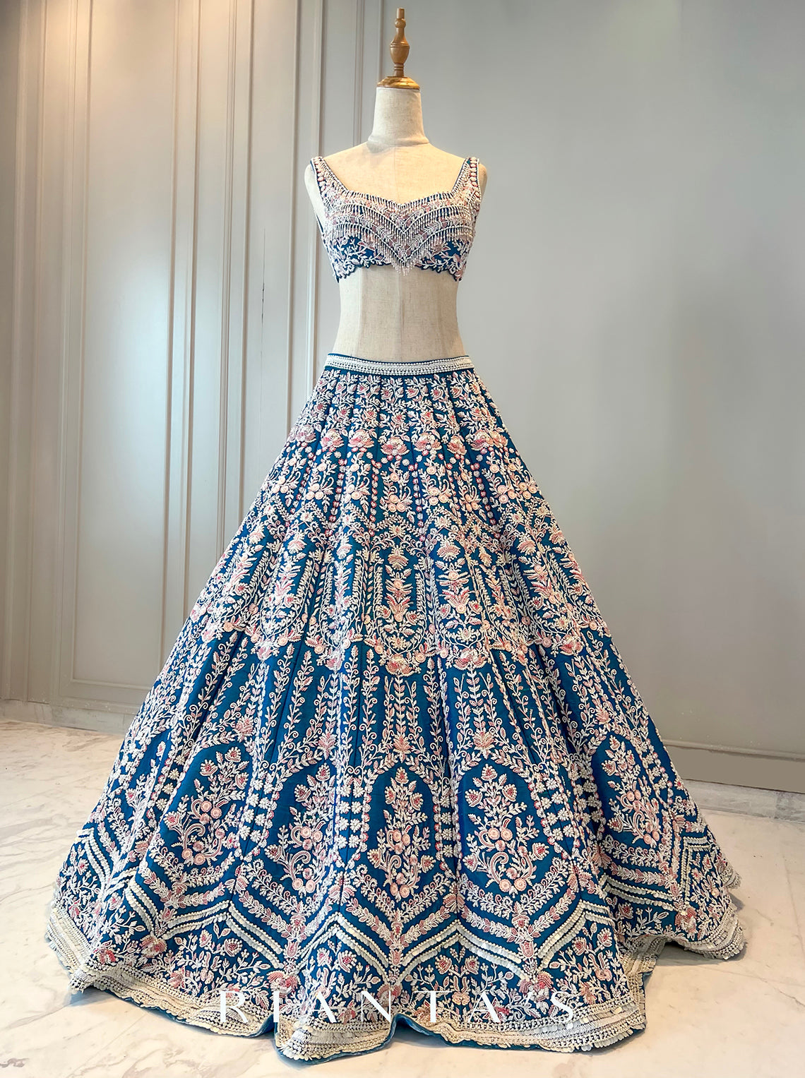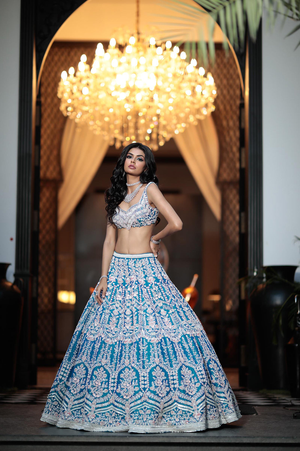 The Peony Lehenga set is a flamboyant ocean blue raw silk base Lehenga skirt with greyish blue net dupatta. And the top with intricate embroidery on ocean blue raw silk.