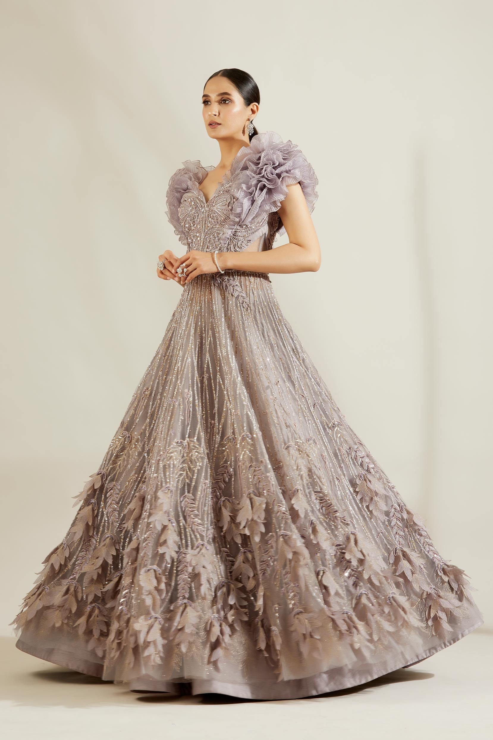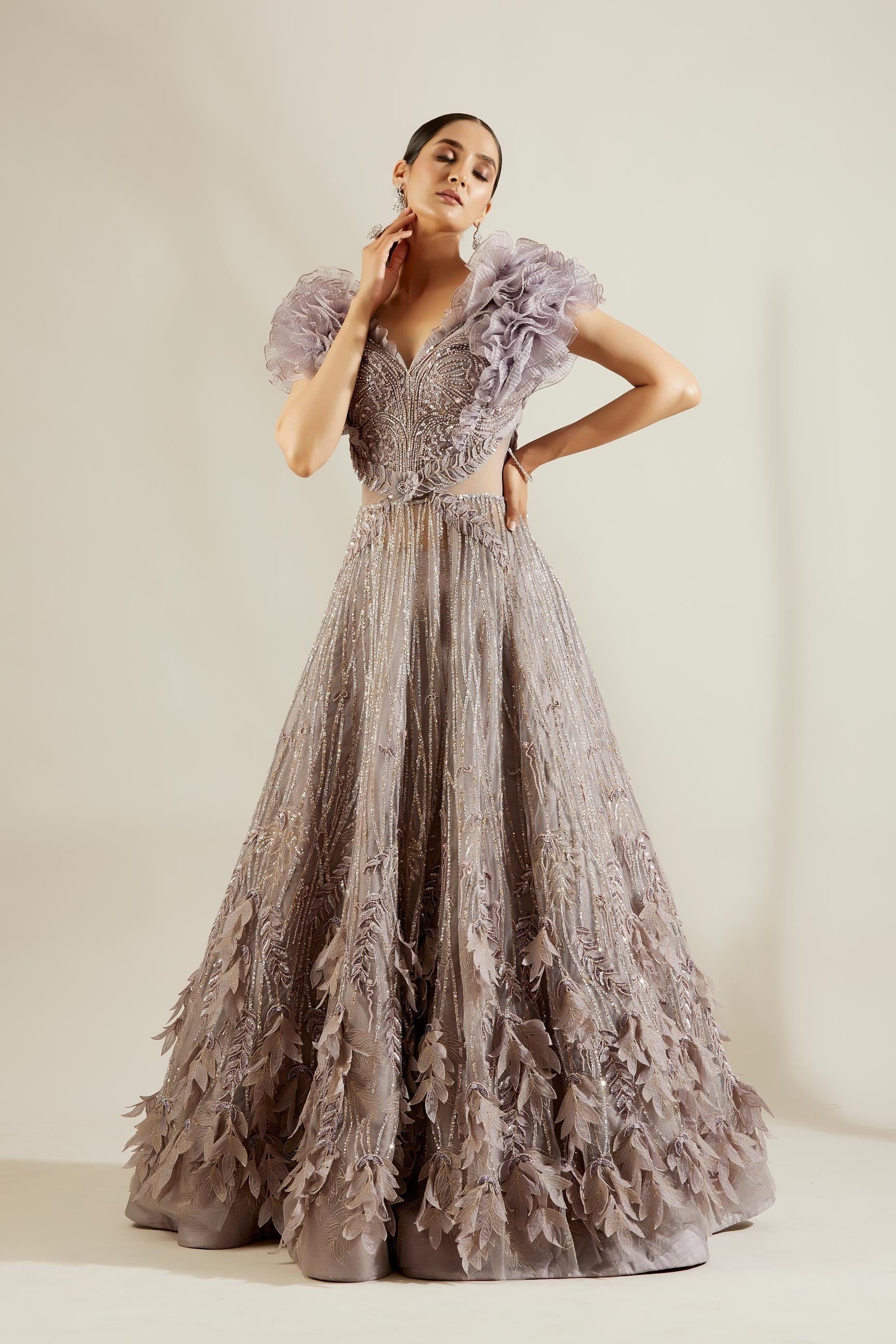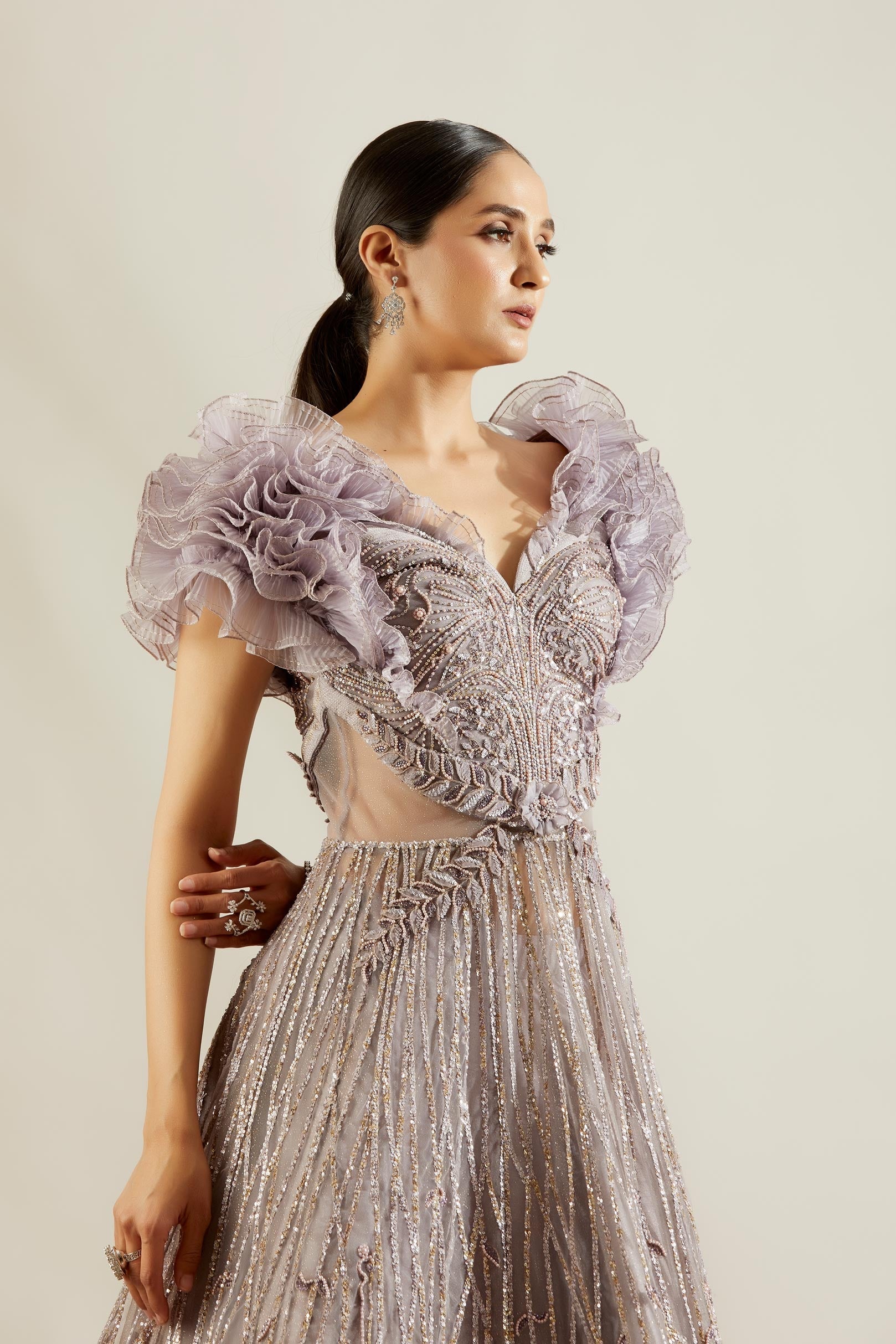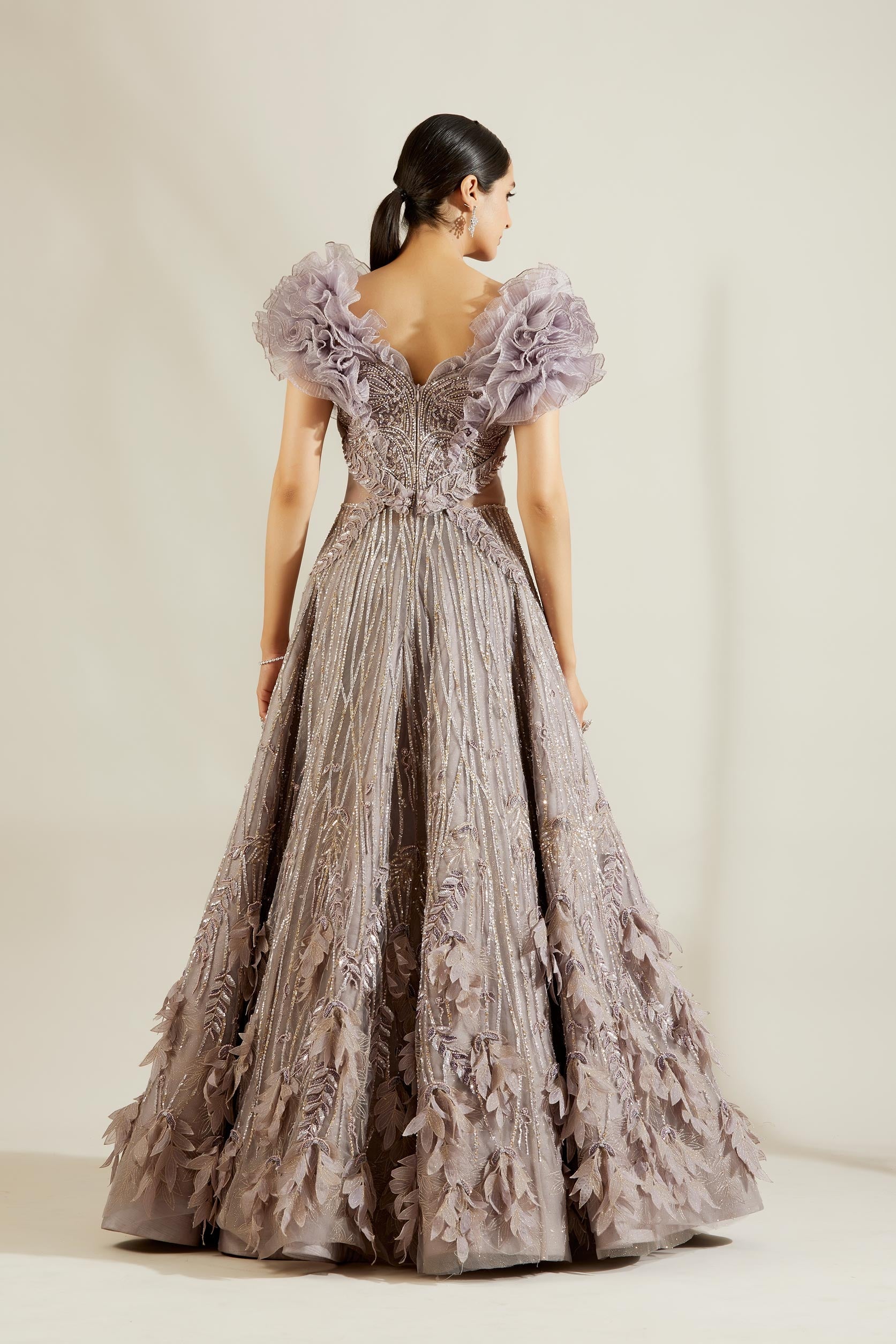 Periwinkle majestic gown with delicate neckline and volumisnous ruffle ,glided with 3d leaves and brush stoke placement embroidery