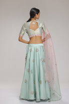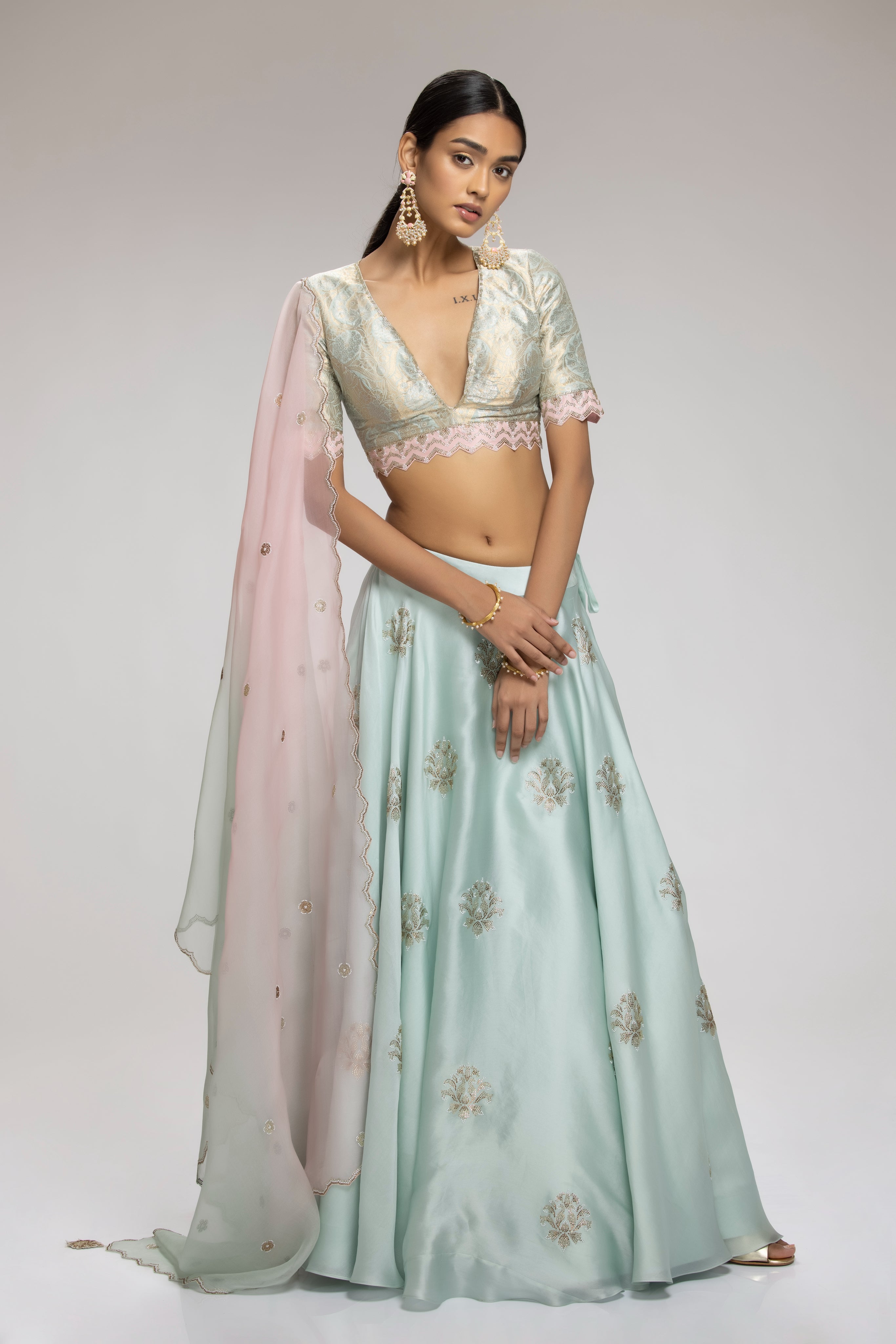 A mint organza lehenga, adorned with radiant rhinestones, exquisitely paired with a banarasi brocade blouse. Completing this ethereal ensemble is an embellished organza dupatta, creating a mesmerizing and captivating look that resonates with timeless beauty and opulence.