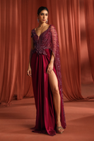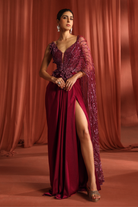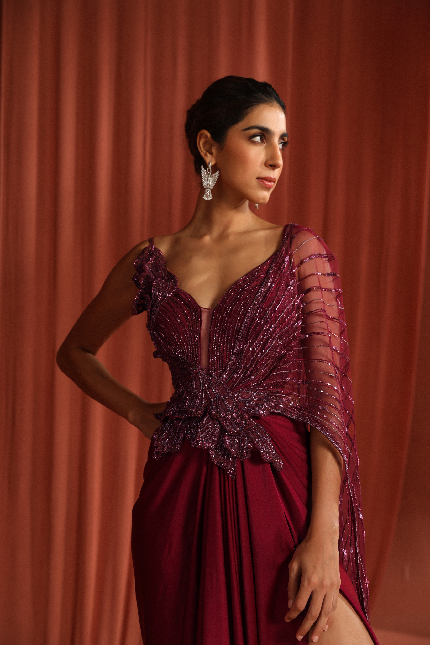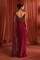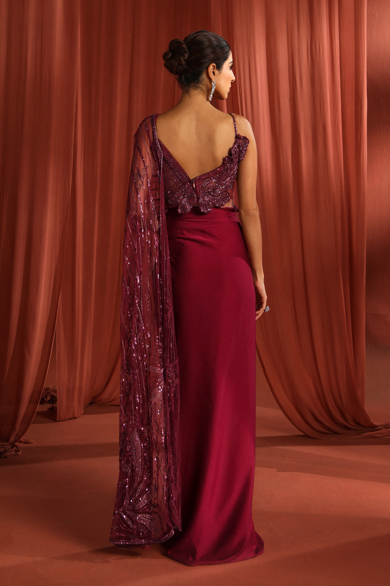 This dark raspberry saree features a modern blouse with a sleek silhouette and artistic 3D wings. The pallu is intricately embroidered with lines, petals, and wings, creating a striking, elegant look. A perfect blend of contemporary design and artistic flair.
