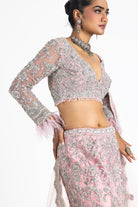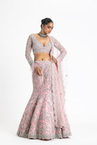 Pink Net Fishtailed Lehenga Set With A Long-Sleeved Choli And Dupatta Embroidered With Silver Zari, Dabka, Sequins, And Crystals.