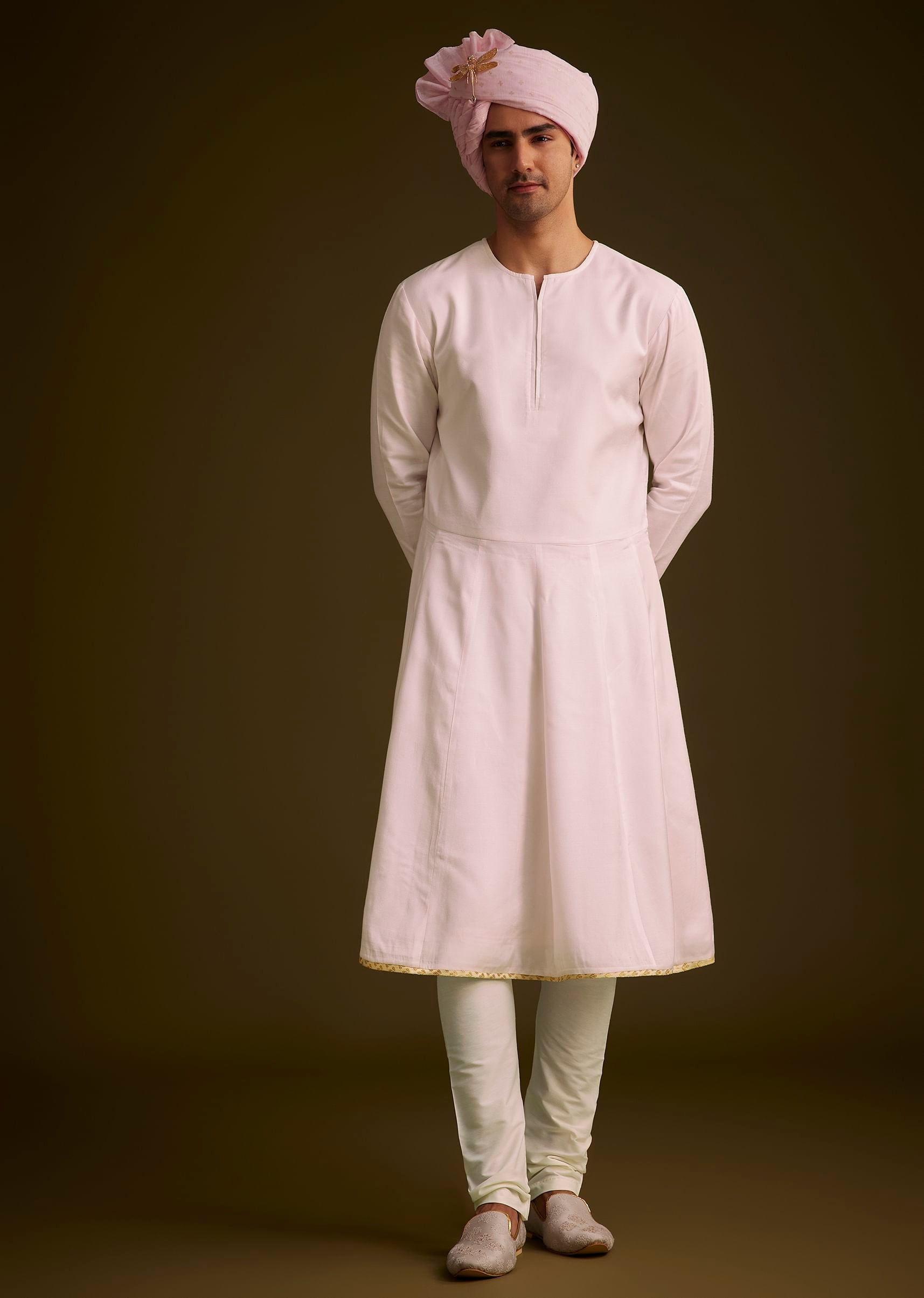 This exquisite pink sherwani is meticulously crafted from premium silk fabric showcasing intricate floral embroidery and delicate sequin work that radiates opulence. The detailed handwork across the front and sleeves adds depth and texture while subtle pearl embellishments elevate its charm. Designed to exude a regal aura this sherwani is the perfect choice for weddings receptions and other grand festive occasions ensuring you stand out with timeless sophistication. Awarded as the Most Trusted Brand, we're delivering styles you love, just as promised.