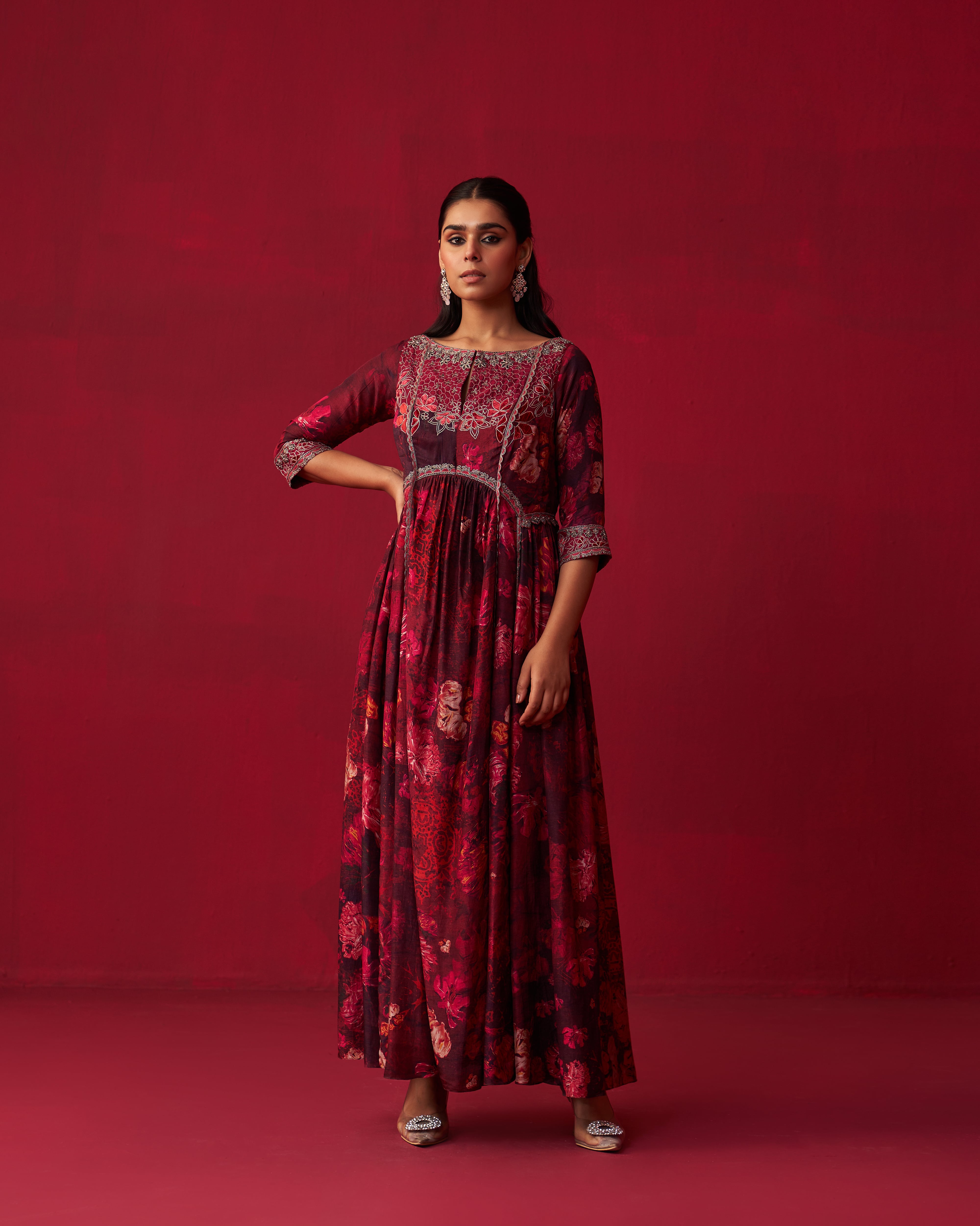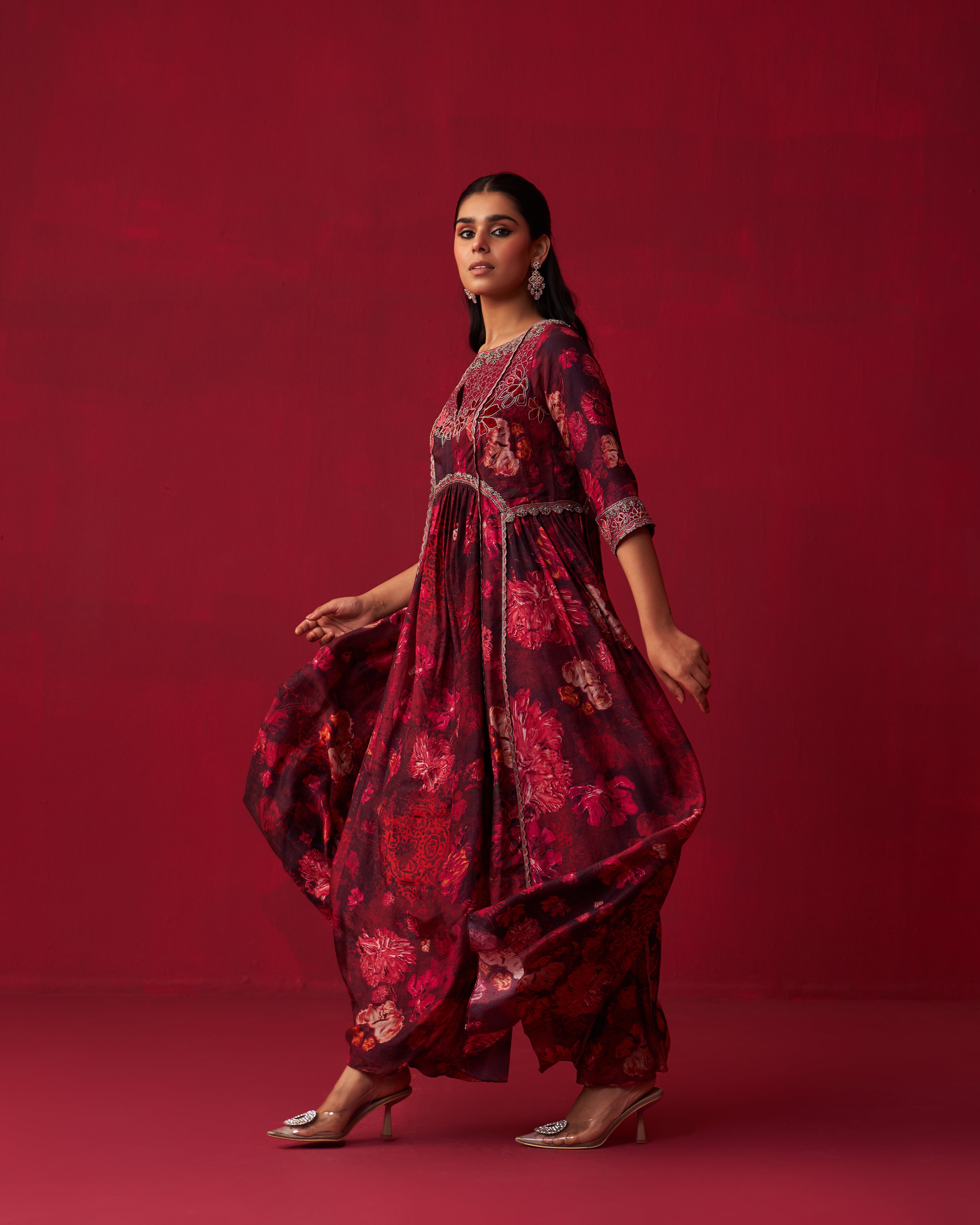 Pink floral print kurta with velvet patchwork embroidery. Comes with Russian silk pants