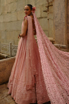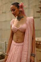 Pink net lehenga set featuring delicate thread work and shimmering sequins.Comes with an optional add-on veil for a graceful finish.