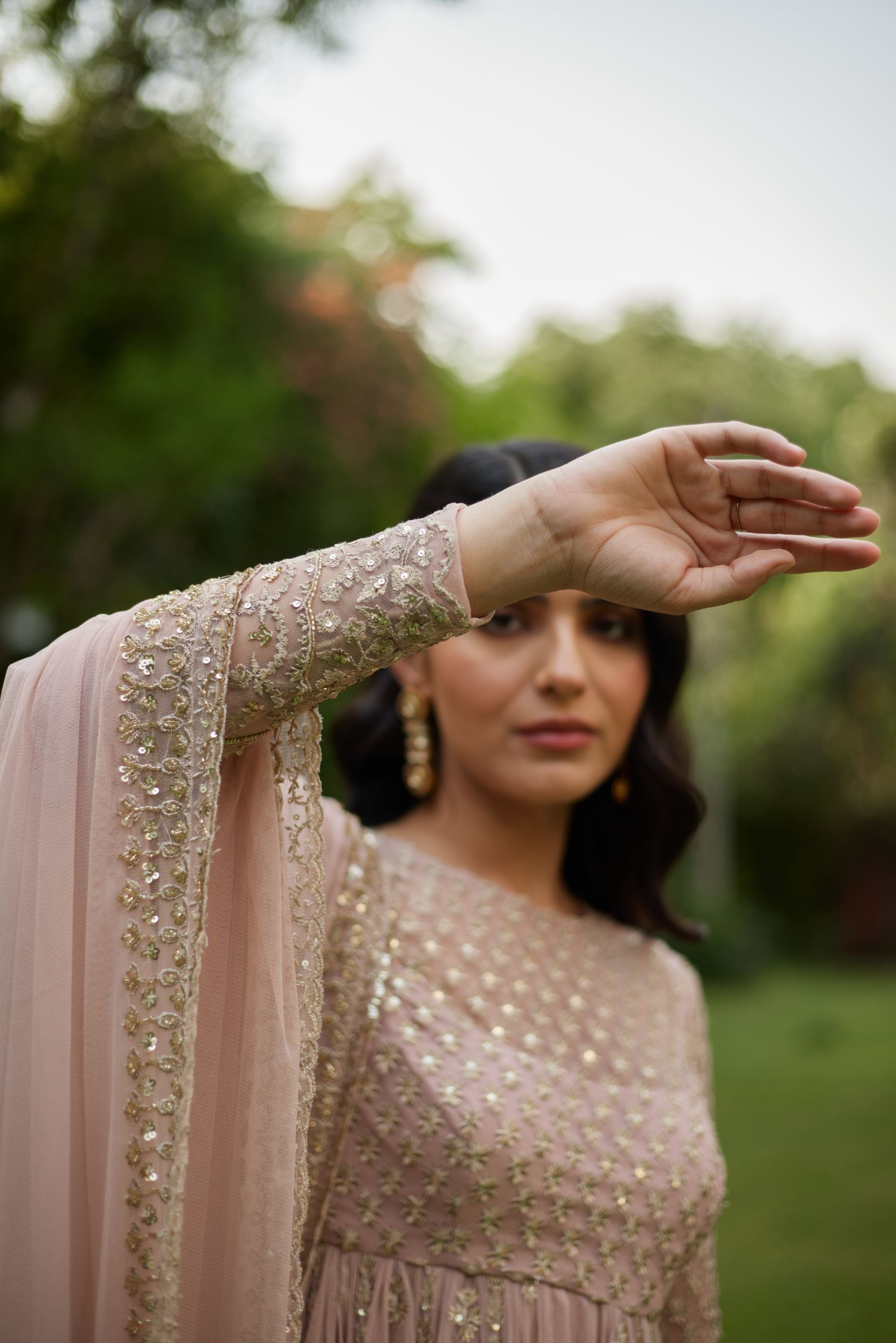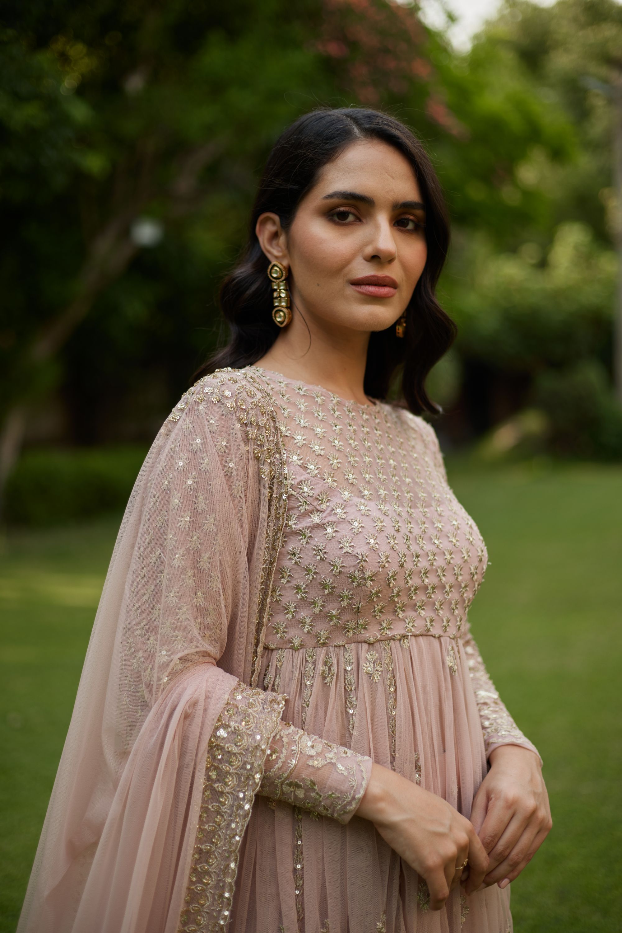 Featuring a Pink on Pink Threadwork Anarkali set in Net.