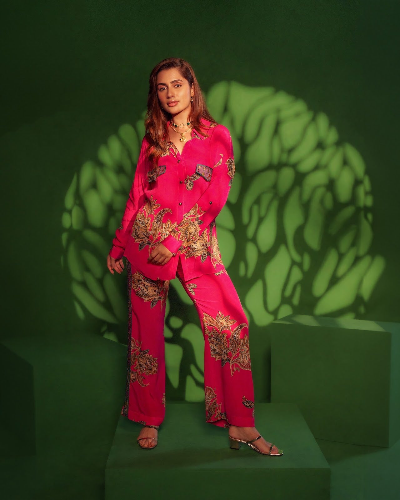 Pink printed chic co-ord set featuring delicate handwork on pockets .