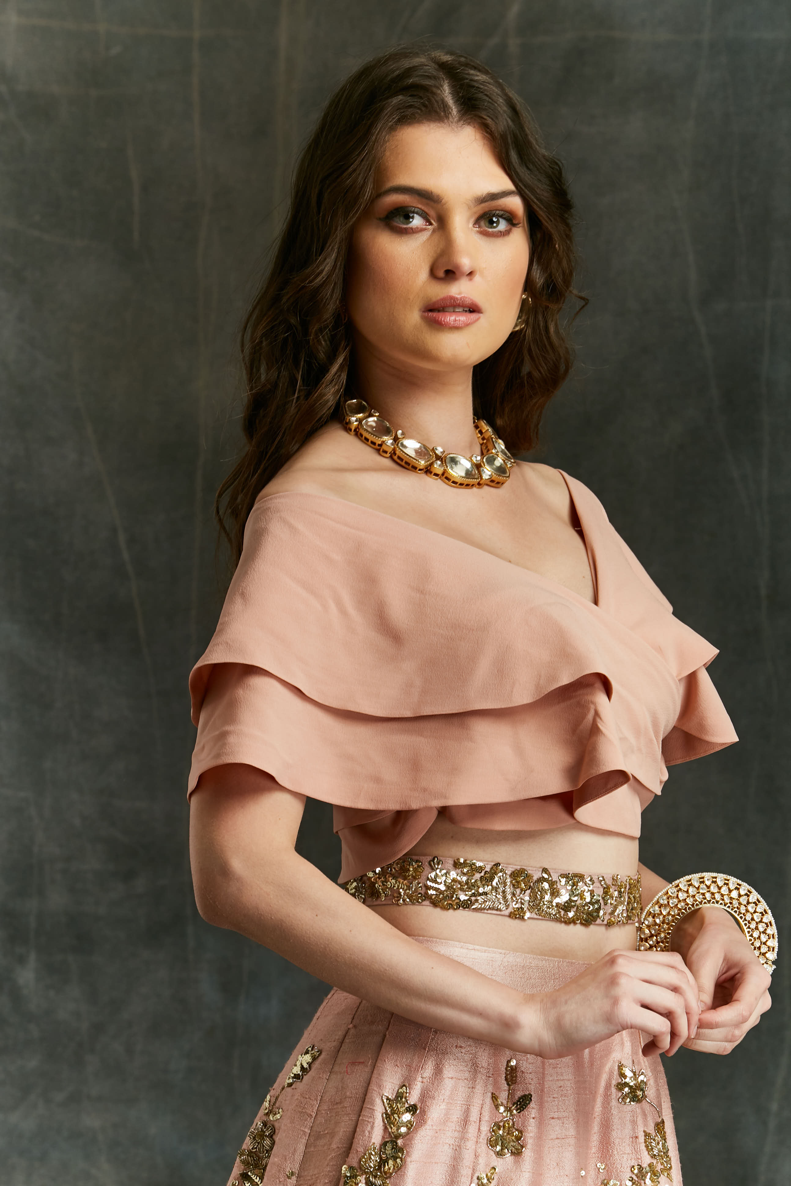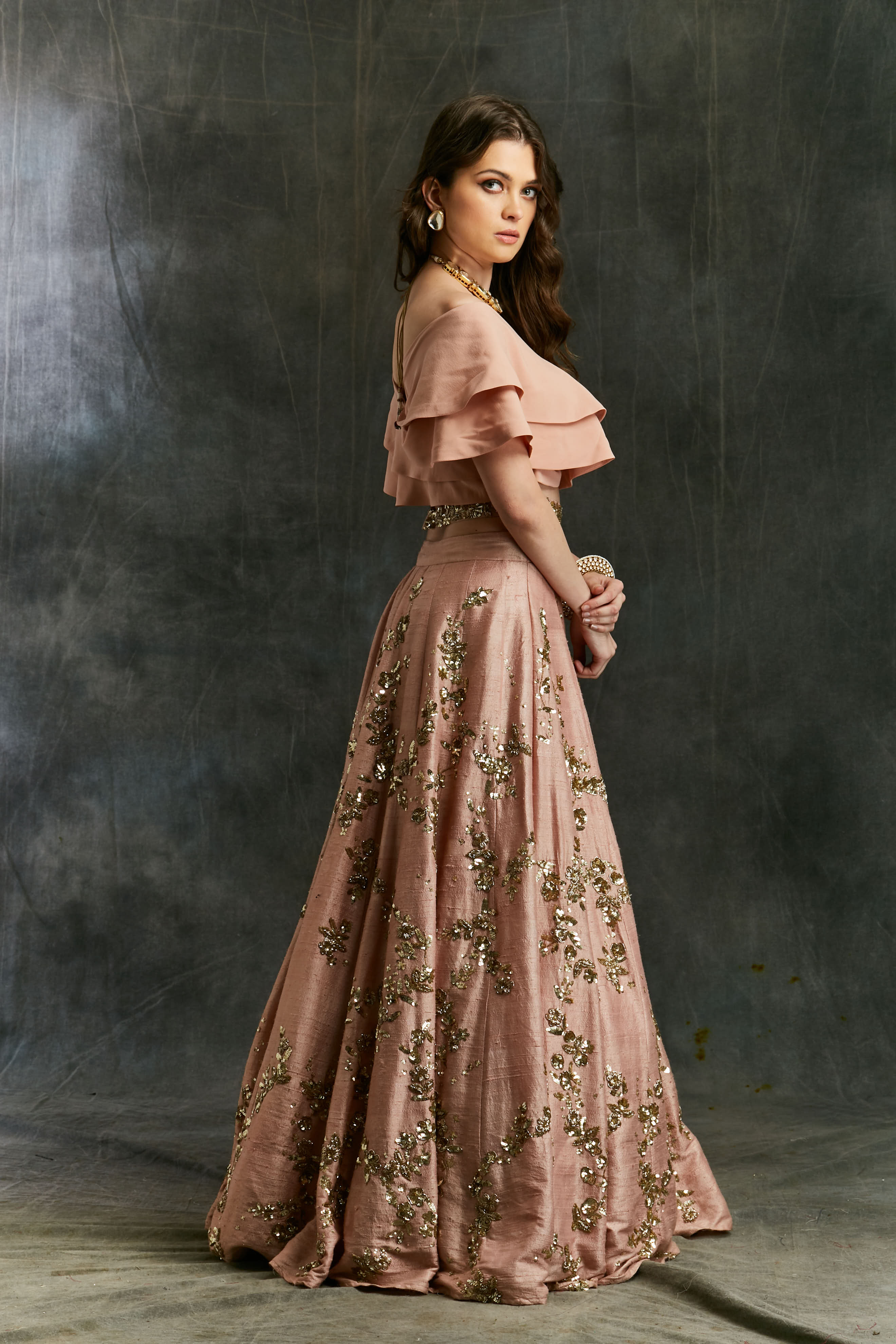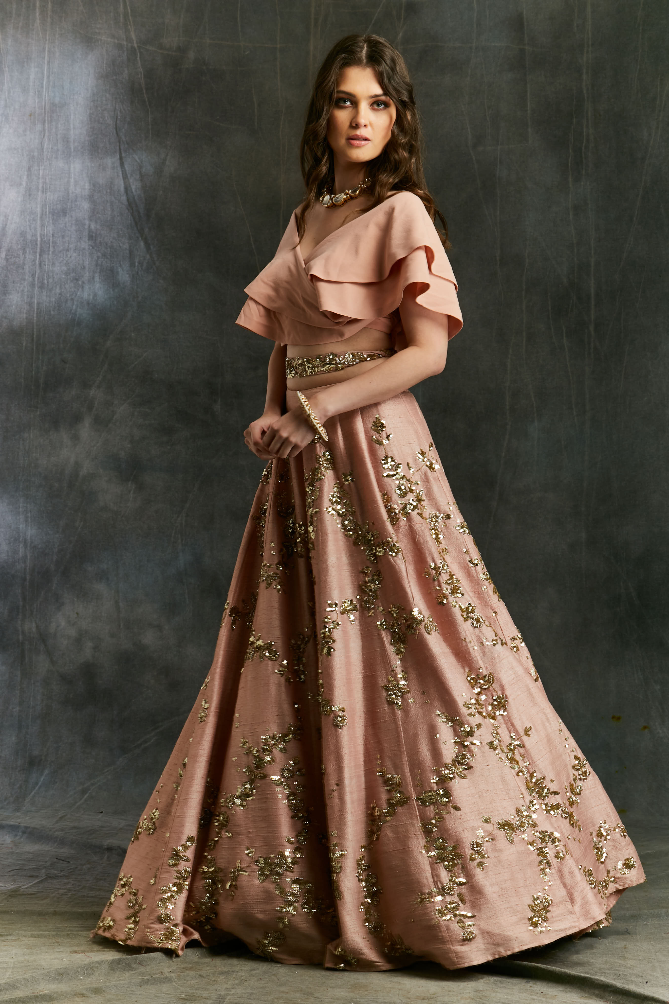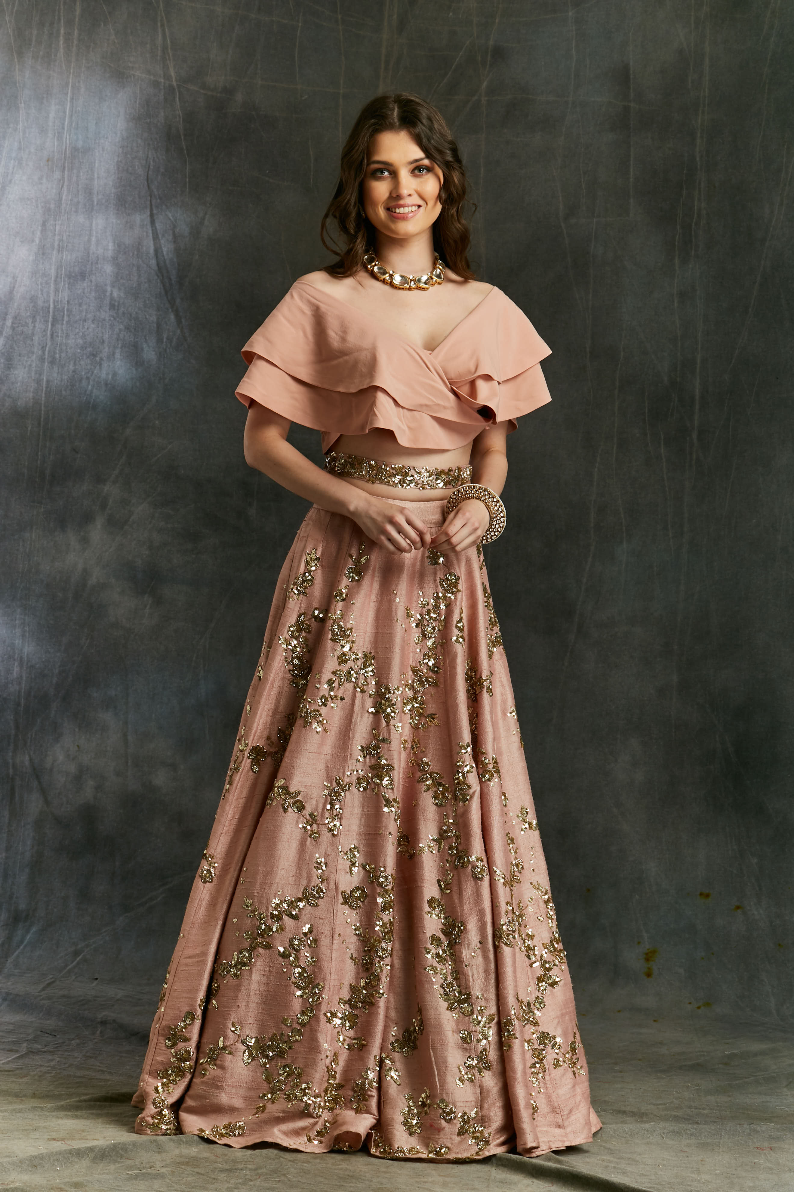 Featuring a PINK SEQUIN JAAL LEHENGA WITH FRILL BLOUSE IN RAW SILK.