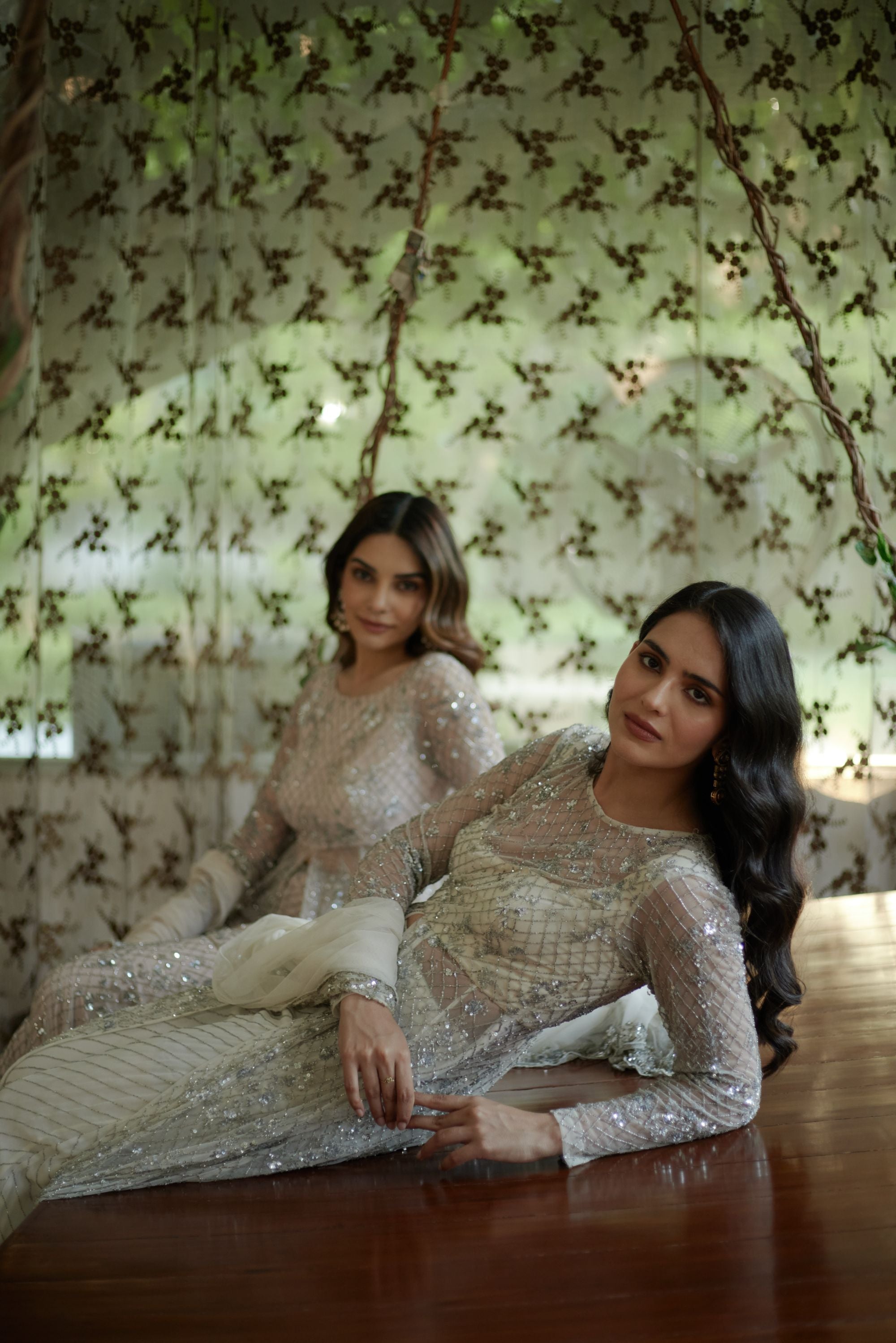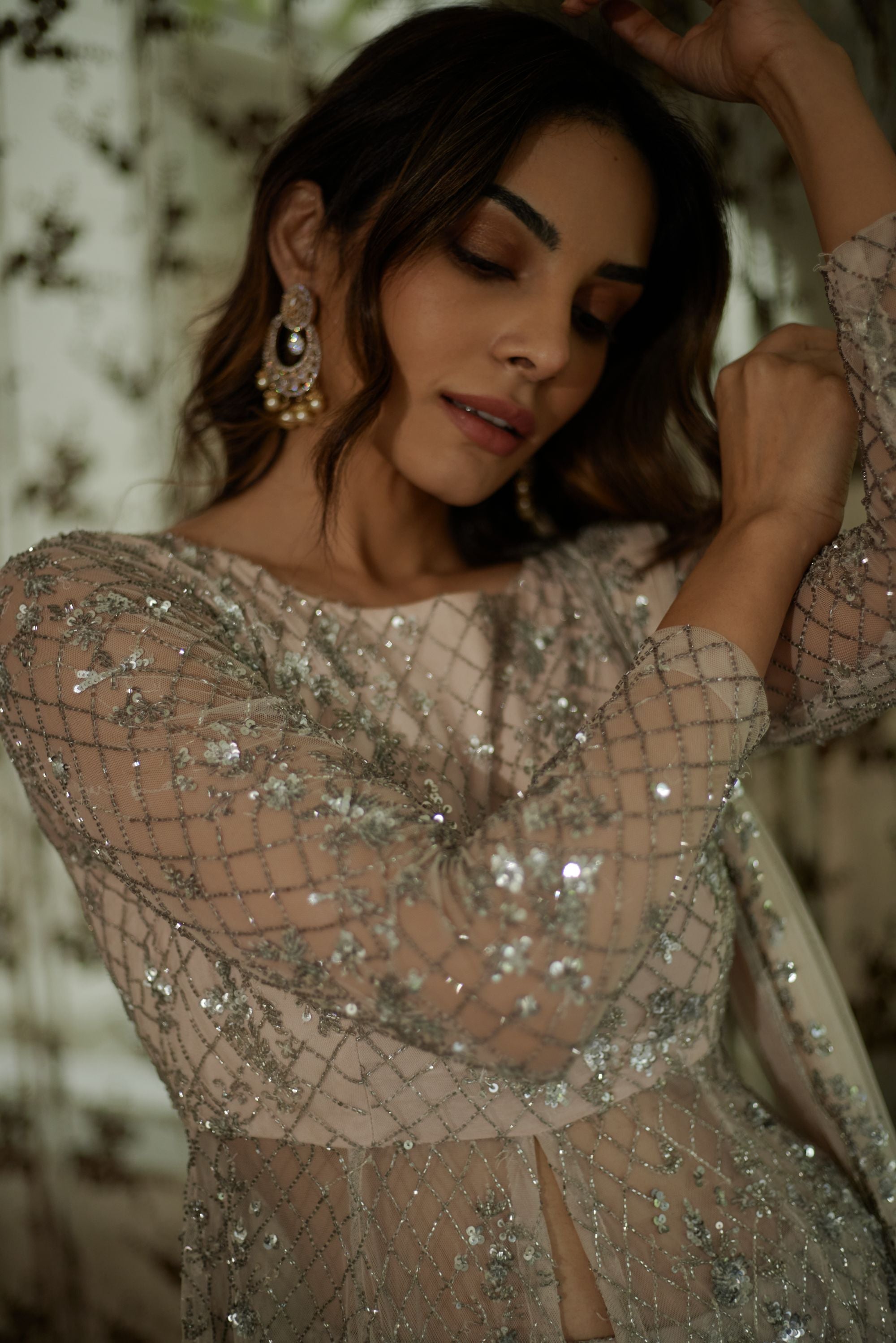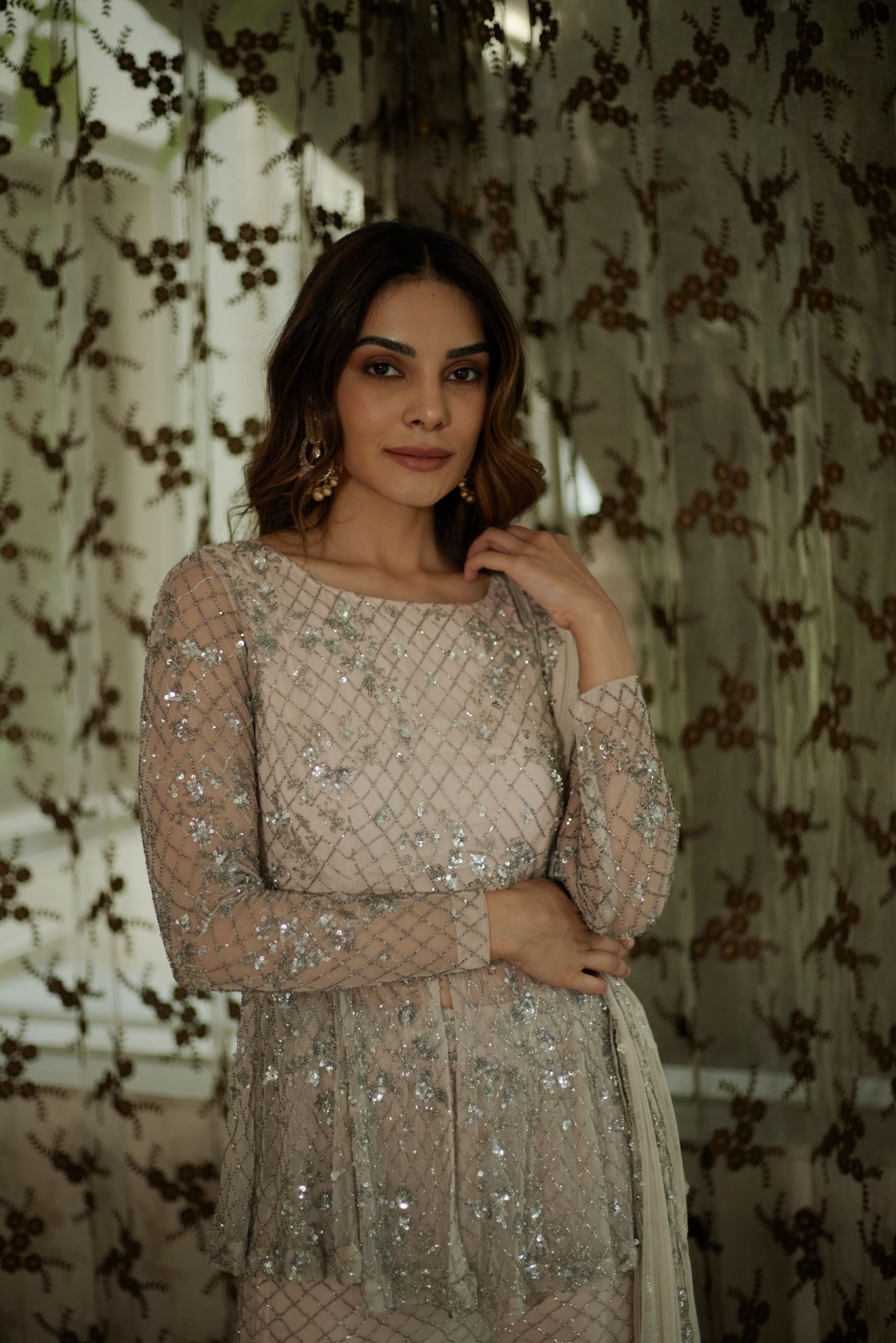 Featuring a Pink with Silver Sequence work Peplum and Pants set in Net.
