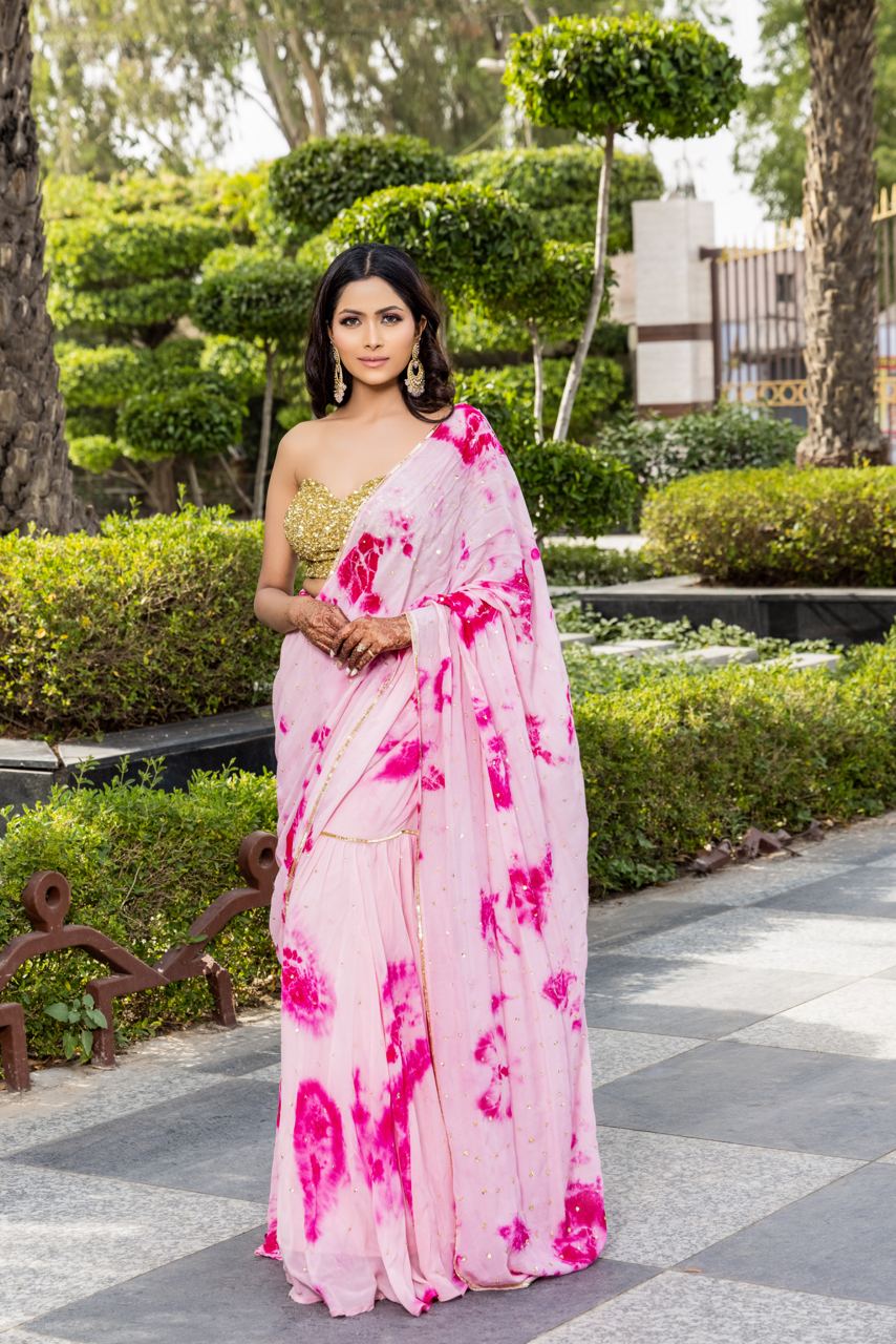 Pinky -Tie and dye garara saree with gold sequin blouse