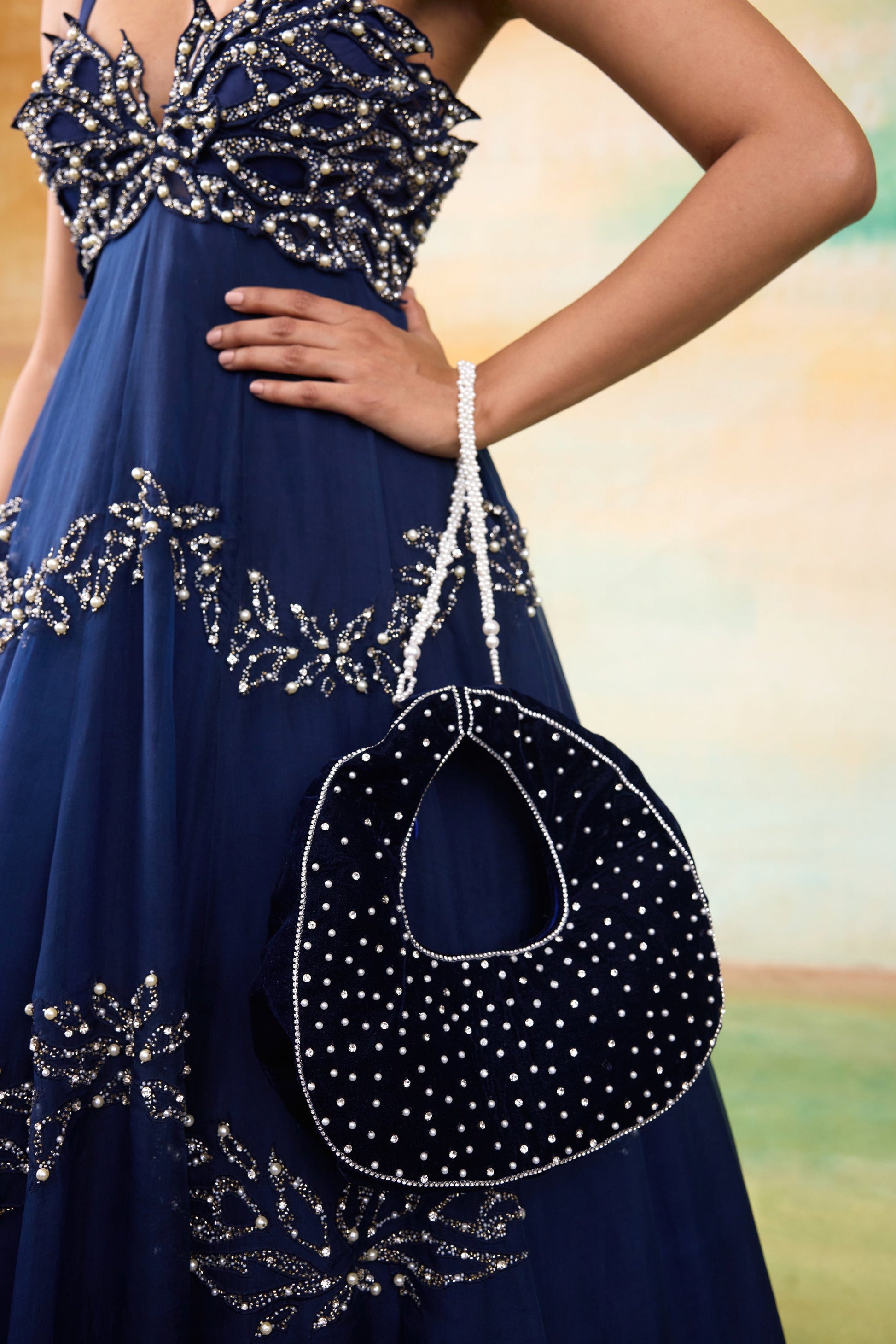 A sleek midnight blue bag adorned with a hand embroidered polka dot pattern of shimmering stones and pearls. With its minimalistic design and pearl strap, this