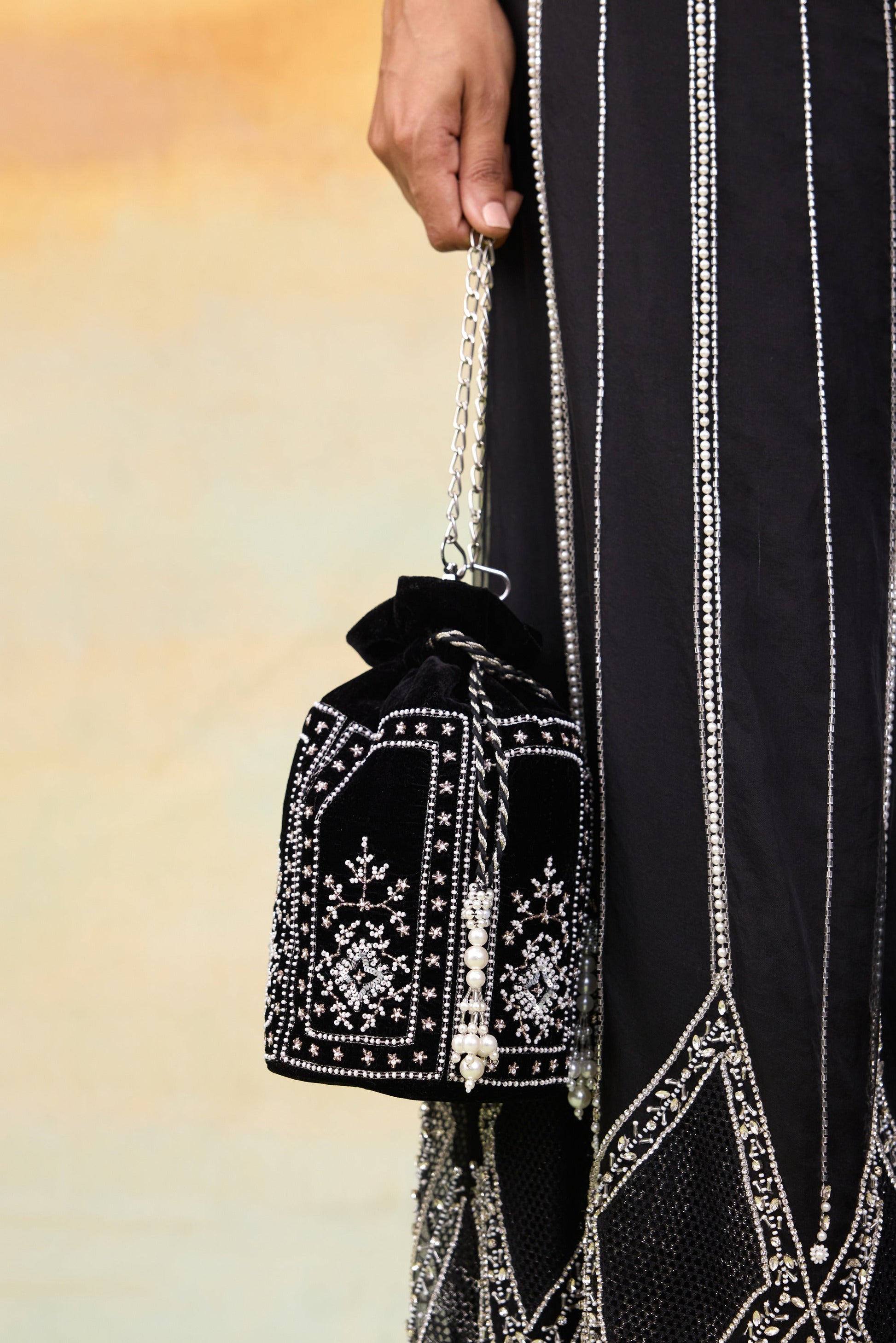 A stunning black structured potli bag adorned with intricate white bead embroidery and golden zari work. Featuring elegant black and silver twisted dori accents , complemented by delicate pearl tassels and a sleek silver chain strap , this accessory perfectly blends with sophistication and charm.