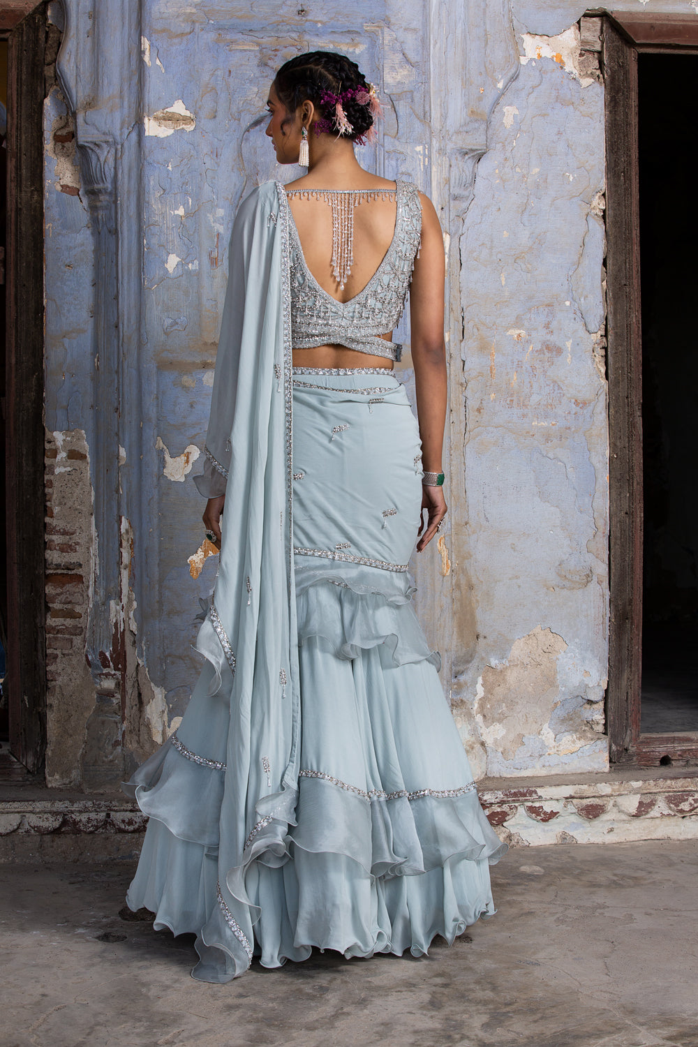Powder Blue shimmer georgette draped saree with organza blouse and frills with self and silver beadwork and crystal embroidery.