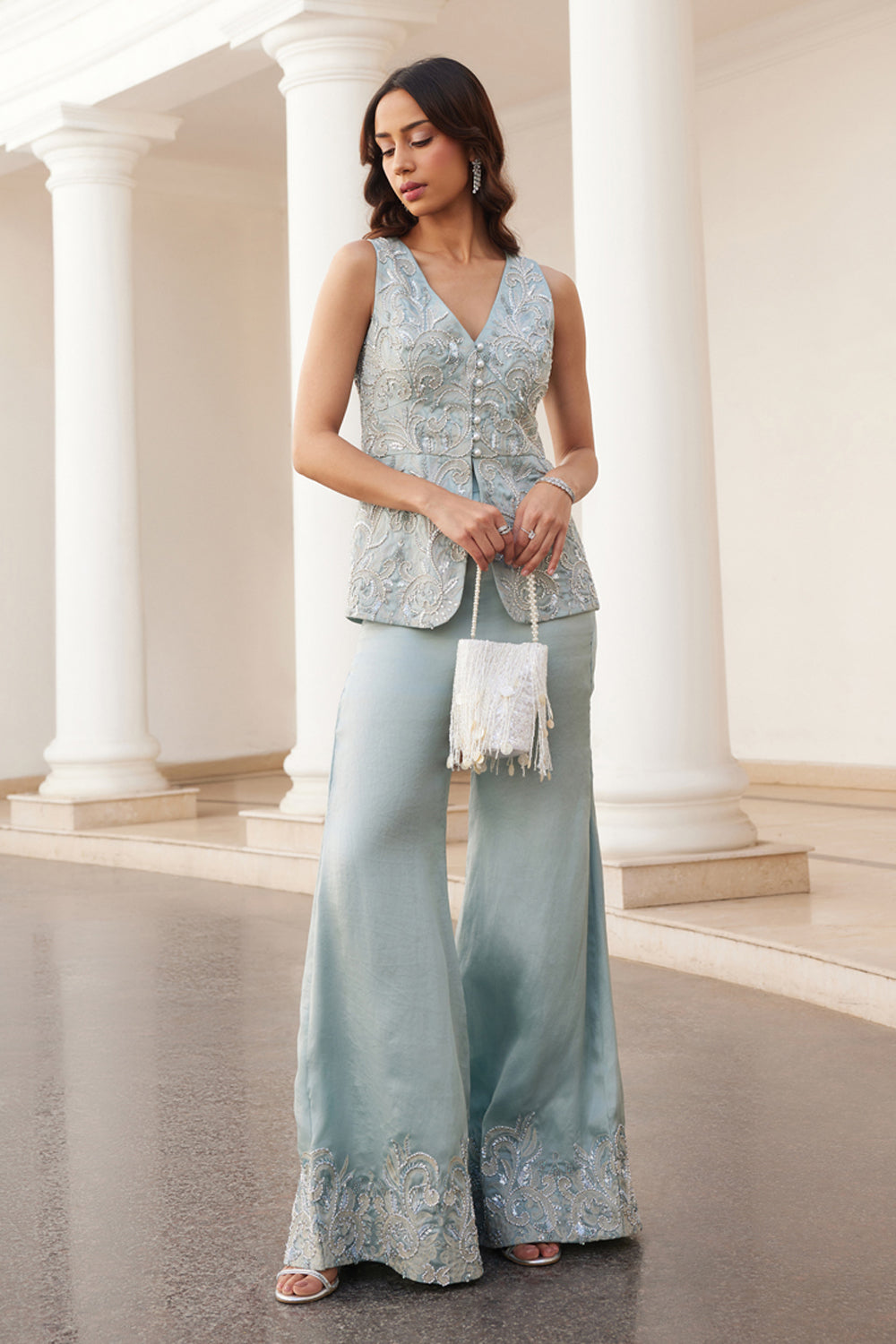 Powder blue waist-coat inspired peplum with zari embroidery highlighted with sequins, and pearls. It is paired with a organza pants with matching embroidery at the hem.