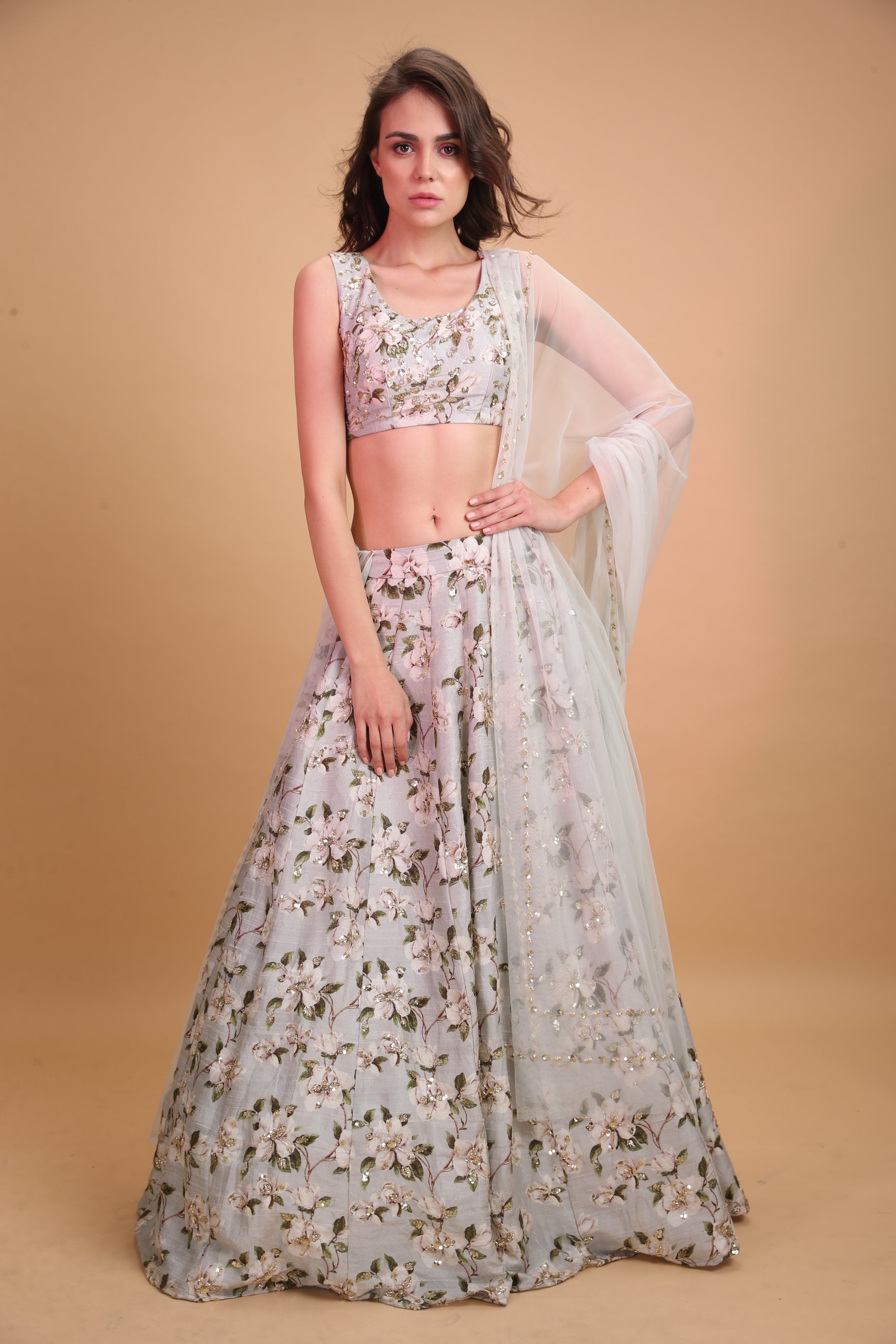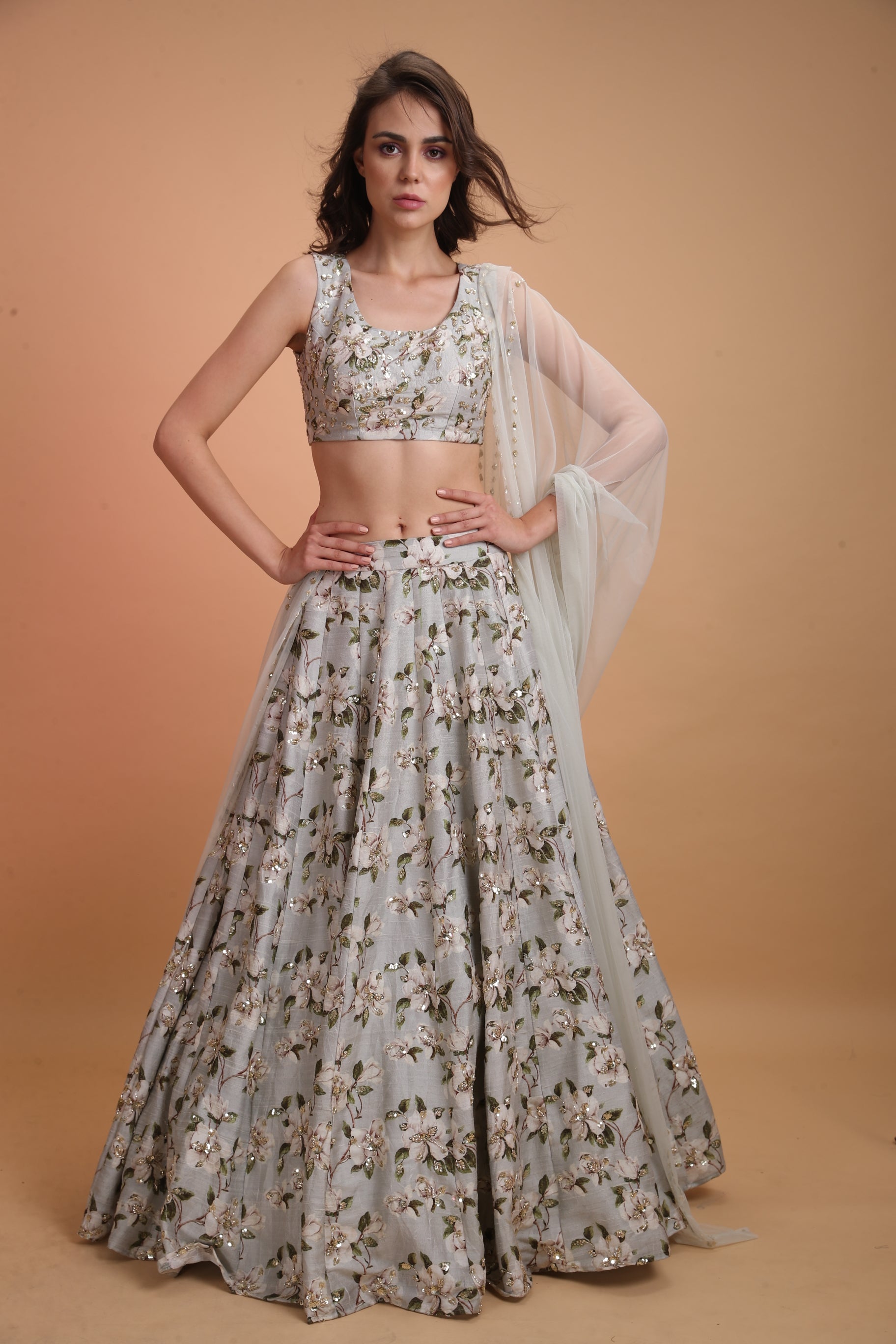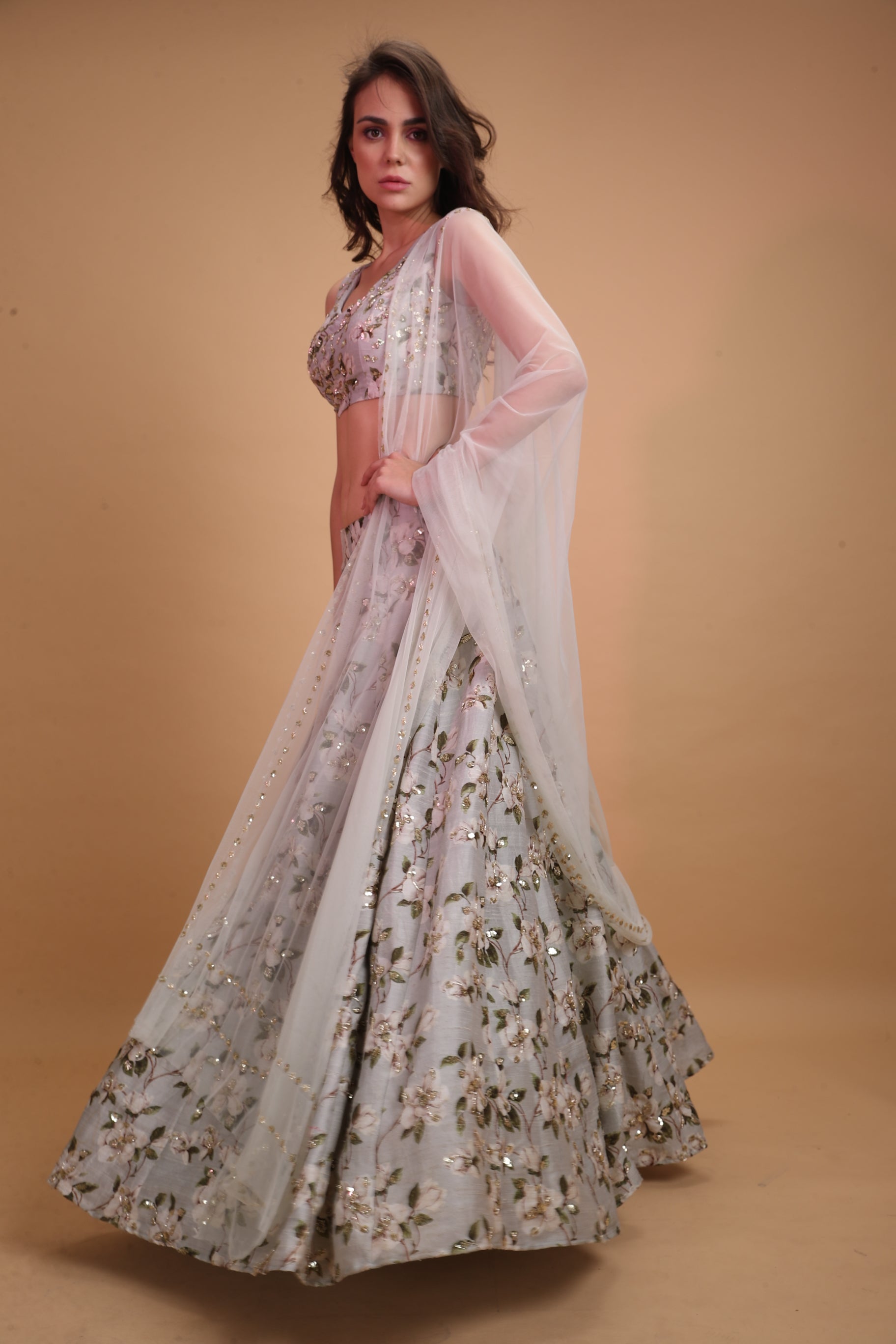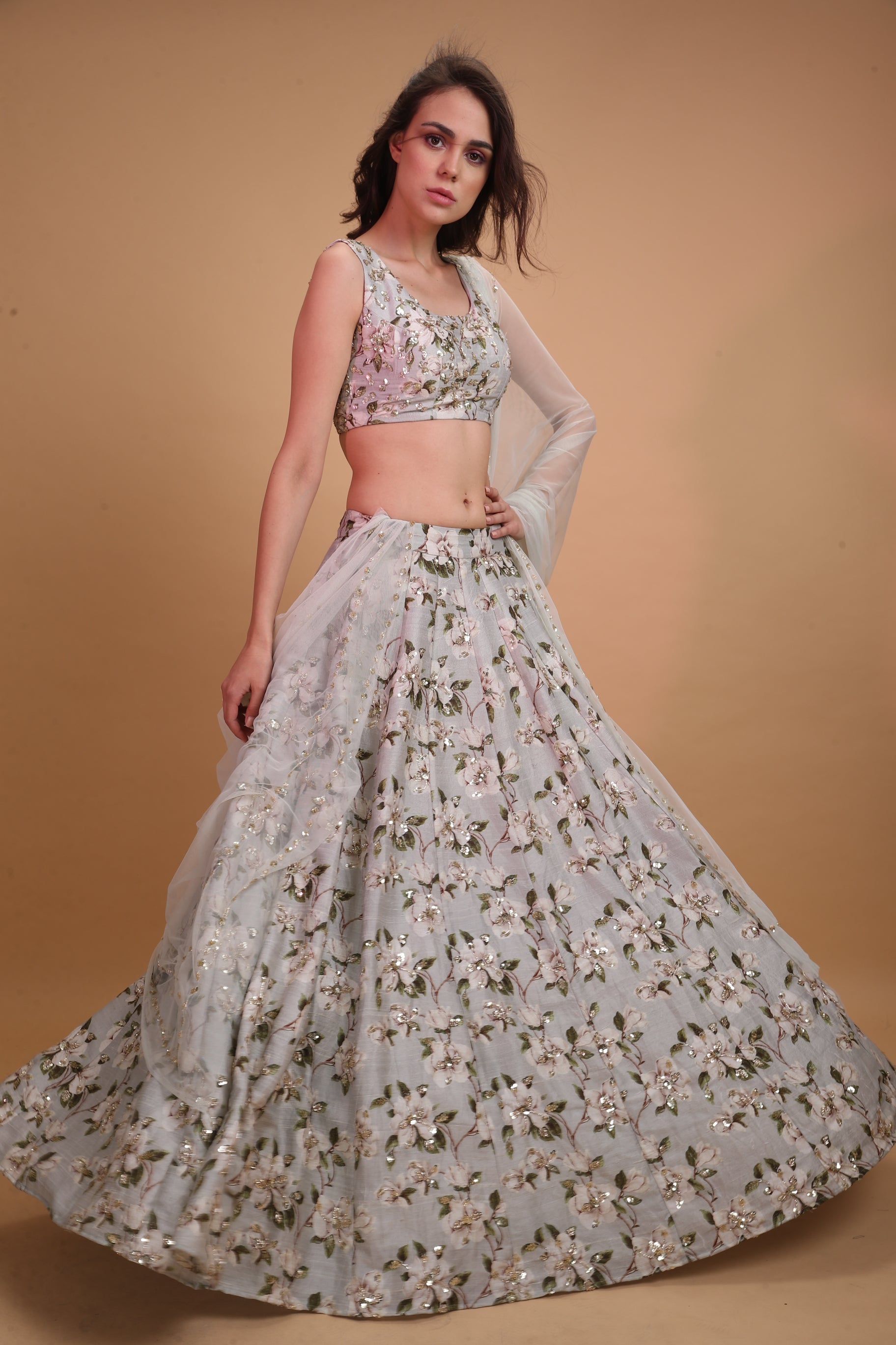 Featuring a POWDER BLUE RAW SILK PRINTED LEHENGA SET IN RAW SILK.