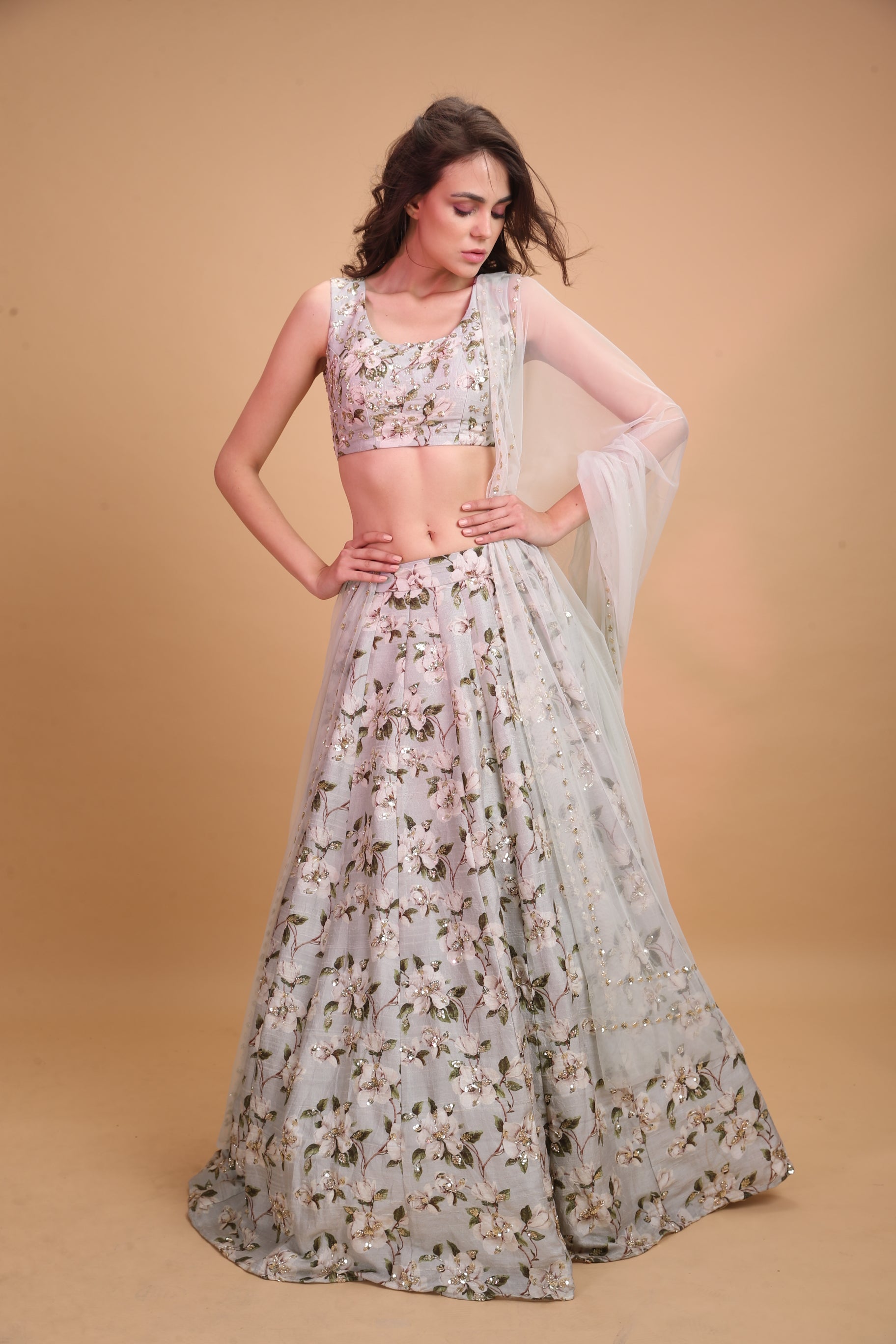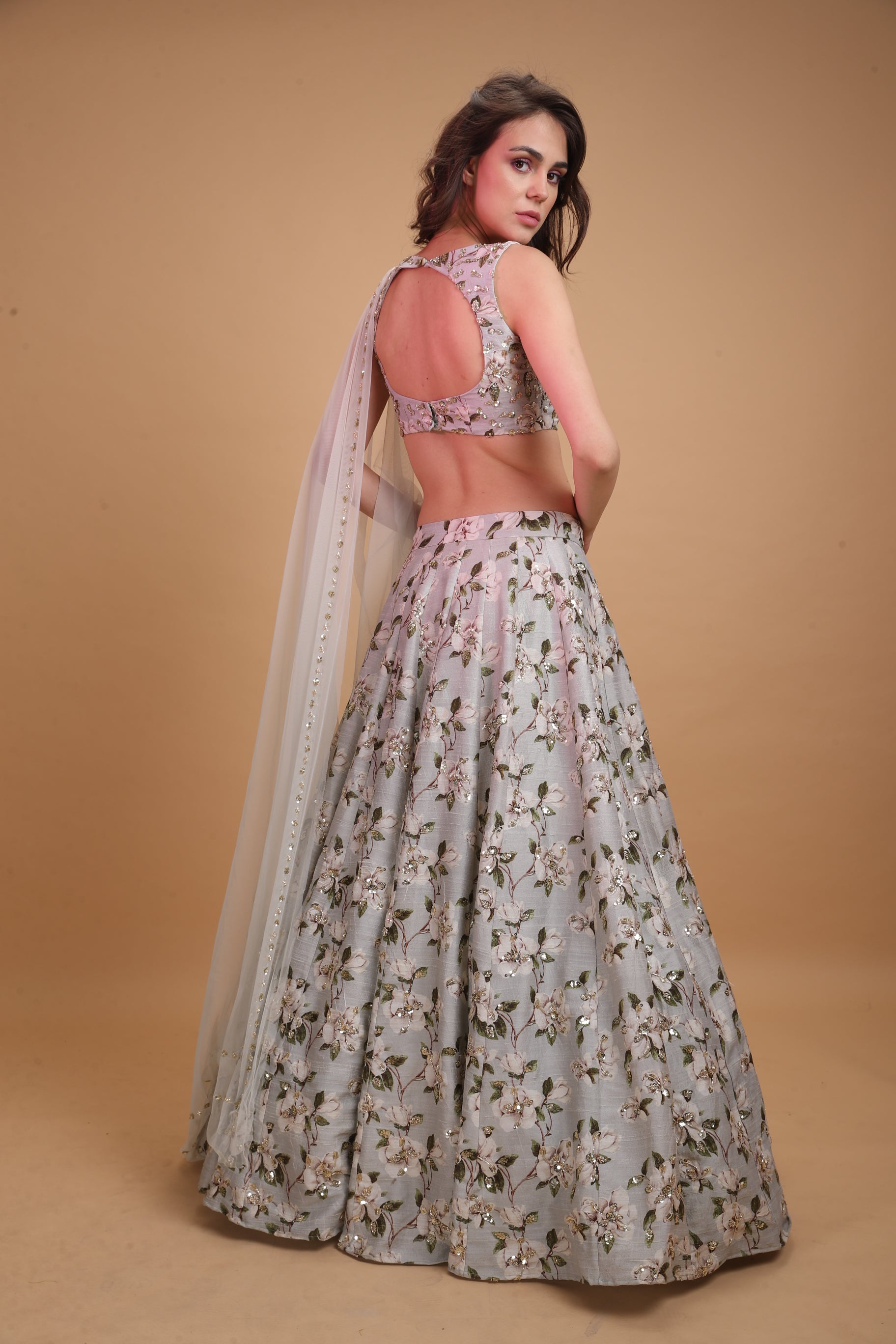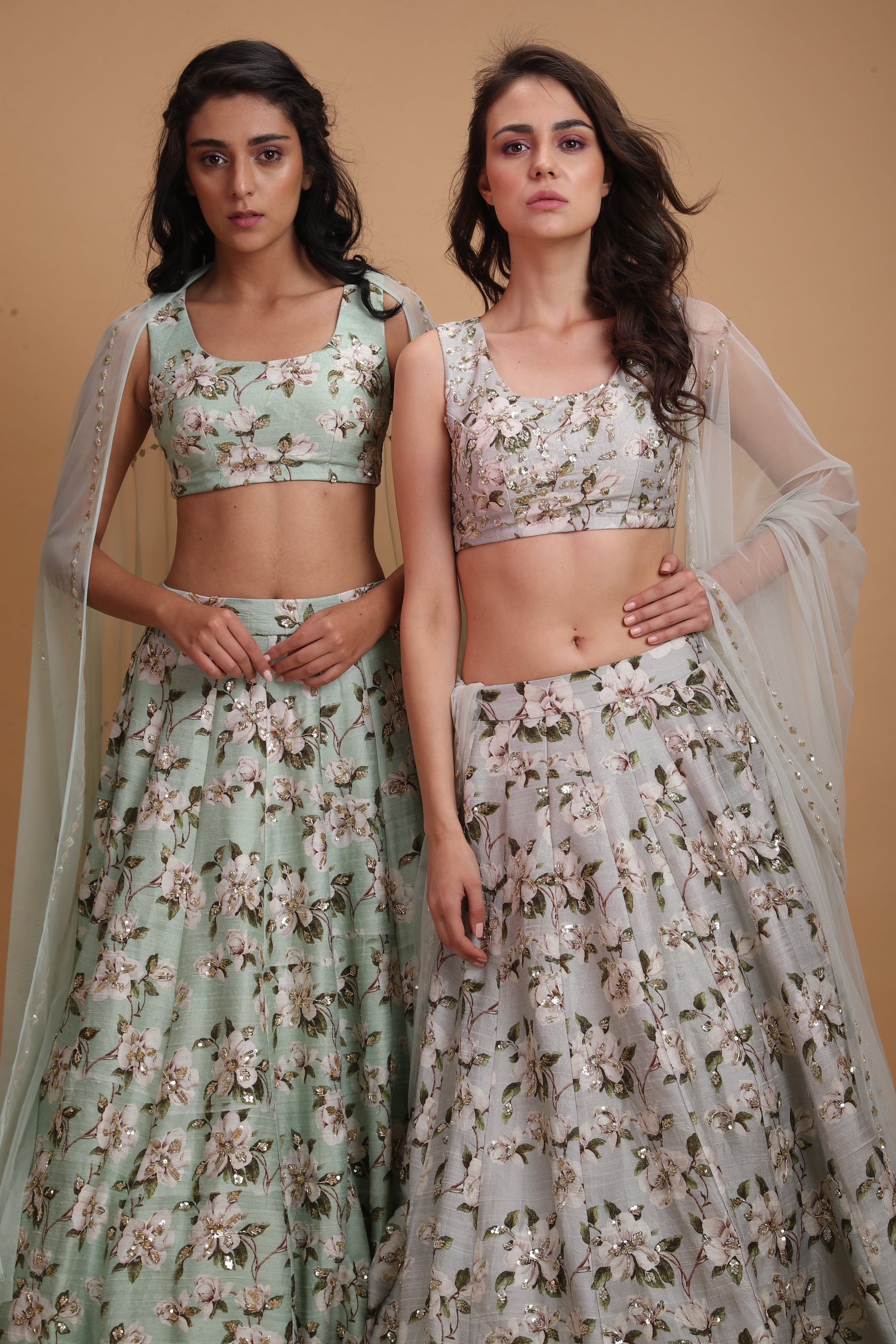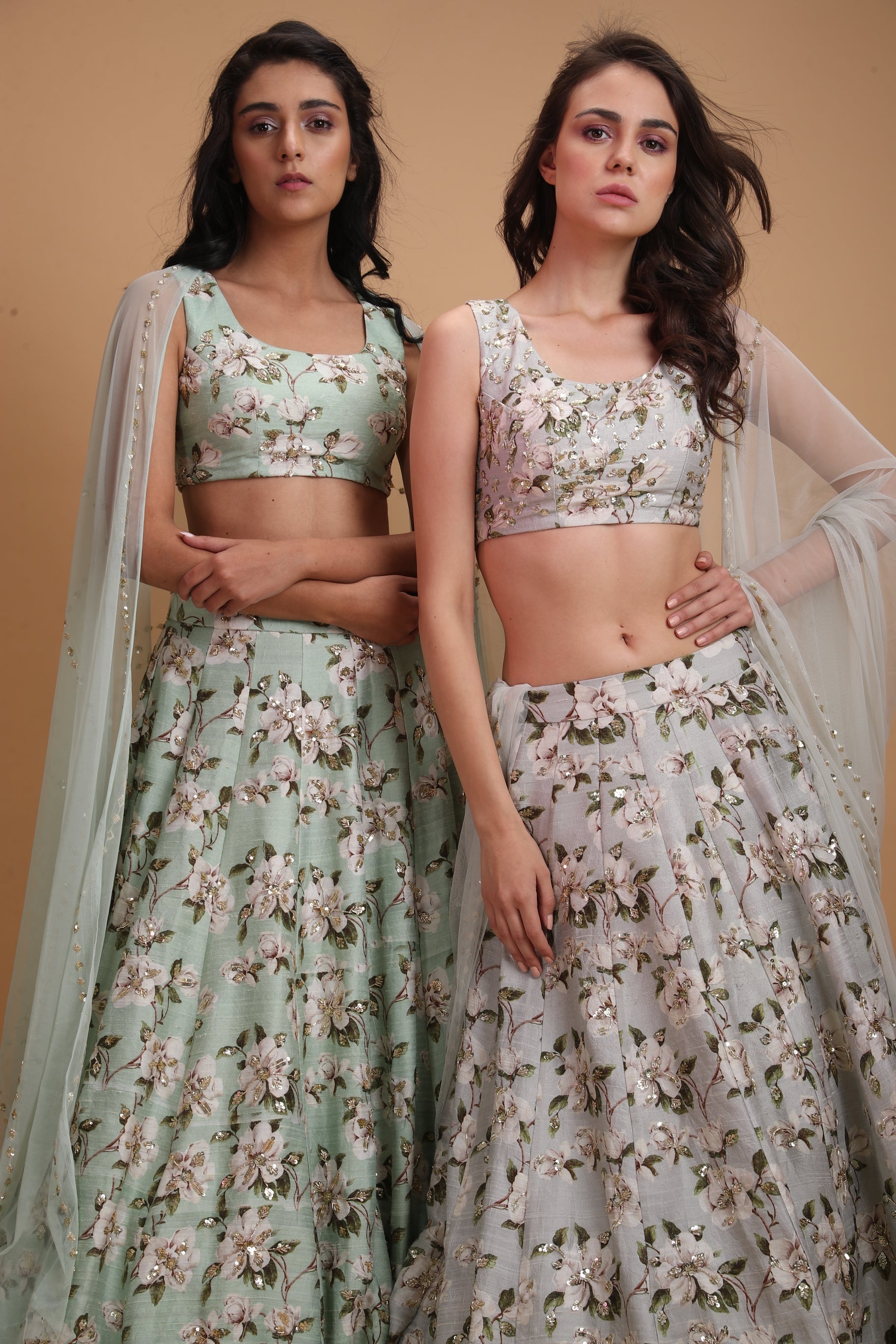 Featuring a POWDER BLUE RAW SILK PRINTED LEHENGA SET IN RAW SILK.