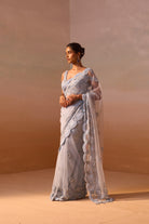 Powder blue net saree embellished with tonal crystal and sequins work in floral shapes with a fully embroidered sleeveless blouse.