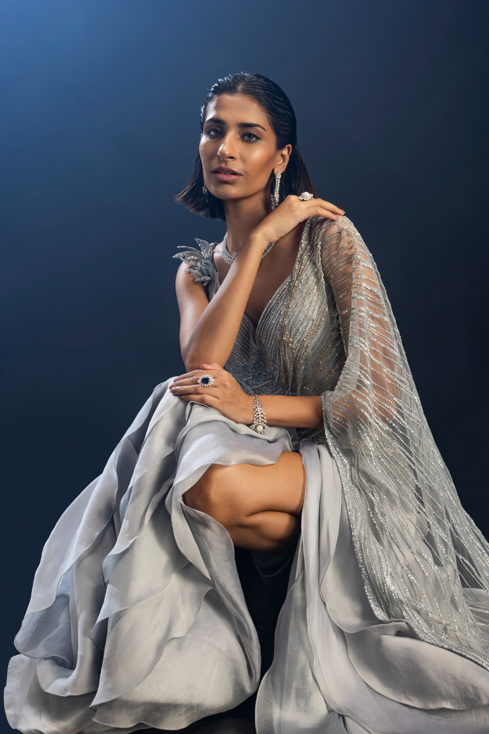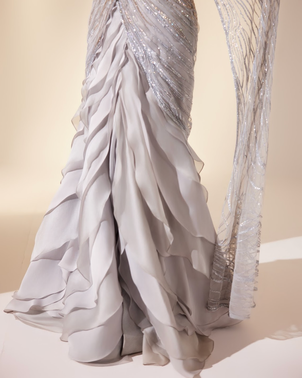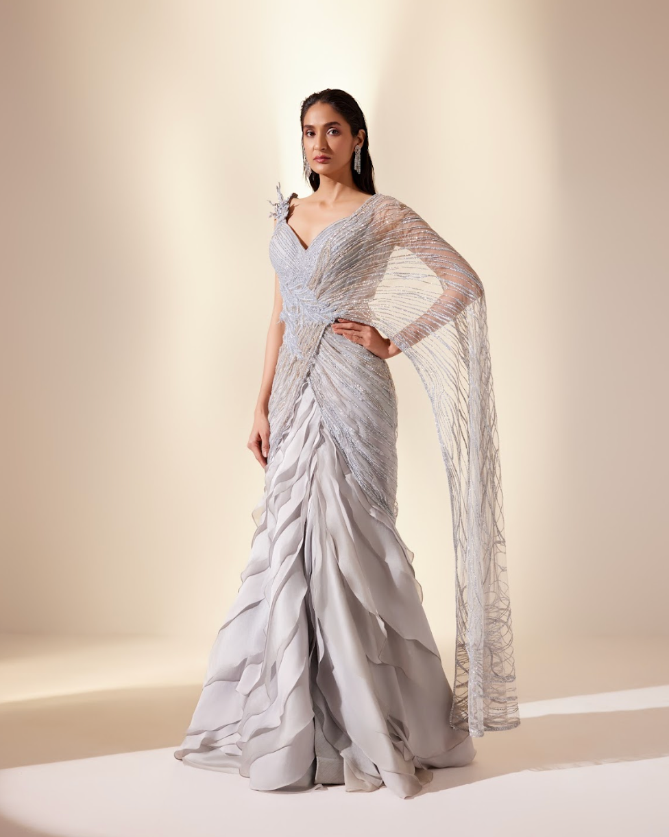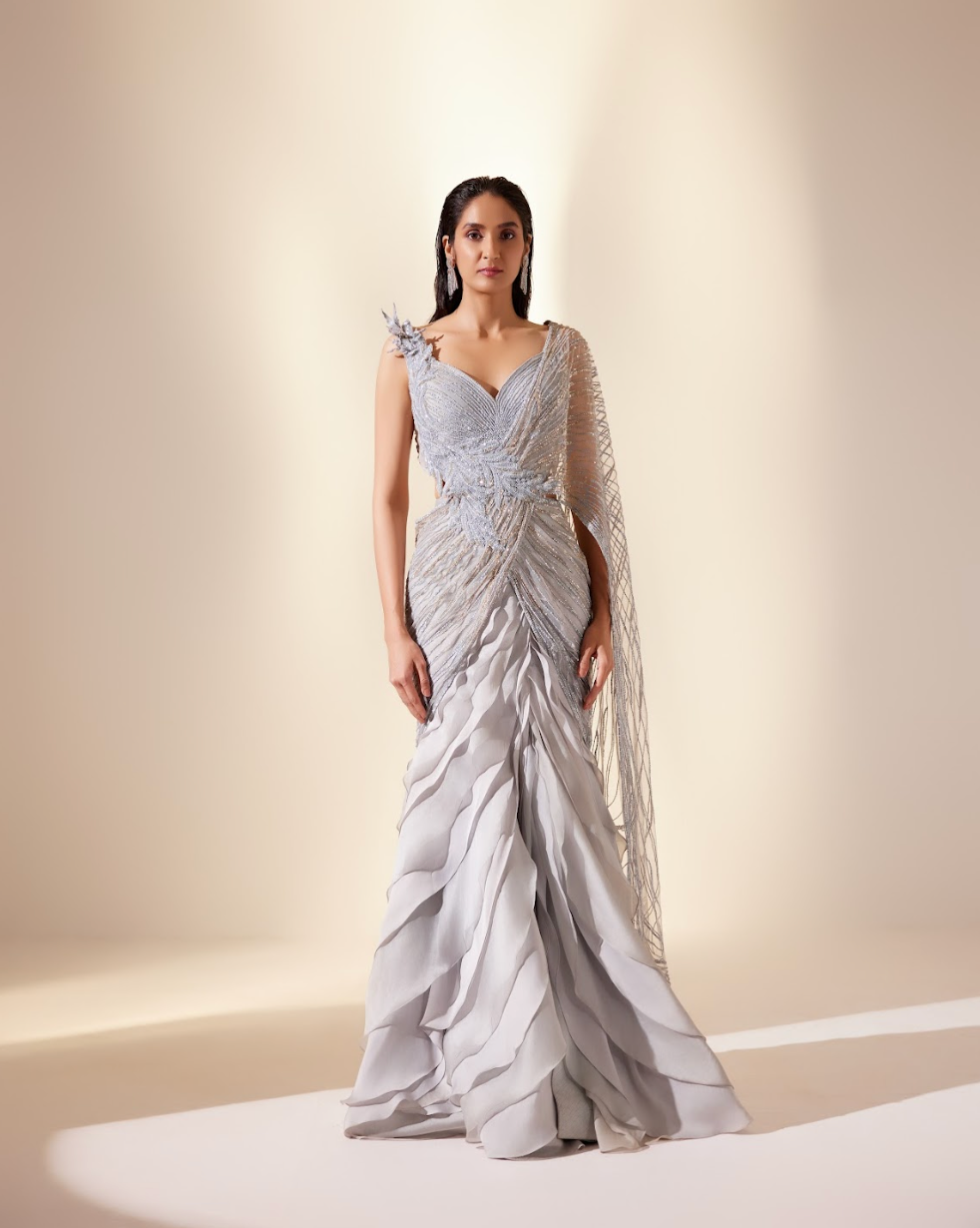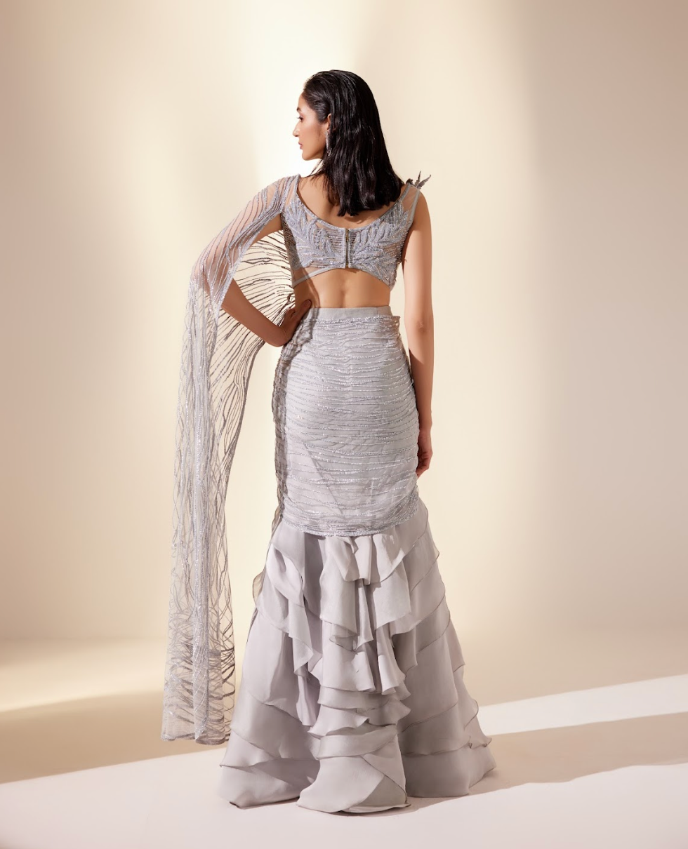 Powder Blue Leaf Saree with delicately layered skirt and metallic lush embroidery, having intricate placements of embellished leaves on top.