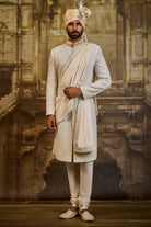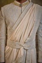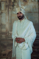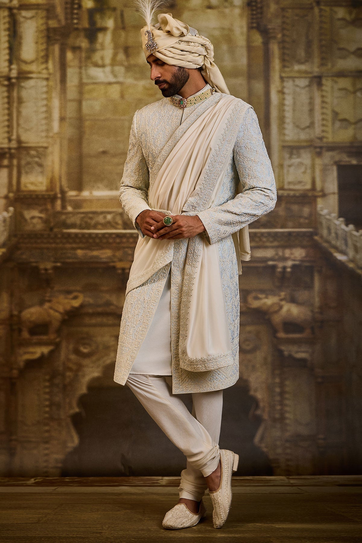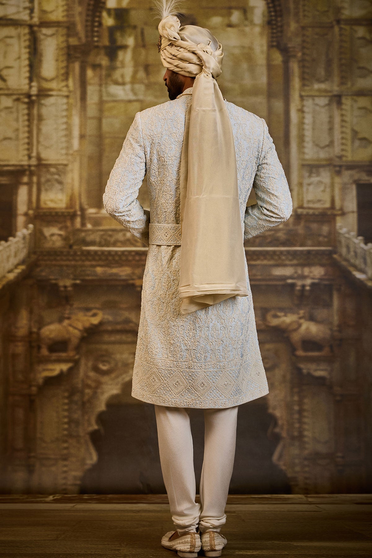 Powder Blue Taffeta Sherwani All Over Embroidered Highlighted With Resham, Moti With Cotton Silk Kurta And Churidar. It Comes With An Optional Worked Stole, Belt And Jutis That Are Chargeable Extra