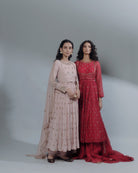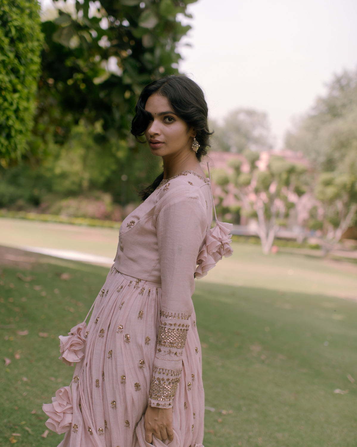 Featuring a POWDER PINK EMBELLISHED ANARKALI SET WITH SHARARA PANTS IN CHANDERI SILK.
