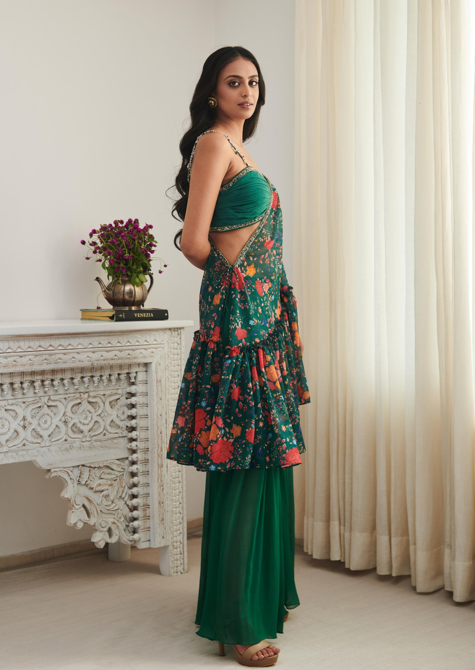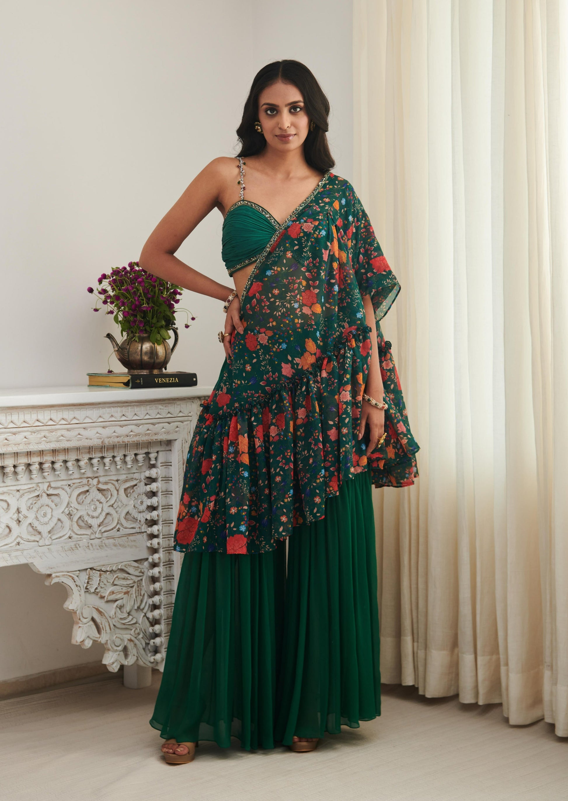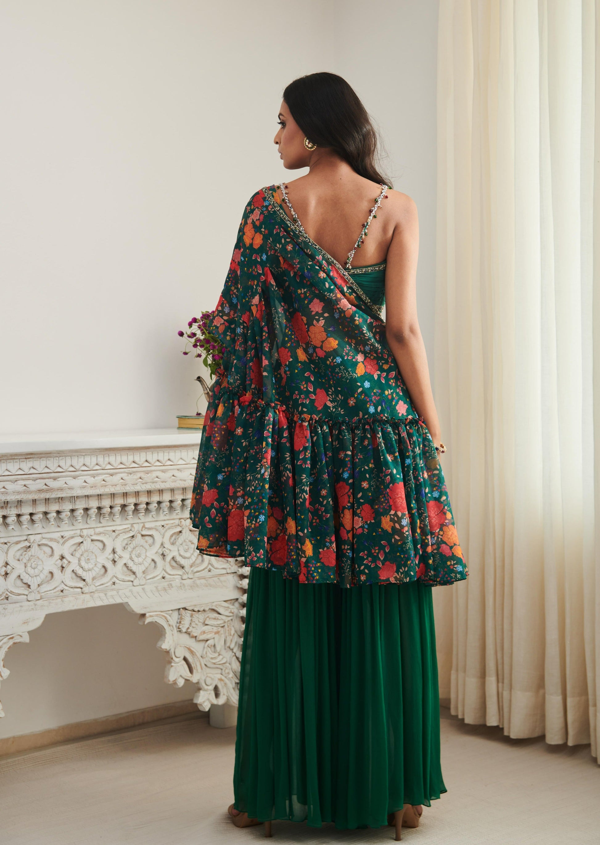 Emerald floral printed shrug with bralette and gharara, which comes with hand embellished pearls sequence bralette.