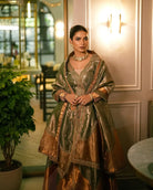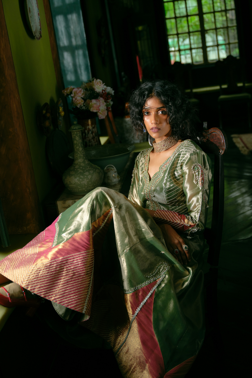 This Kalidar Anarkali set in emerald green silk zari tissue and Jacquard silk Banarasi features Jharokha-inspired panels with elongated paisley embroidery in zari and zardozi. The ensemble is completed with an emerald green tissue dupatta, adorned with Jharokha-inspired panels and pearl detailing.