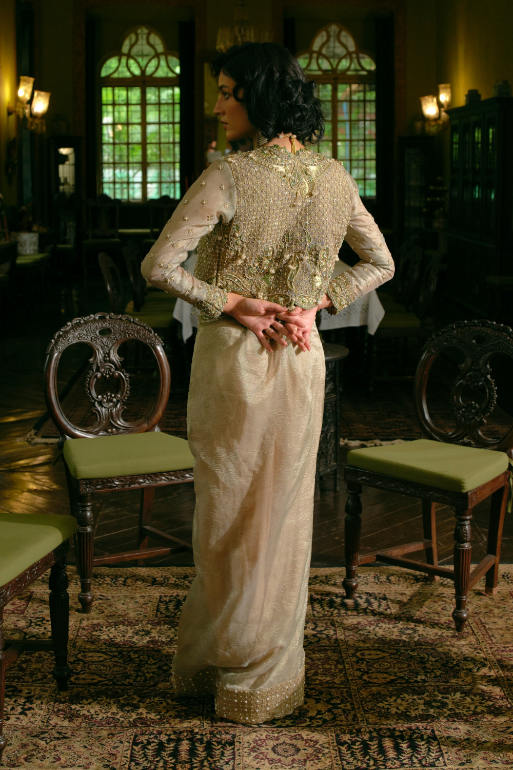 Priyankka agarwal Pearl Gold silk zari tissue draped skirt and croped jacket