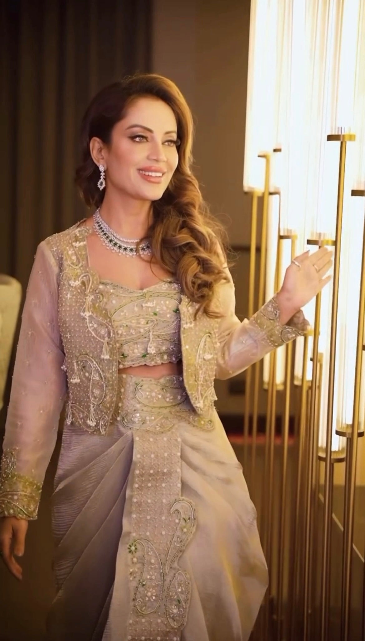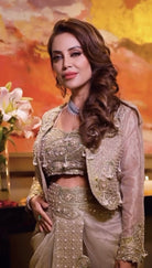 This signature draped skirt set in pearl gold silk zari crushed tissue and Jacquard Banarasi features exquisite paisley embroidery and intricate embellishments. It includes an embroidered blouse and a pearl gold tissue cropped jacket adorned with paisley embroidery and pearl details.