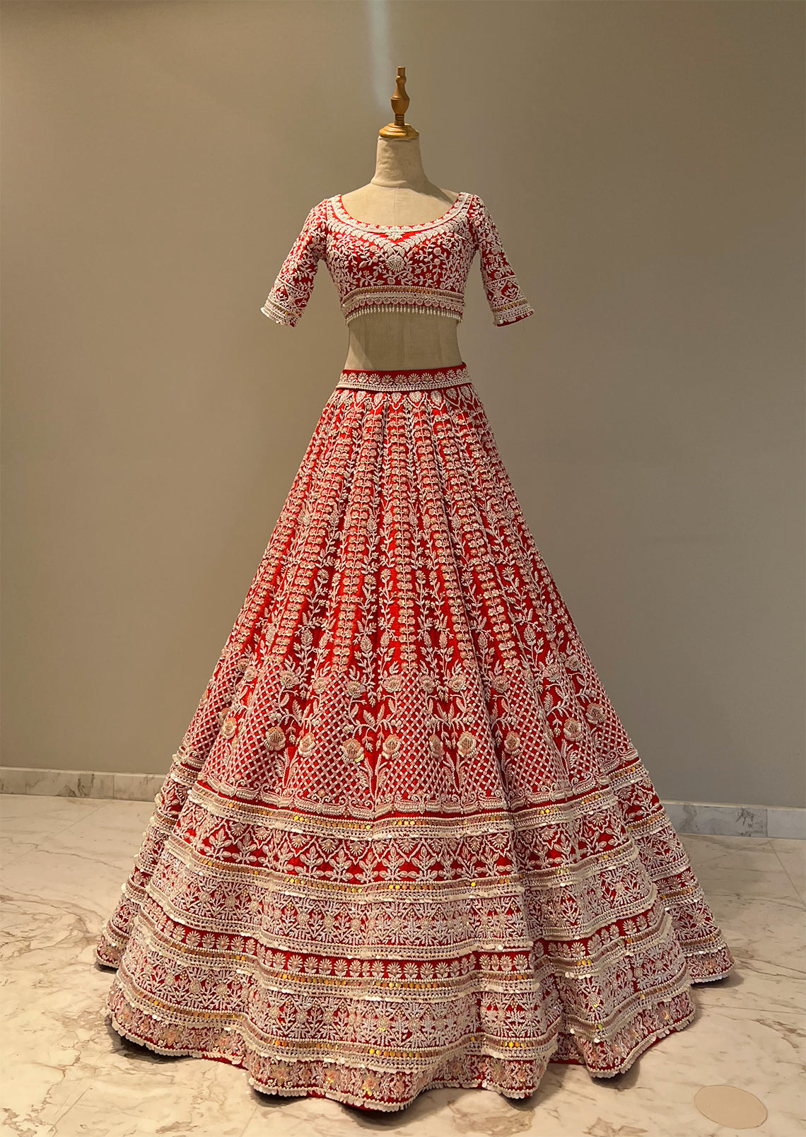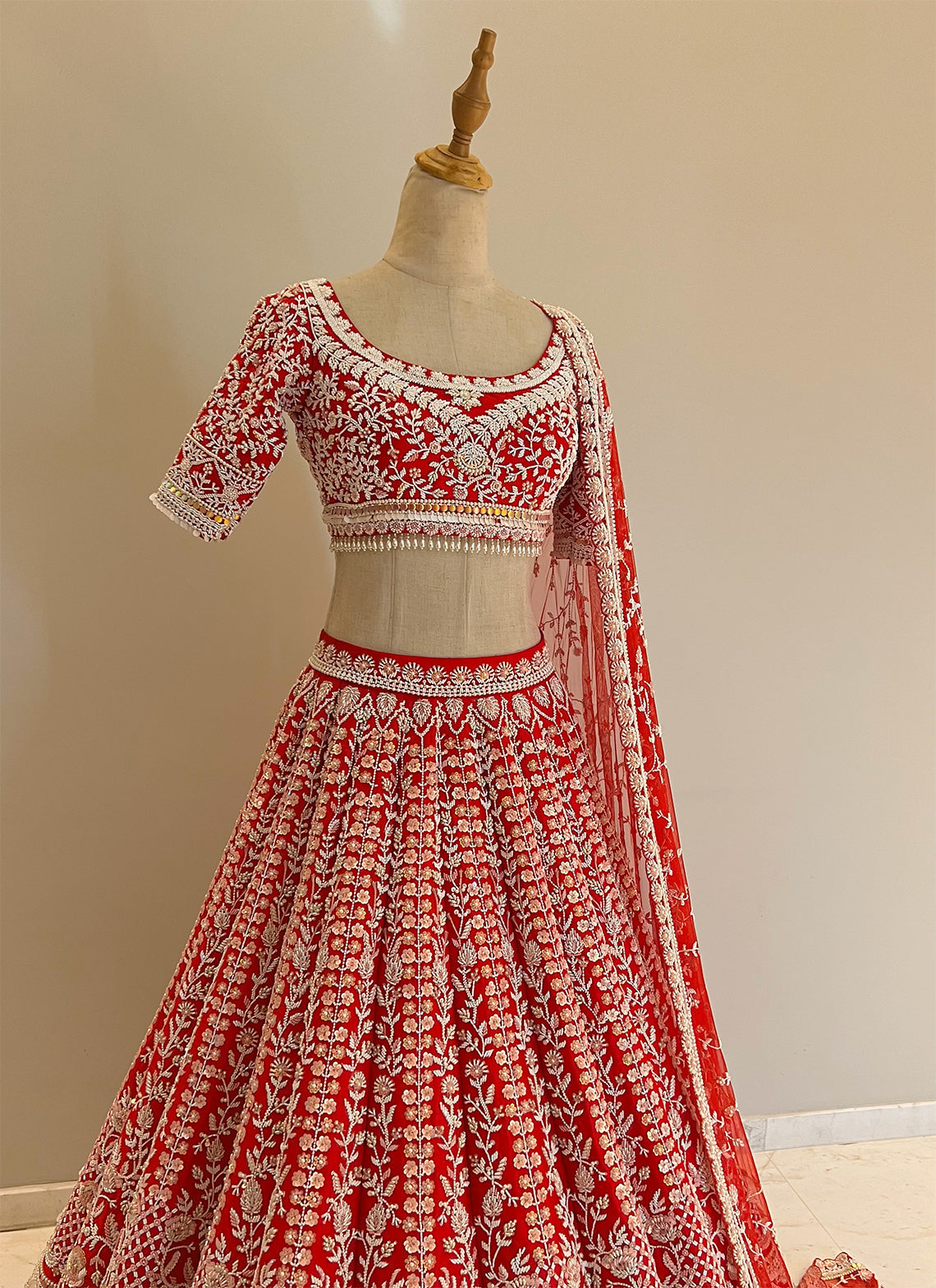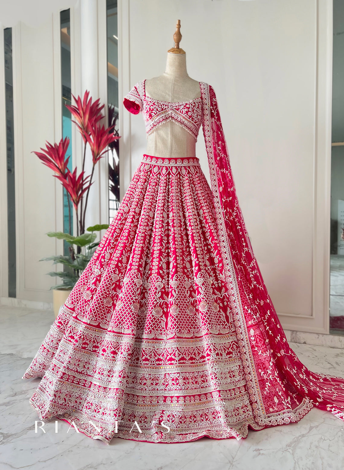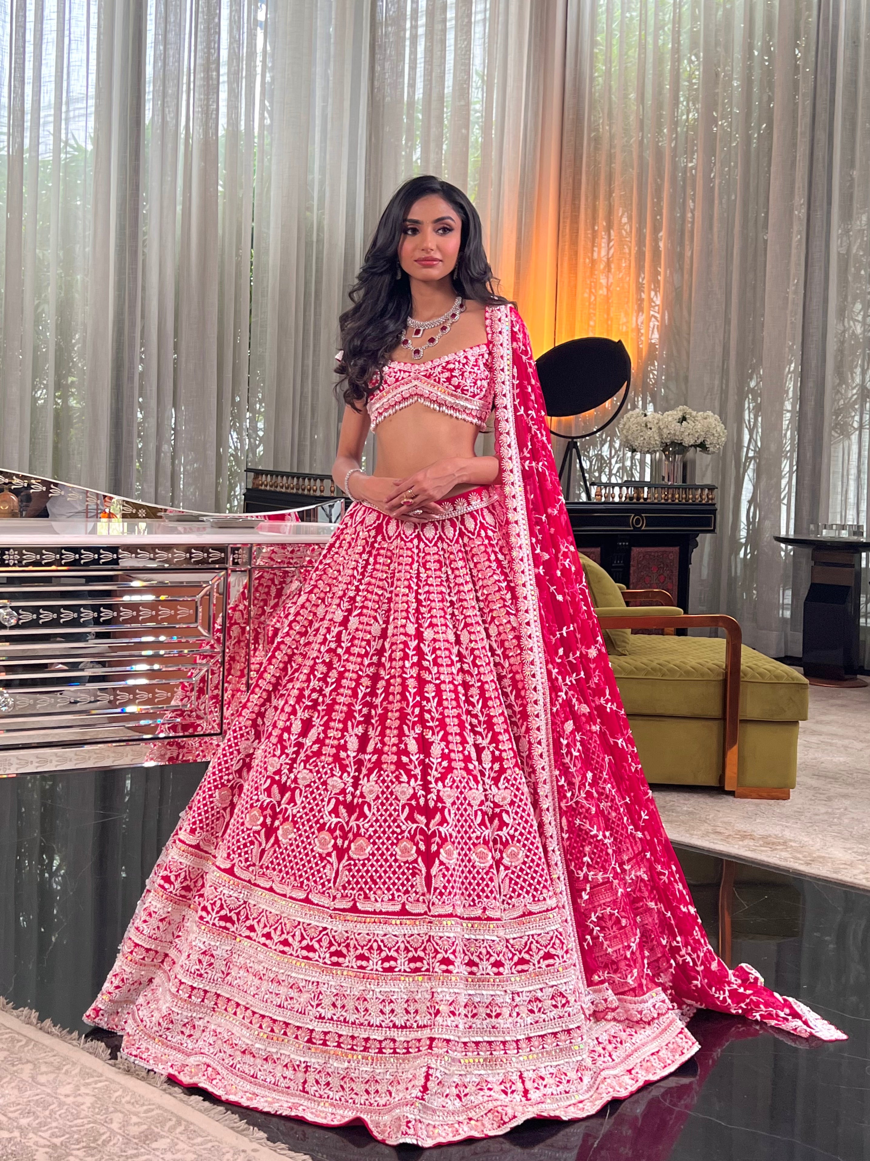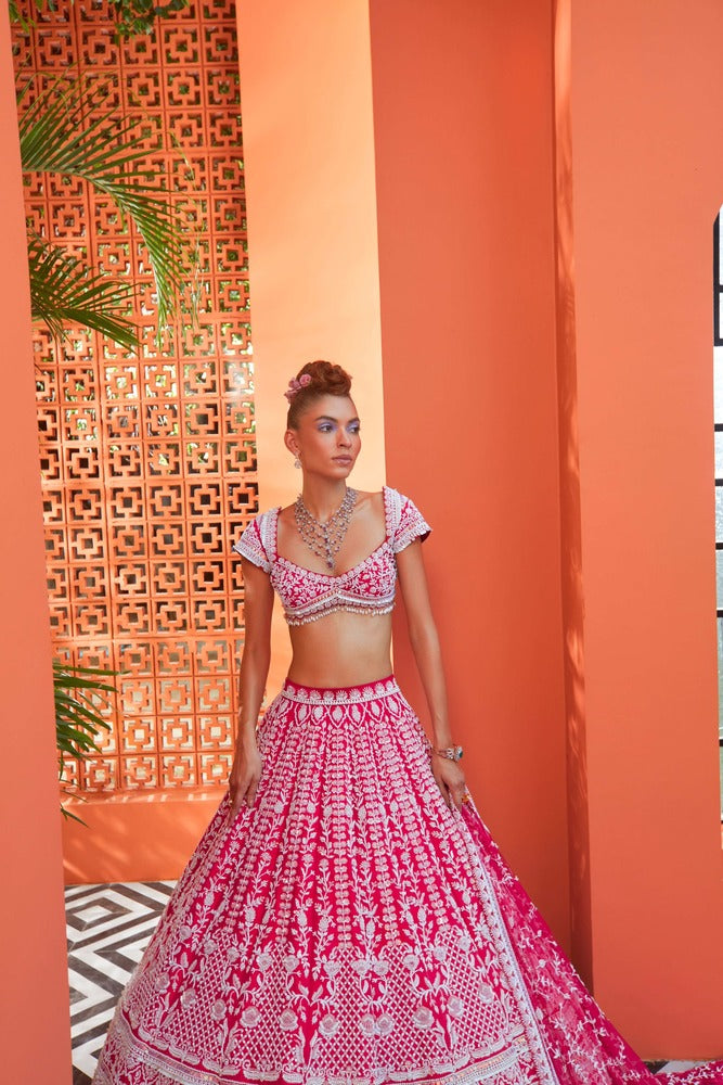 The Primrose set is Bridal set with a traditional and a hint of modern touch. The entire Lehenga set is lavishly hand embroidered with signature pearls, sequins and crystals. The Dupatta is a hot pink fully embroidered net.