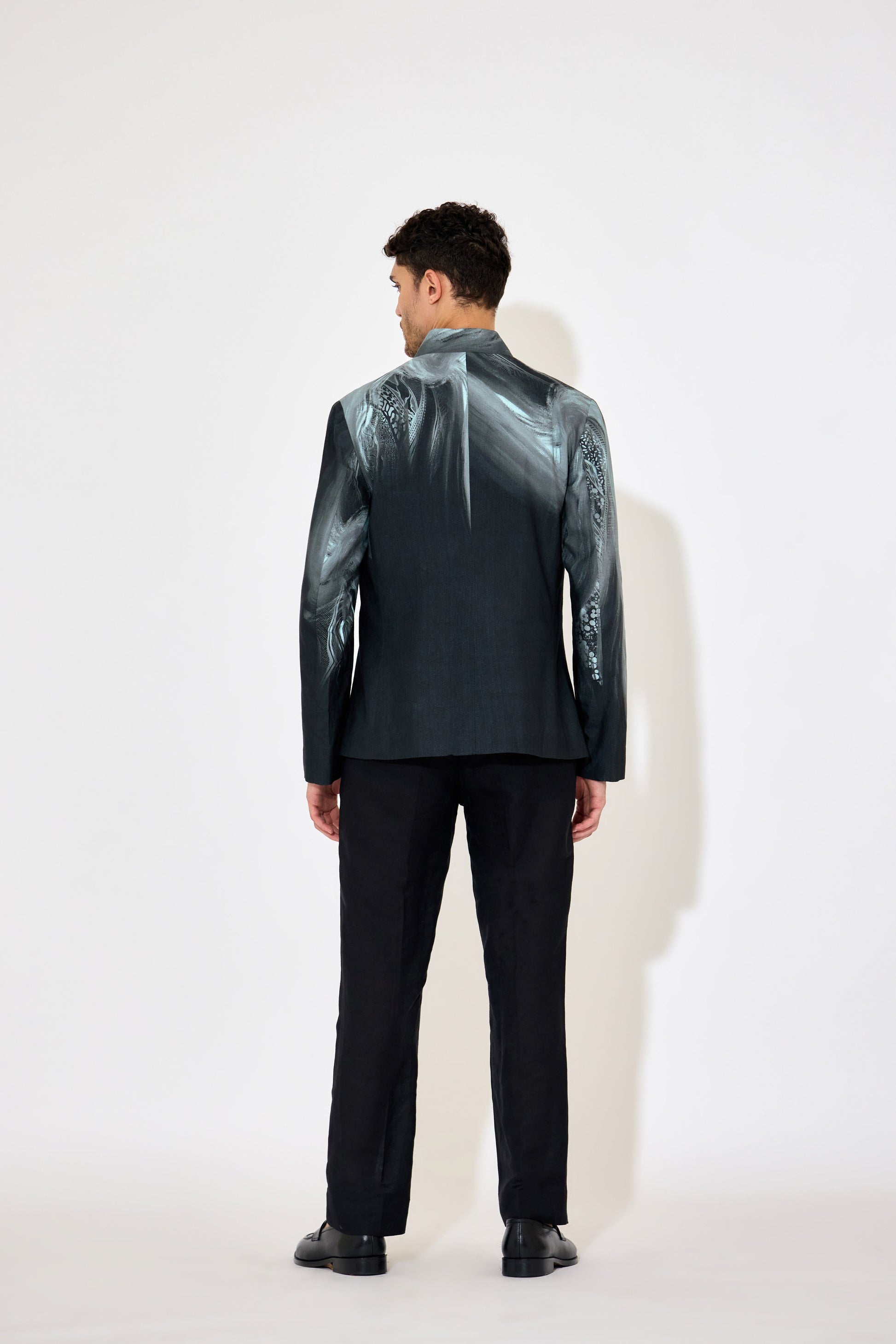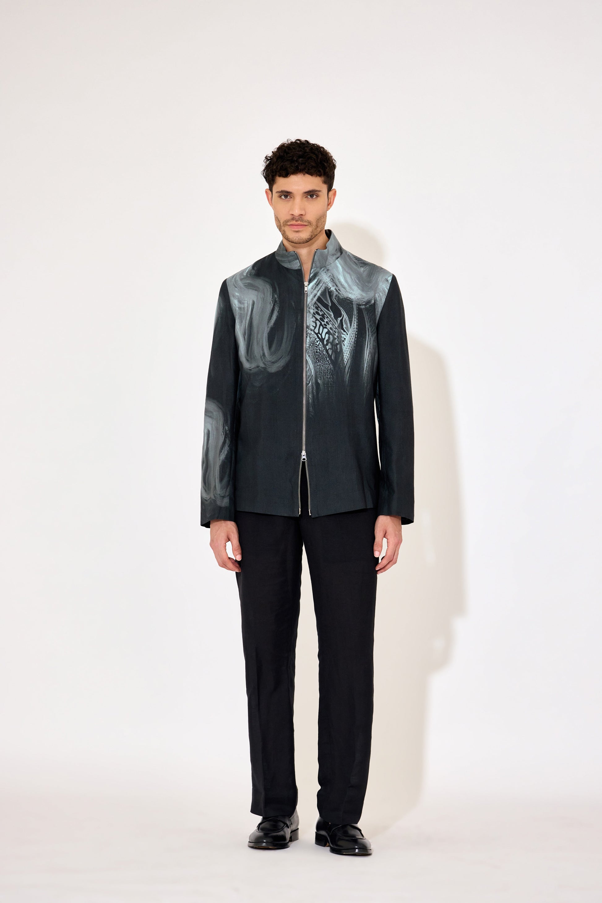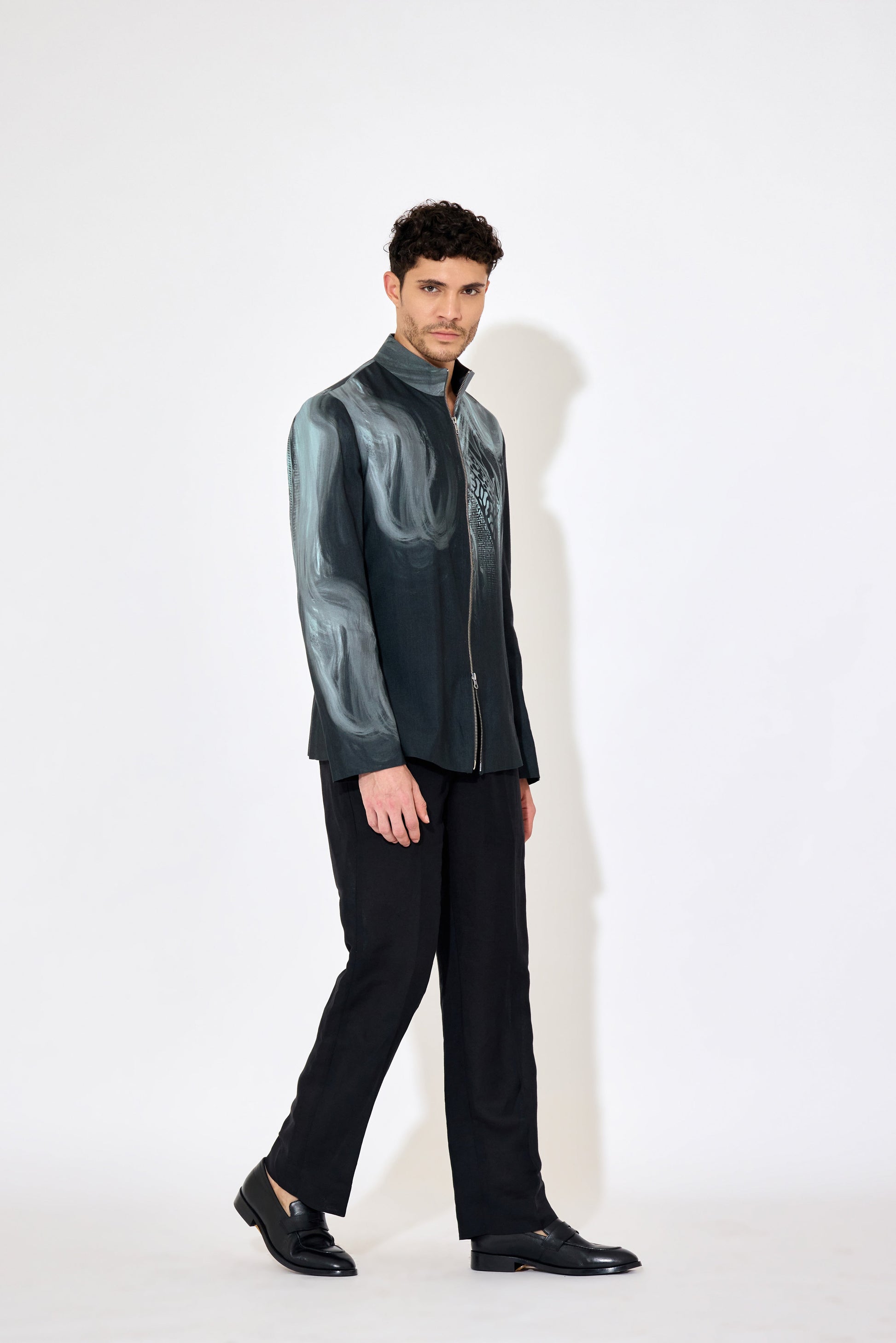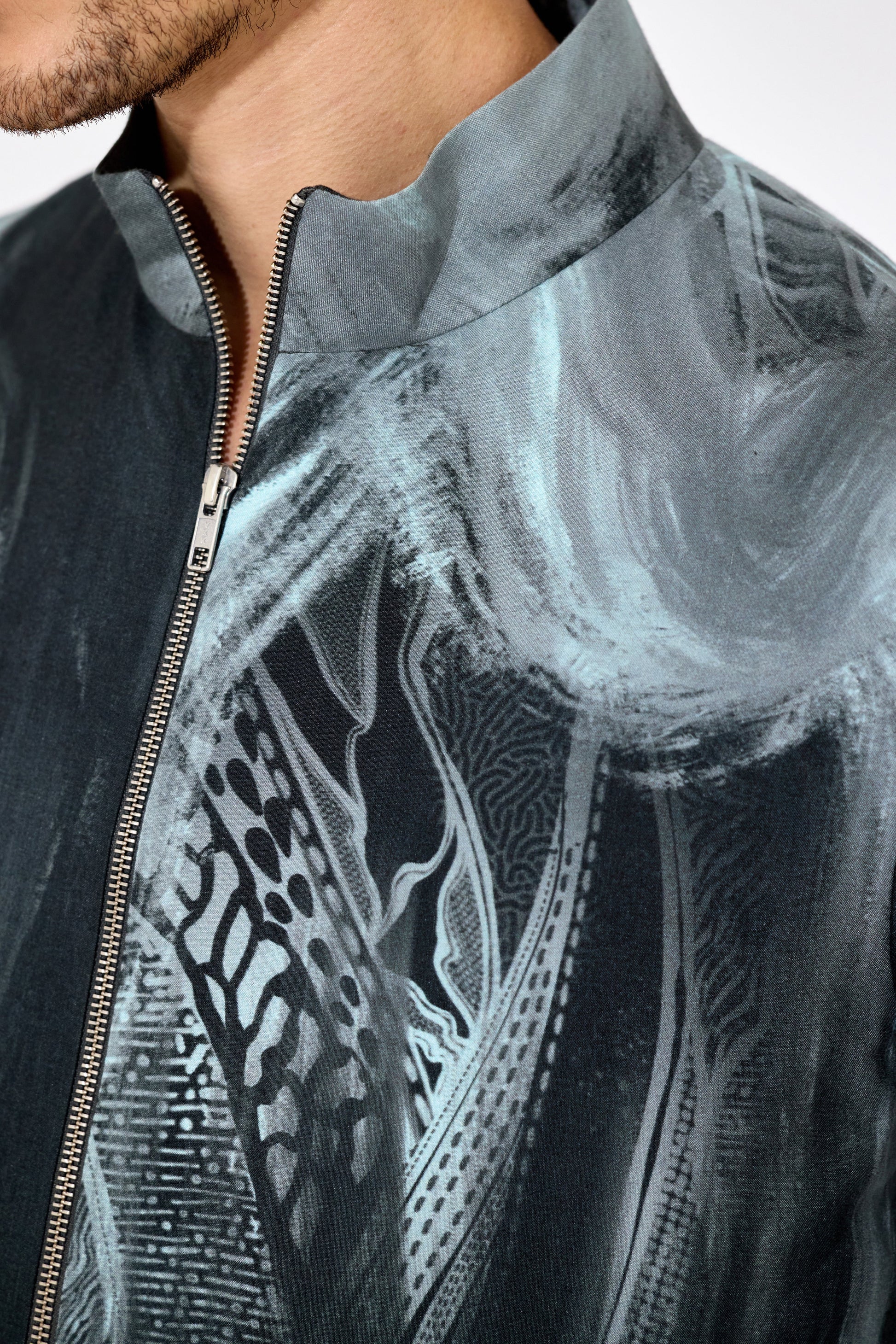 This grey-blue men's printed shacket combines the warmth of a jacket with the casual style of a shirt. Featuring a distinctive double runner zipper, it offers versatile wear and easy adjustment for comfort. The printed design adds a modern, dynamic edge, making it suitable for layering in transitional seasons while maintaining a sharp, contemporary look.