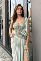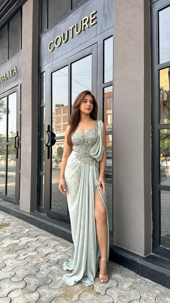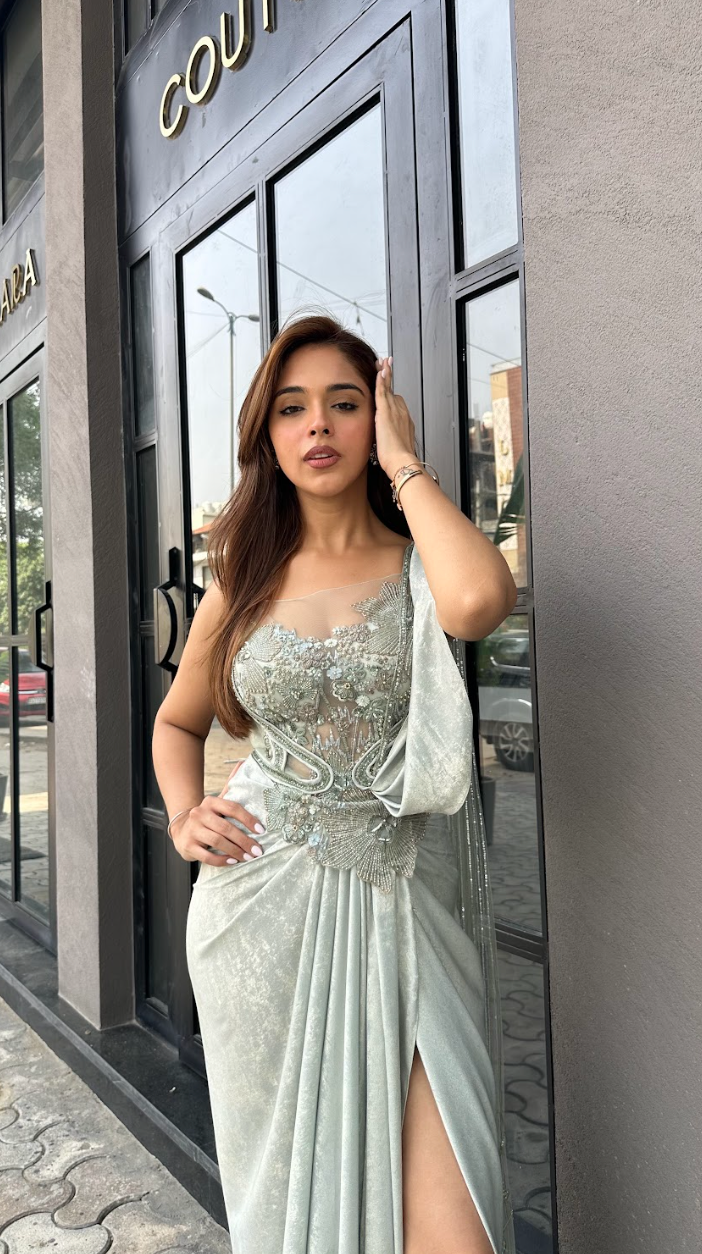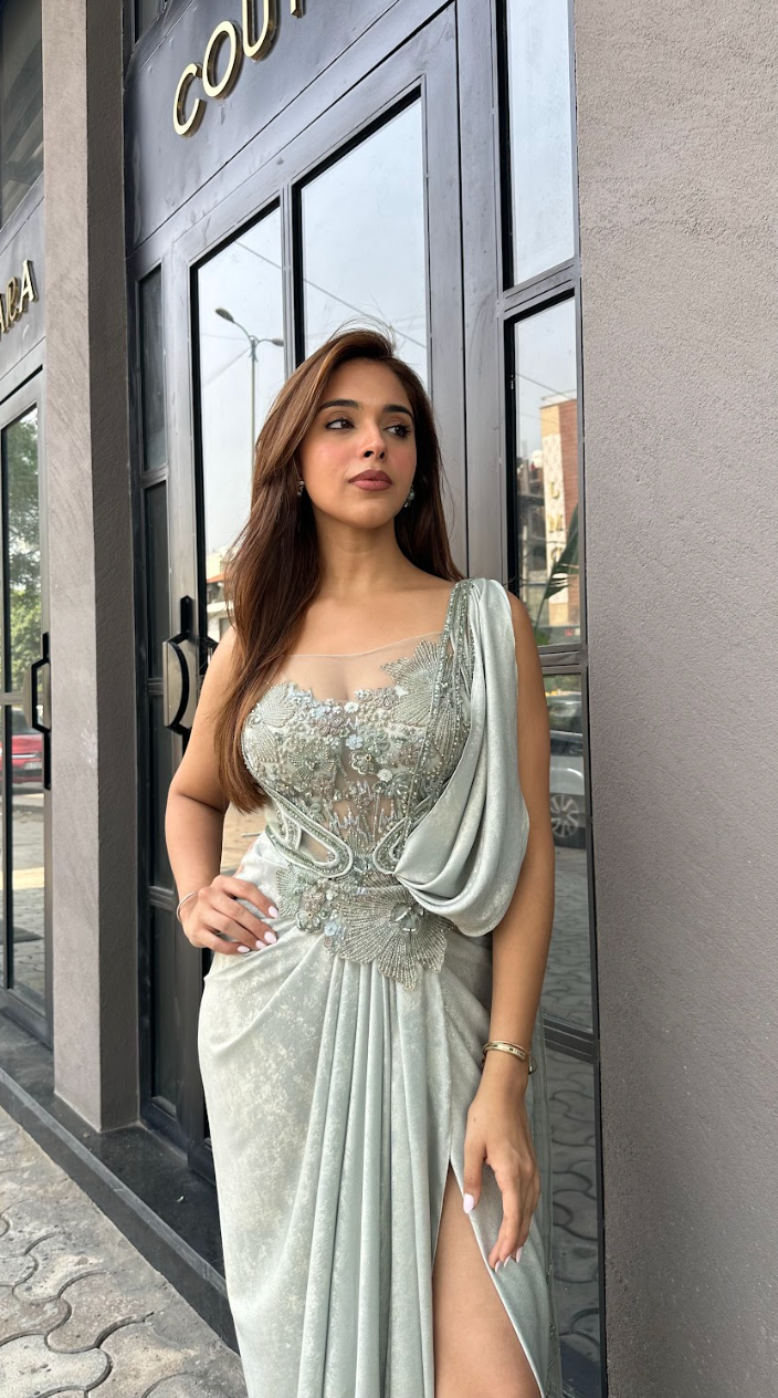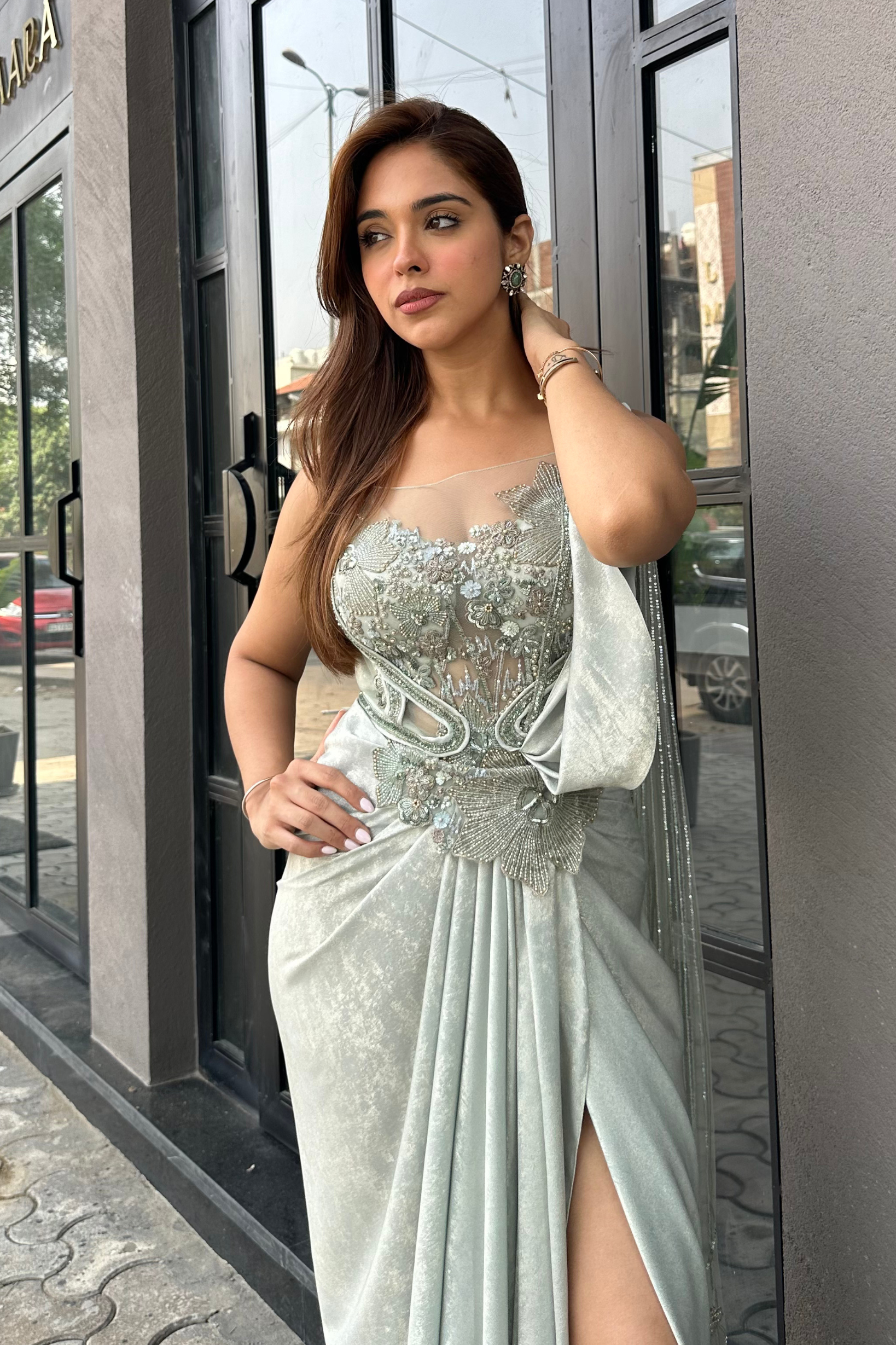 Aurora mint floral saree, a fusion of celestial inspiration and contemporary elegance.