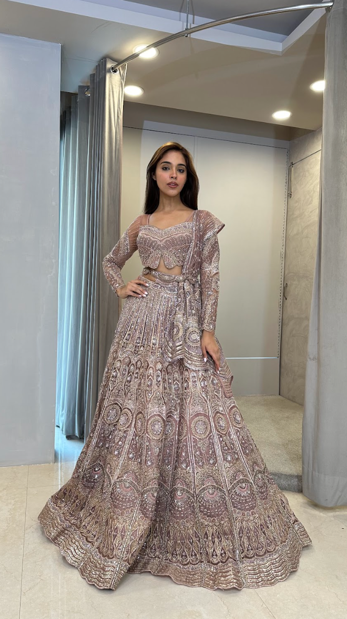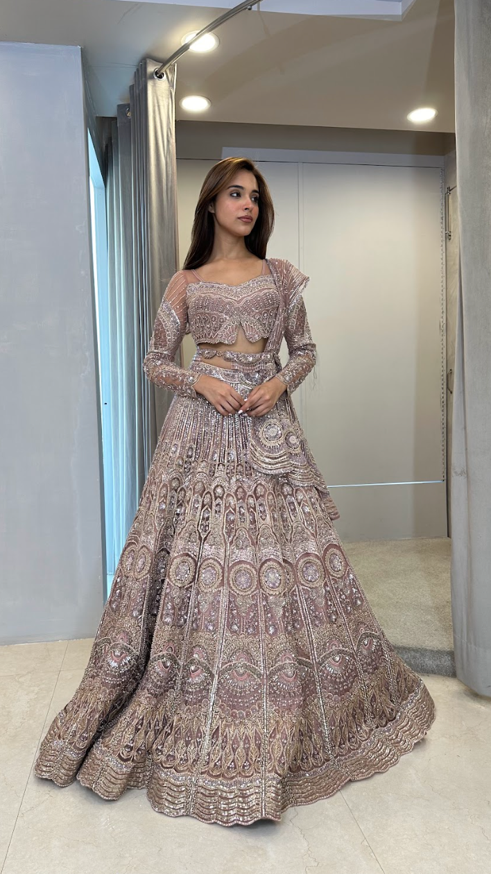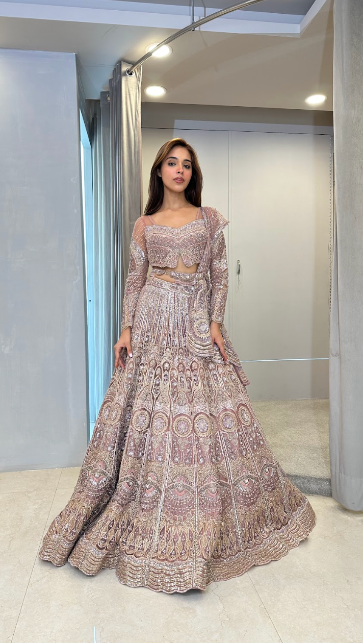 This Lehenga is adorned with skillfully Crafted intricate embroidery all over it. It comes with BEAUTIFUL Blouse and asymmetrical dupatta.