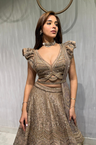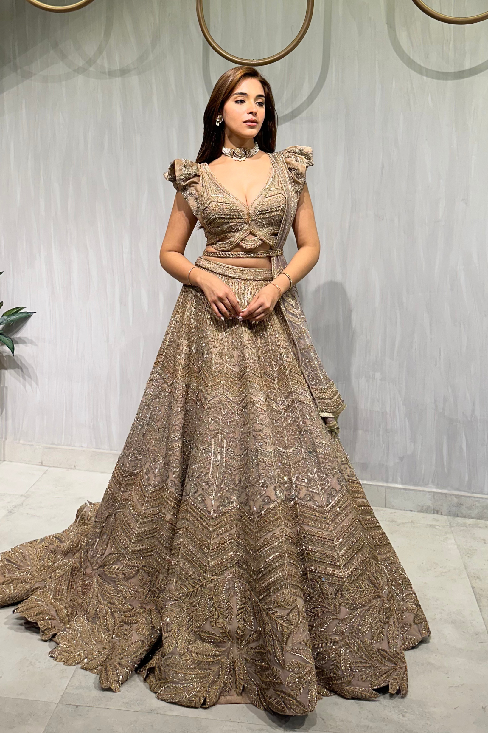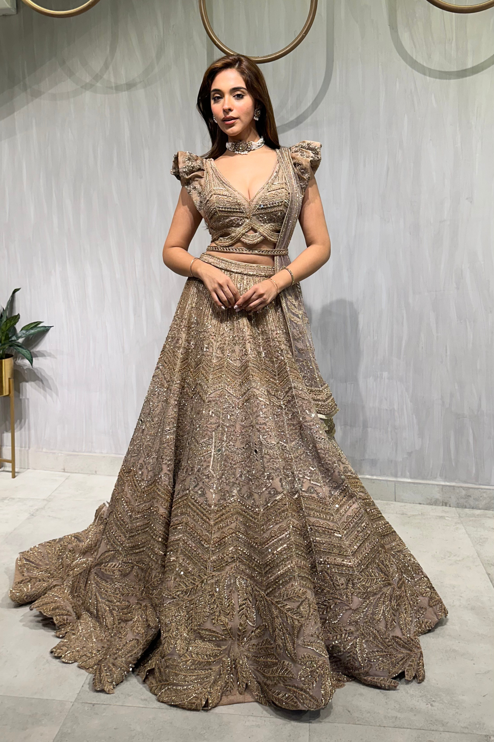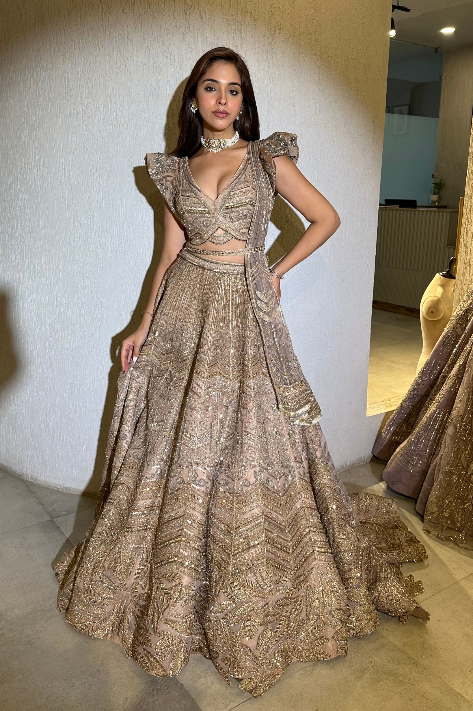 Dusky orchid sheeny blouse paired with a heavily embroidered elegant lehenga, and dupatta