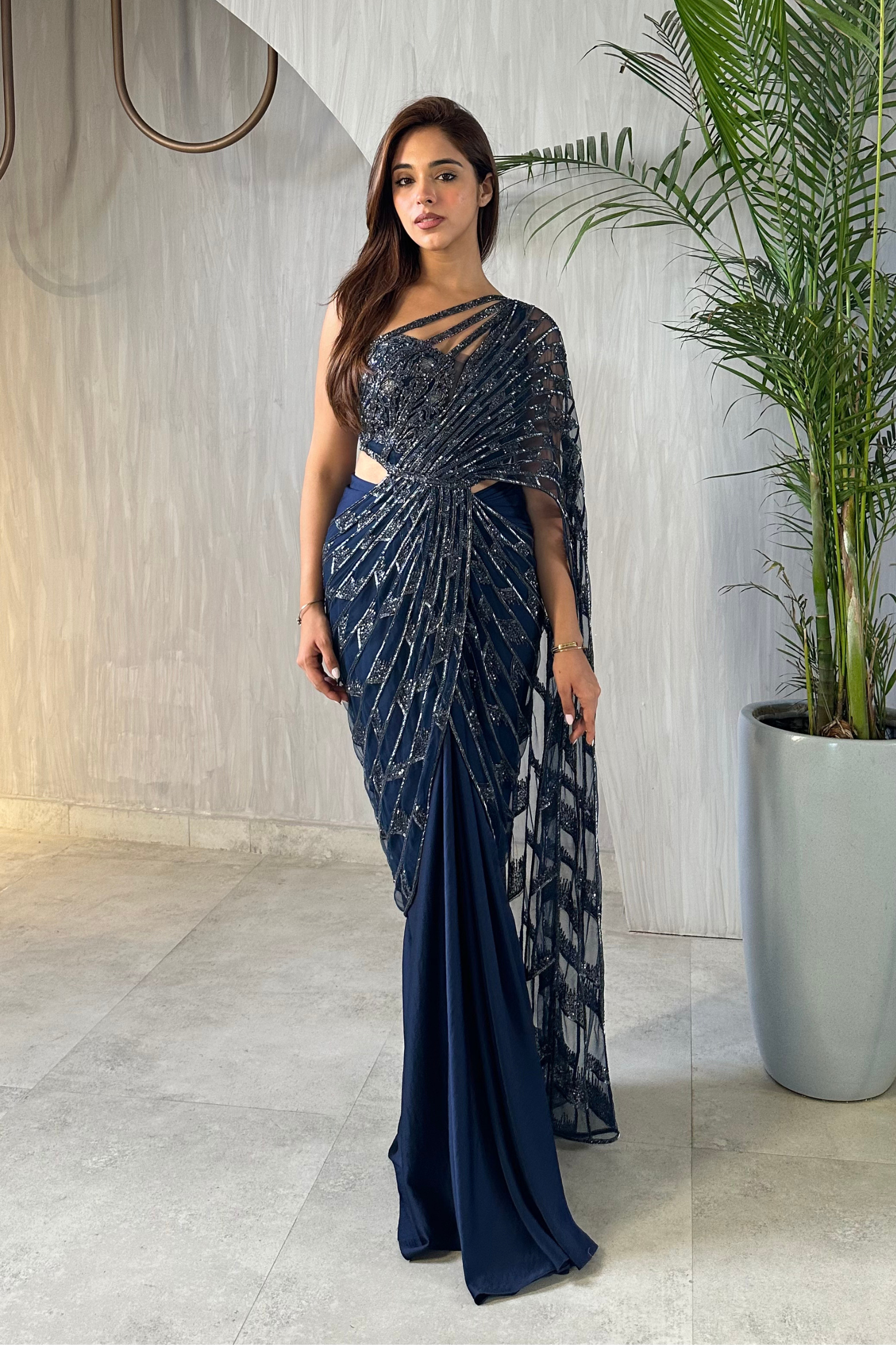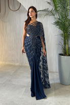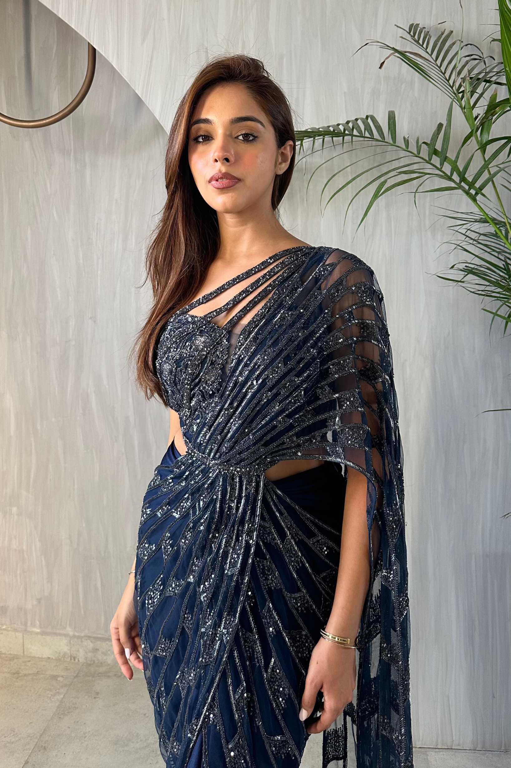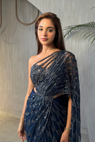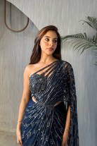 Midnight Blue drizzle embroidery saree with delicately sculpted silhouette and gleaming linear embroidery.