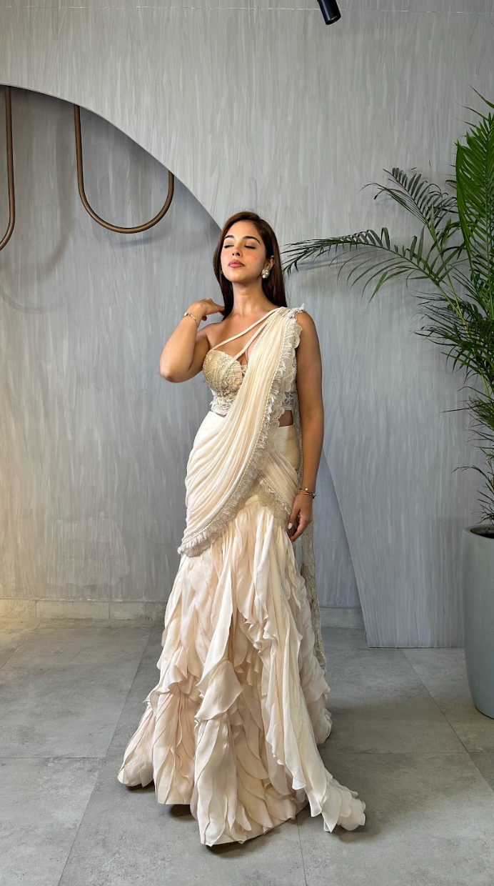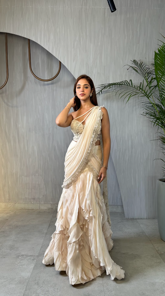 The saree comes with alluring organza drape and blouse detailing that shimmers like moonbeams cascading through a starlit sky.