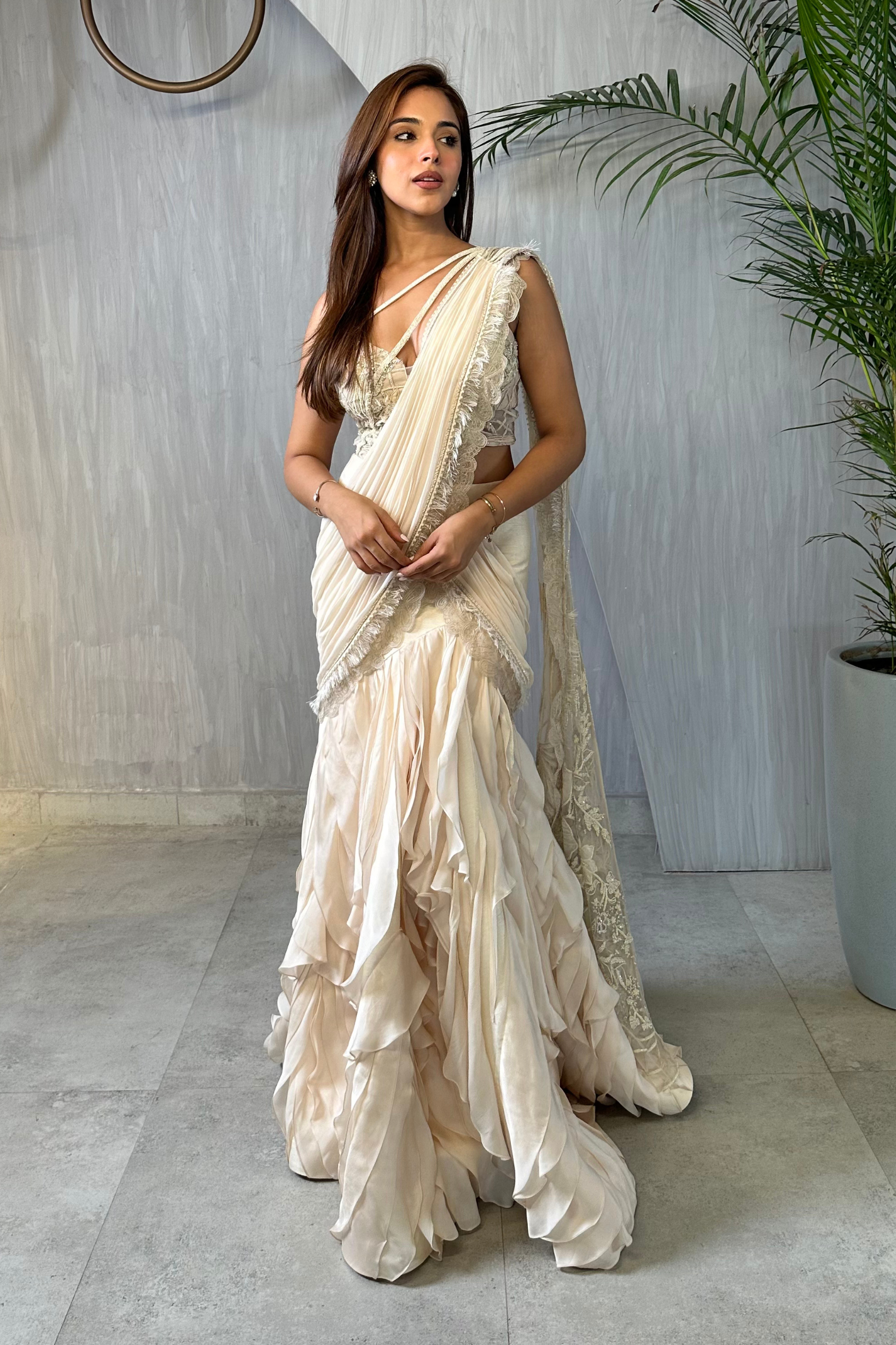 The saree comes with an alluring organza drape and blouse detailing that shimmers like moonbeams cascading through a starlit sky.
