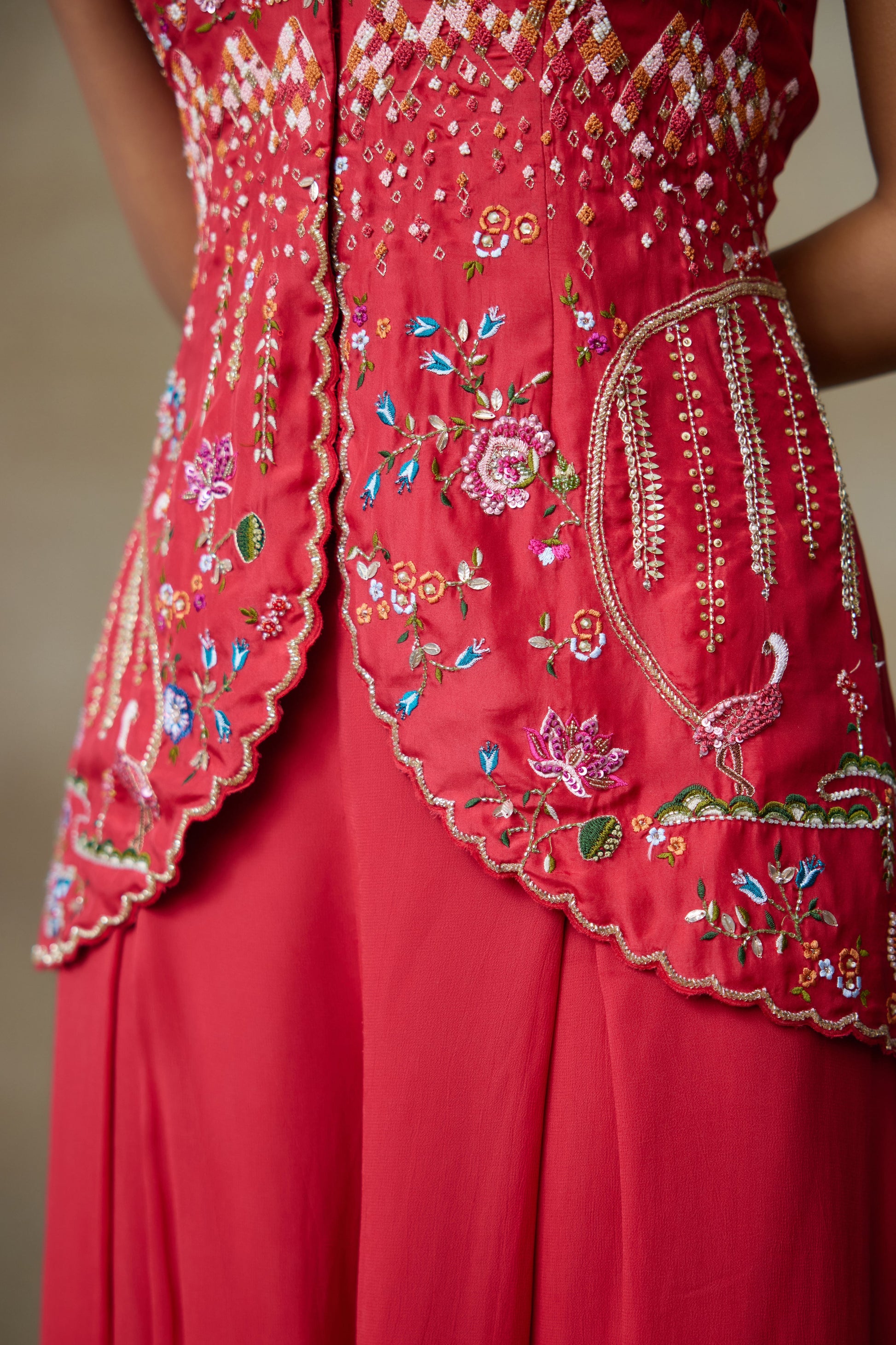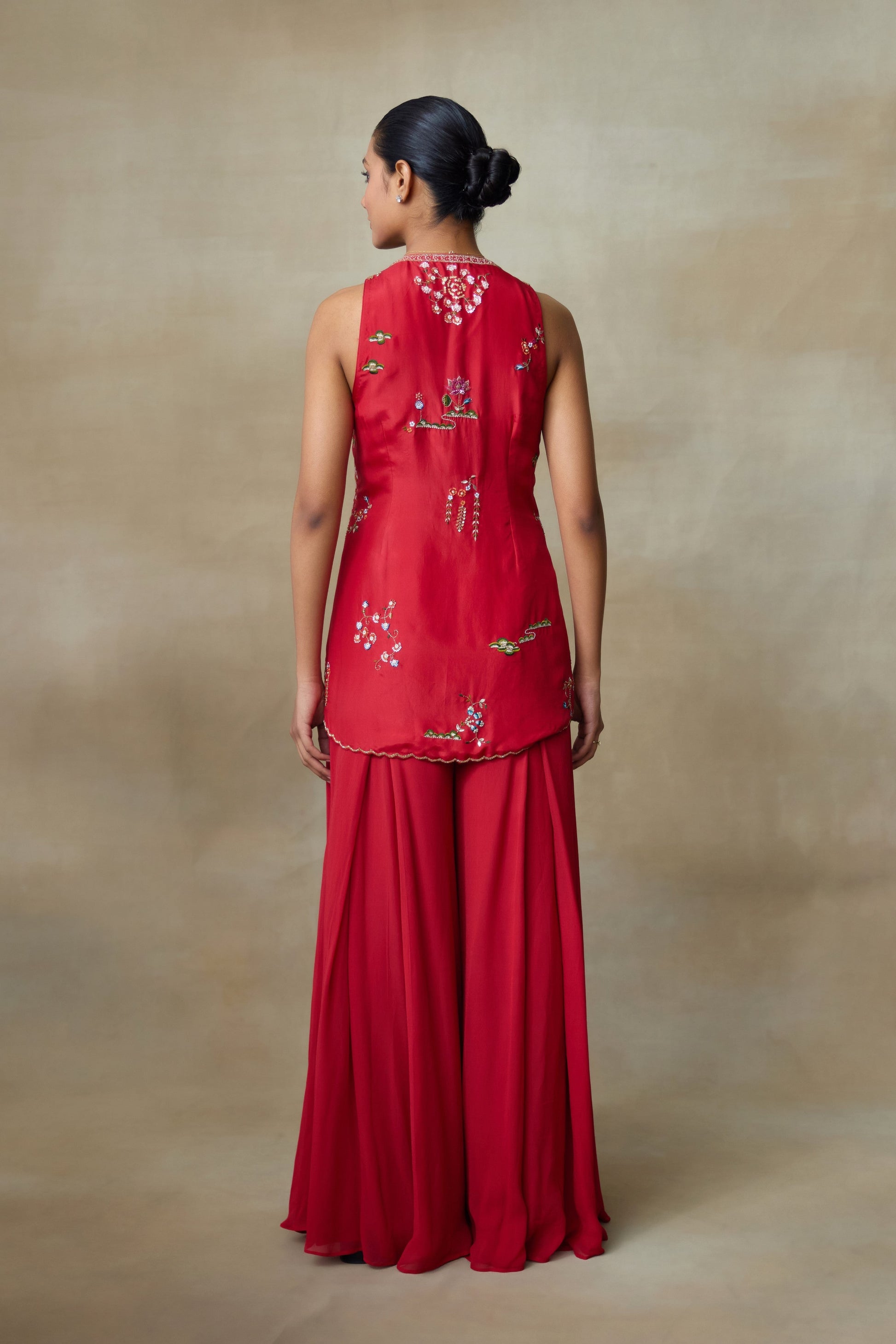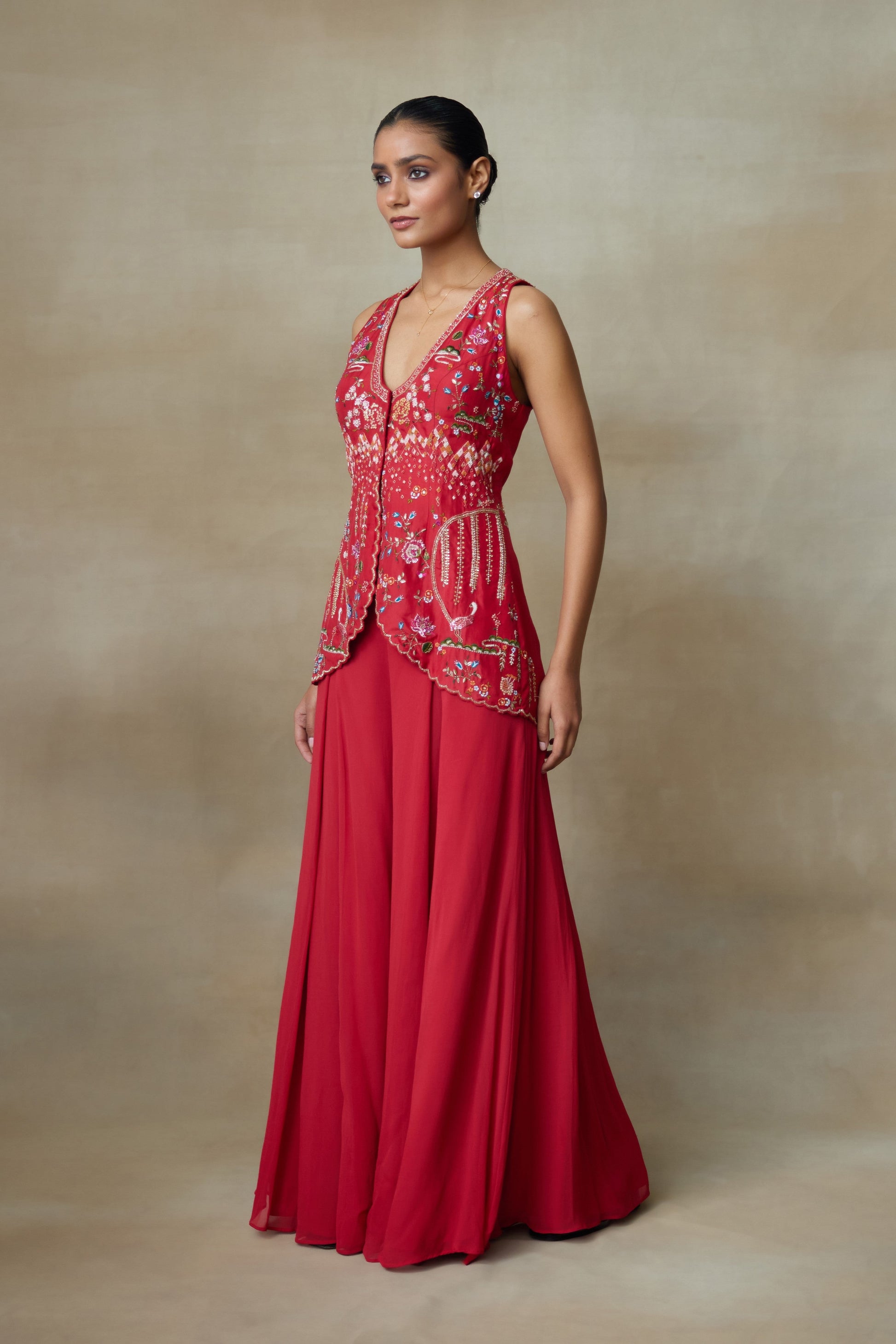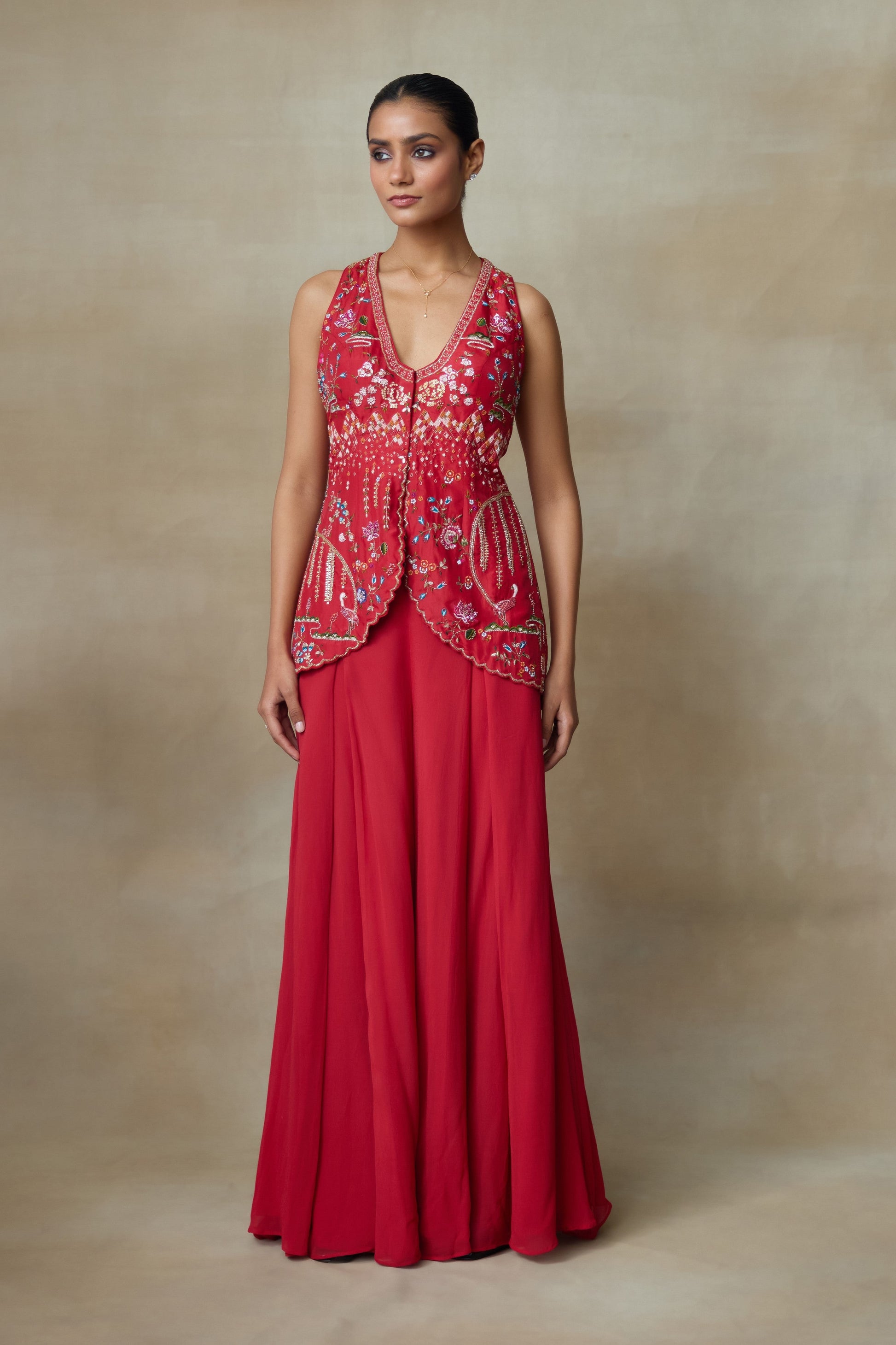 Our Sindoori Red Silk Cut Sleeves Kurta With Georgette Flared Plazo Has Olden Sun Embroidery And Intricate Ivy Motifs, Adding Golden Birds With Floral Pattern, Its Adornments Includes Shimmering Zardozi And Zari Threads This Set Blends Beautifully Adding A Touch Of Elegance.