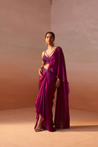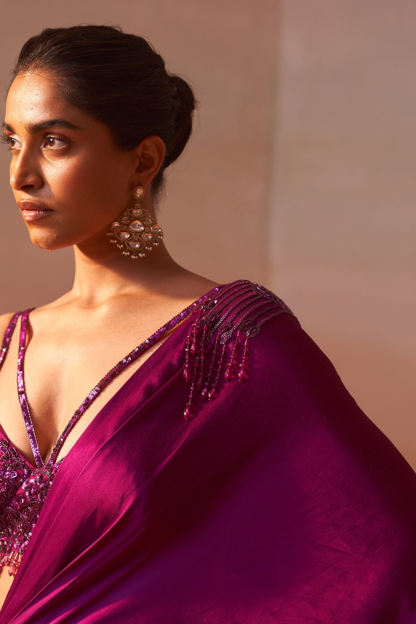 Vibrant wine satin pre-draped saree with a stylish blouse worked in tonal beads and sequins and cut dana work.