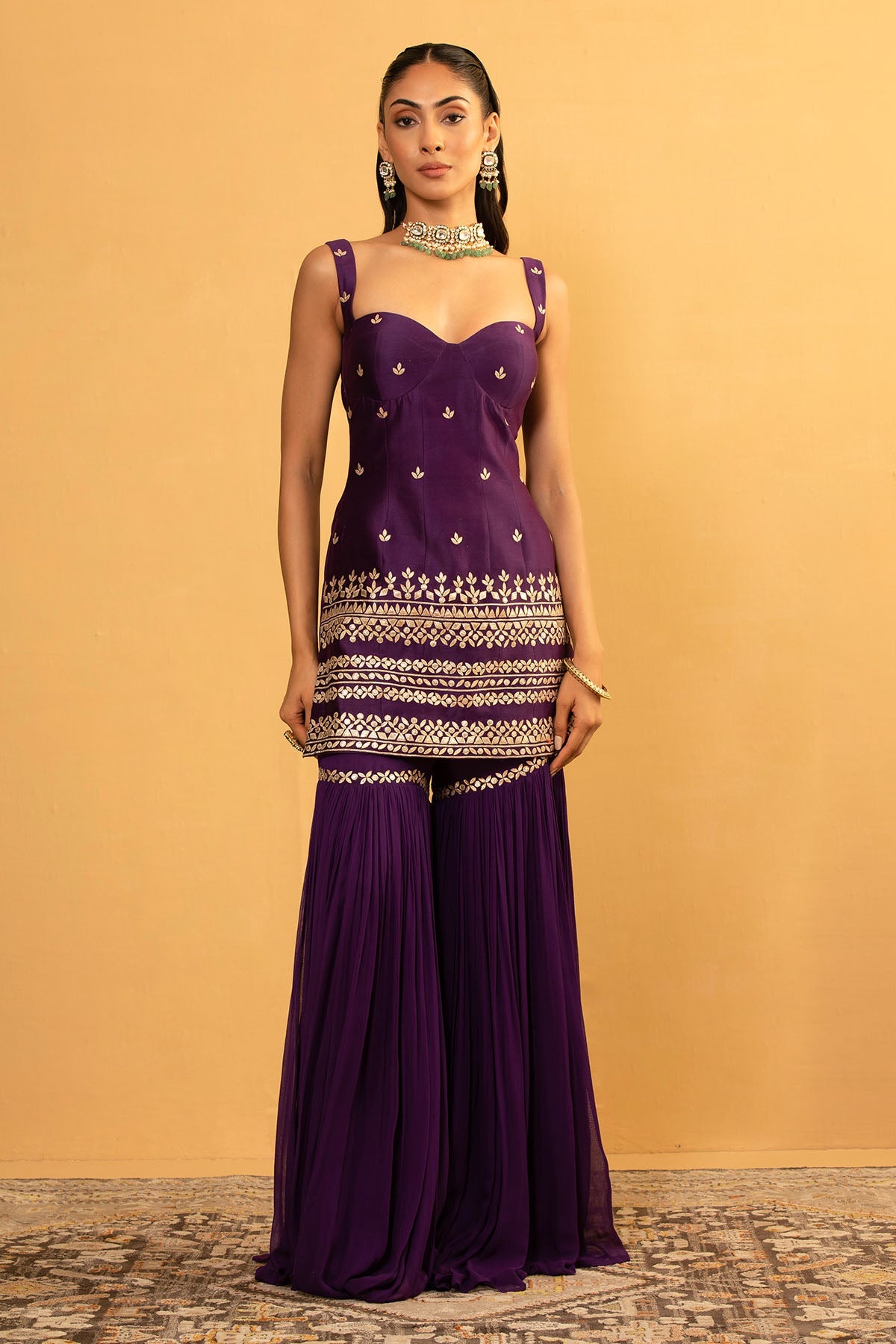 CONSIST OF CHANDERI KURTA WITH CHAMPAGNE GOTA WORK . IT IS PAIRED WITH GEORGETTE SHARARA AND NET DUPATTA WITH CHANDERI BORDER