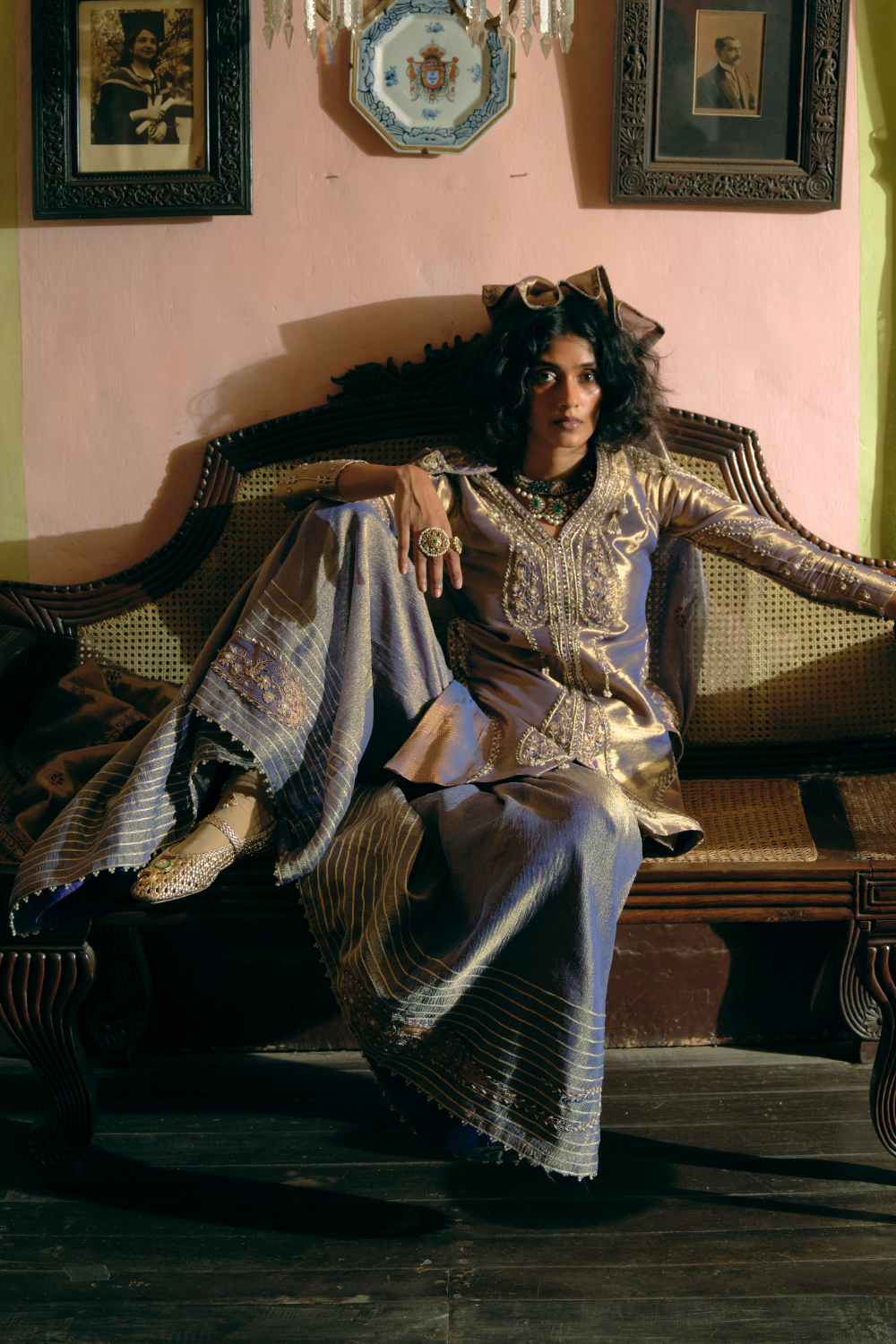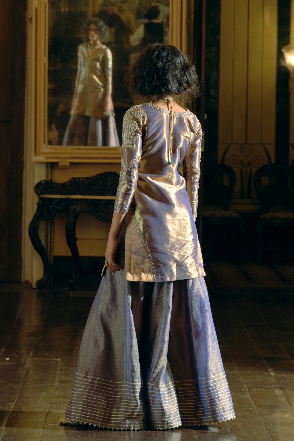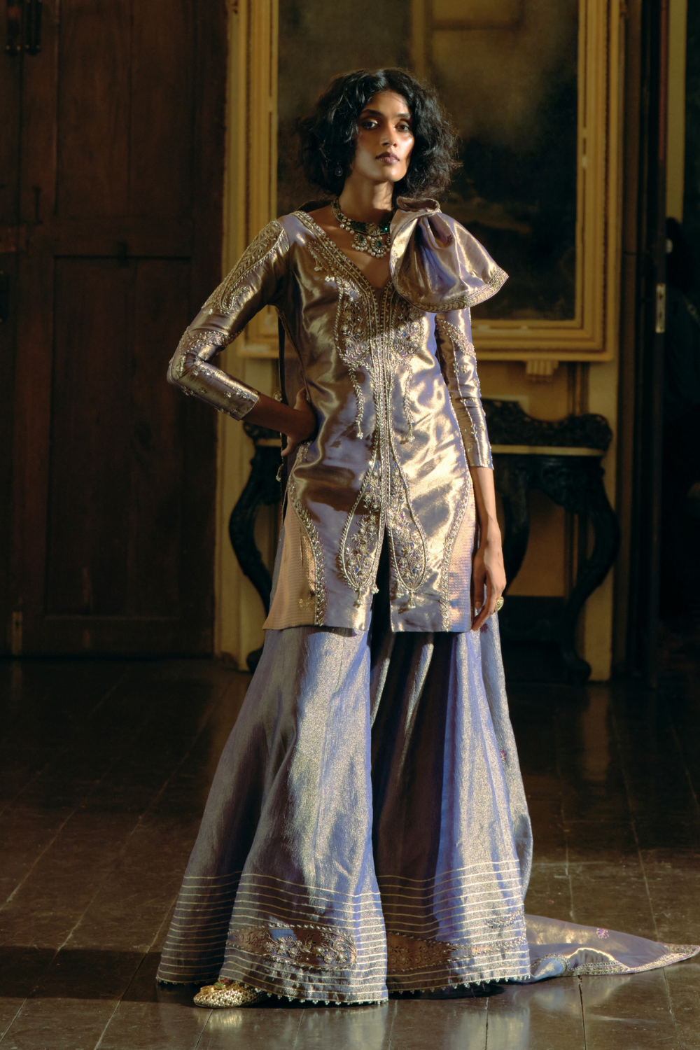 This kurti set in purple silk zari tissue and Jacquard silk Banarasi features intricate elongated paisley embroidery. The ensemble is completed with a purple tissue dupatta adorned with Jharokha-inspired panels with pearl detailing, and a sharara crafted from crushed tissue with paisley embroidery at the hem.