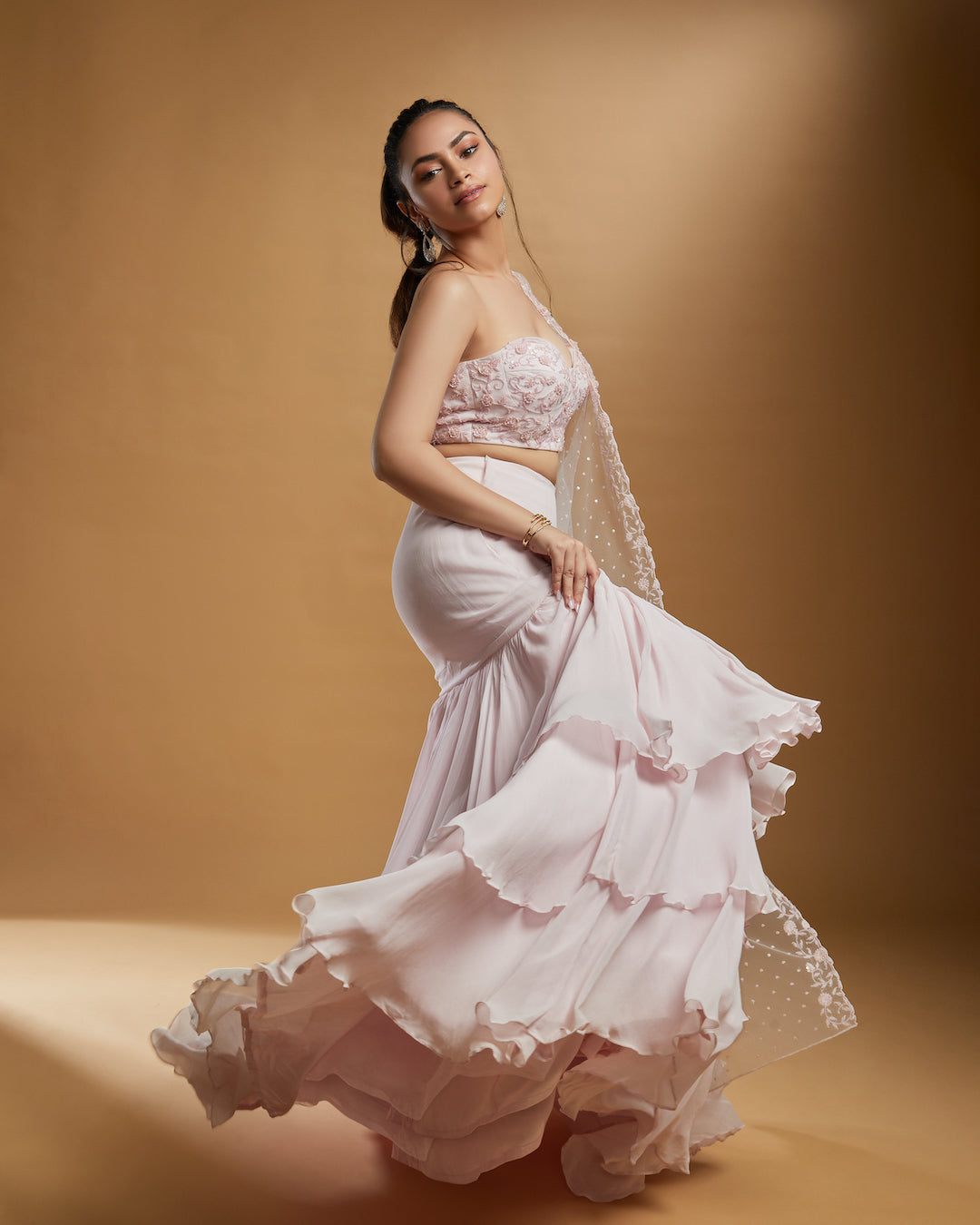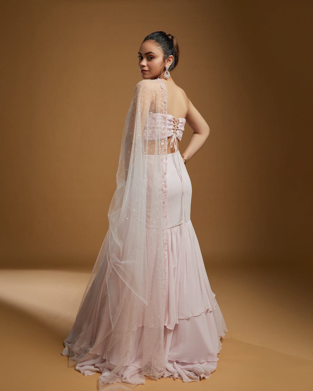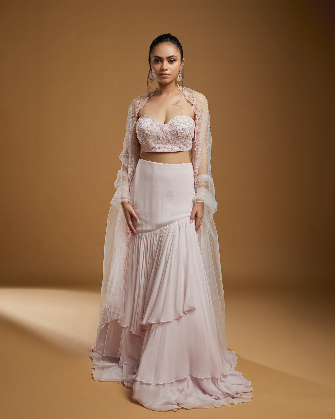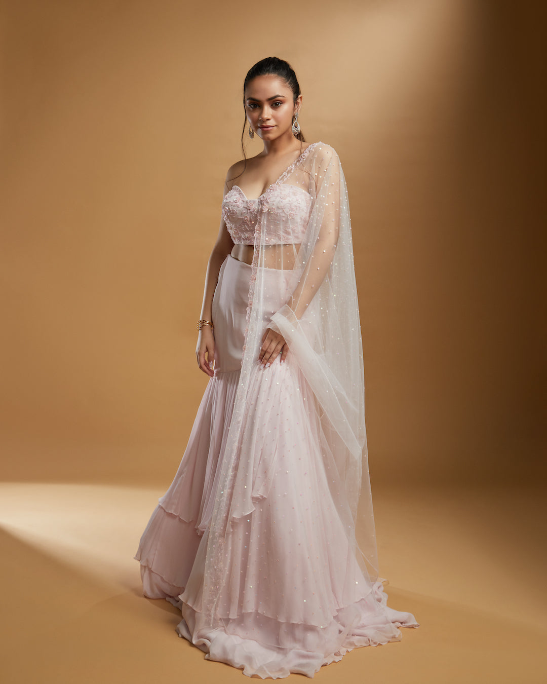 Quara is our pastel pink georgette layered fishtail lehenga set paired with a corset blouse & dupatta embellished with sequins & glass beads over a net base.