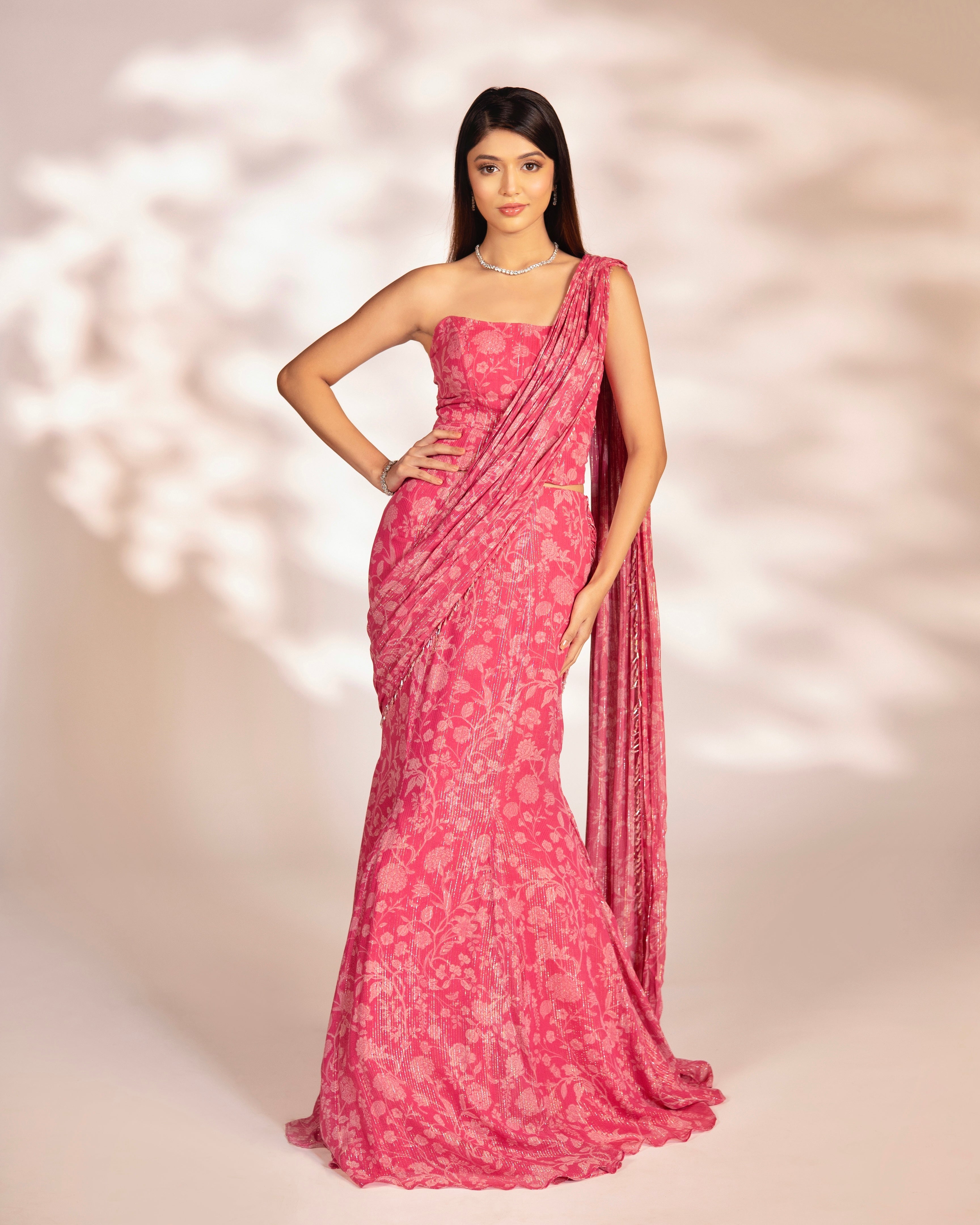 Pink printed pre-draped fishtail saree and corset blouse on a lurex georgette base with an embellished pallu border.