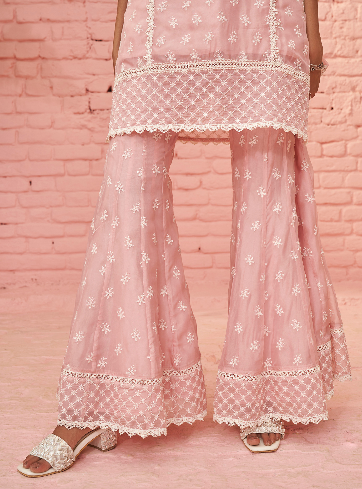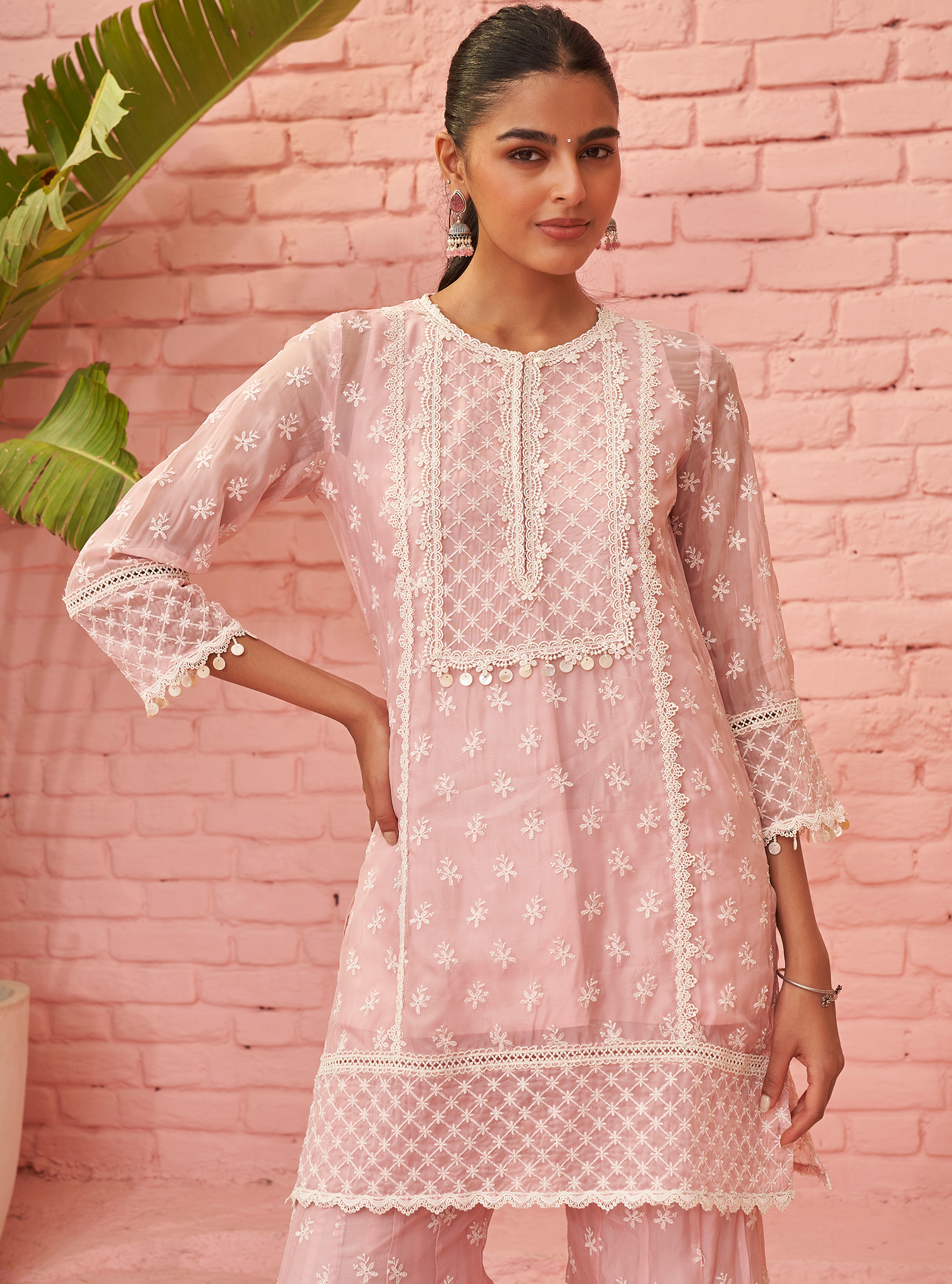 This beautiful pink kurta set features a charming short kurta adorned with delicate white embroidery and lace detailing. The kurta boasts a straight cut with a modest round neckline, highlighted by intricate lacework that extends down the yoke. Accompanying the kurta is a pair of wide-legged palazzo pants, also decorated with matching embroidery and lace at the hem, creating a cohesive and graceful ensemble. The set is completed with a graceful dupatta, draped effortlessly and featuring intricate embroidery that mirrors the kurta's design, enhancing the overall aesthetic.