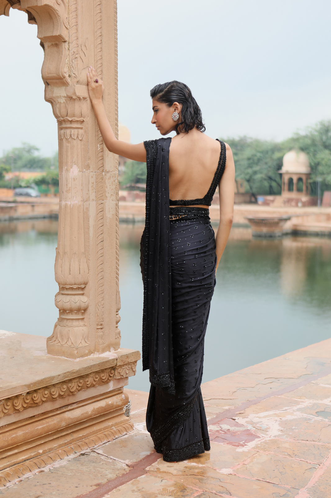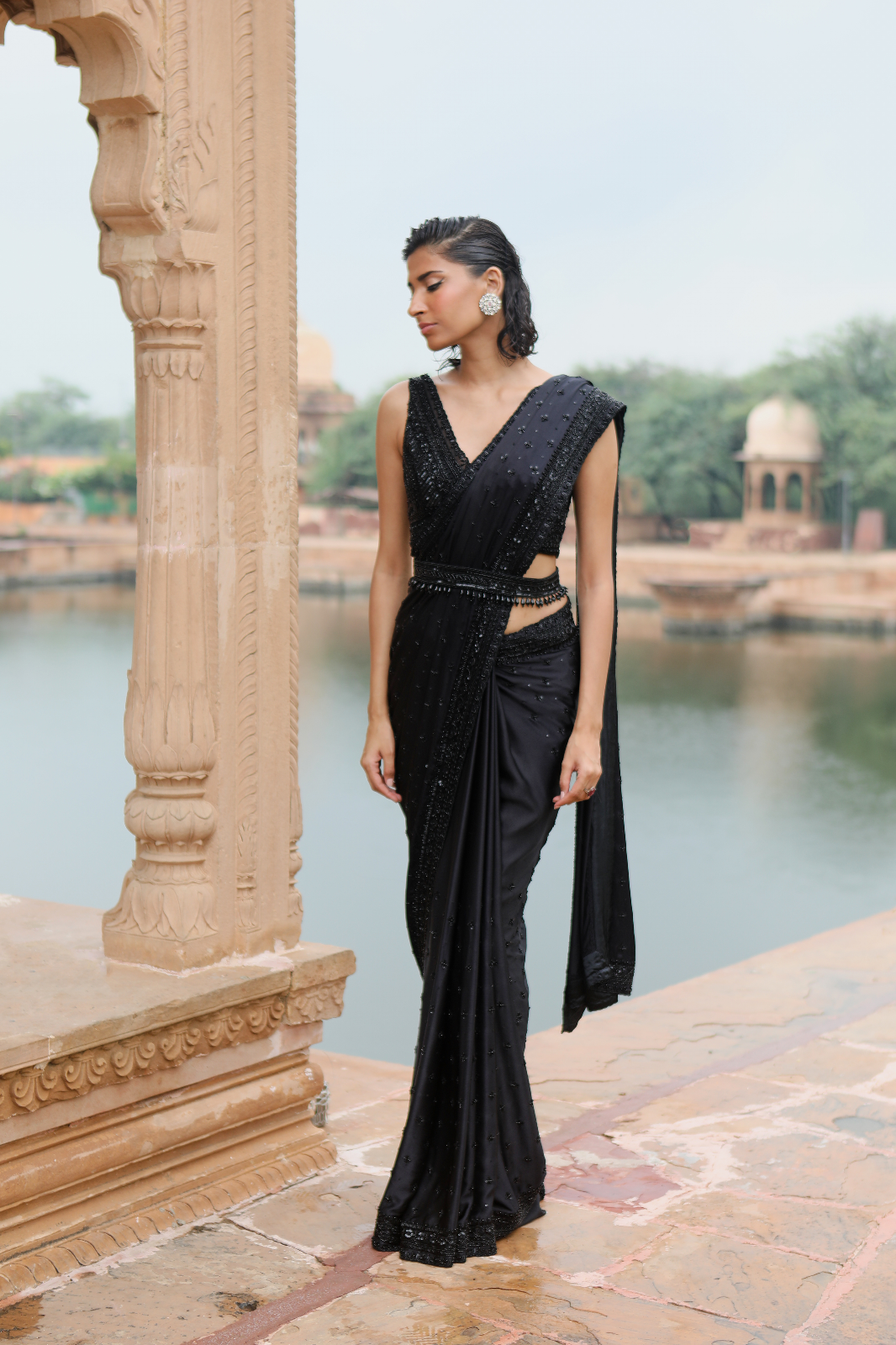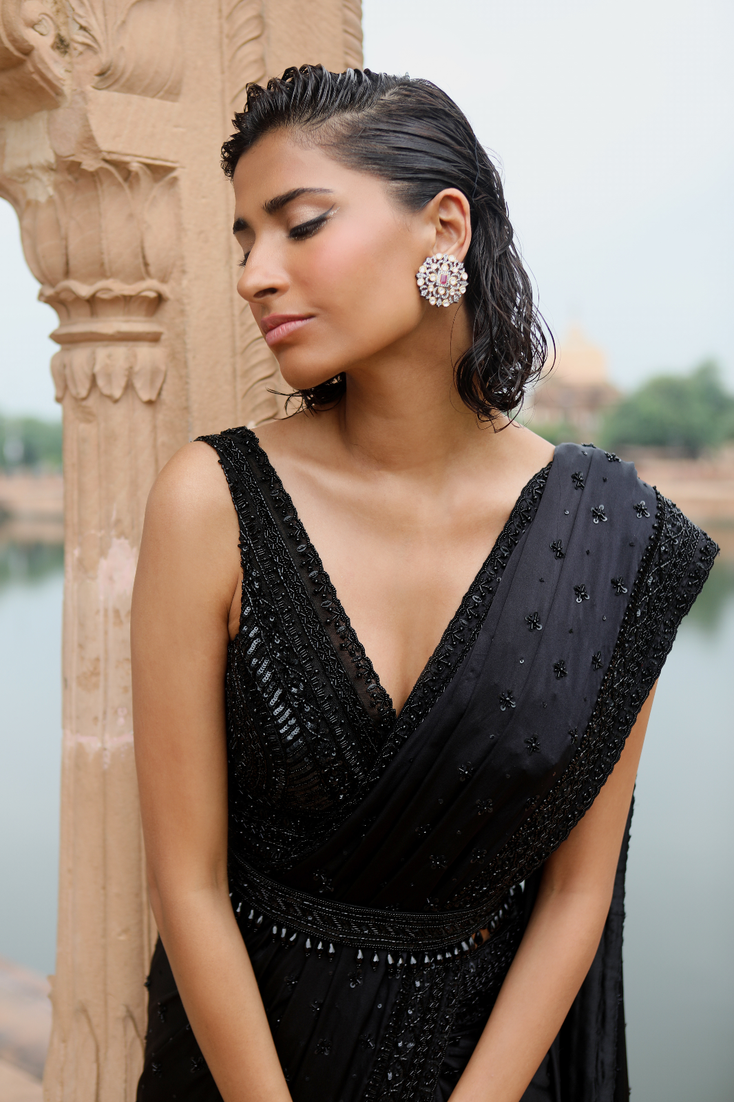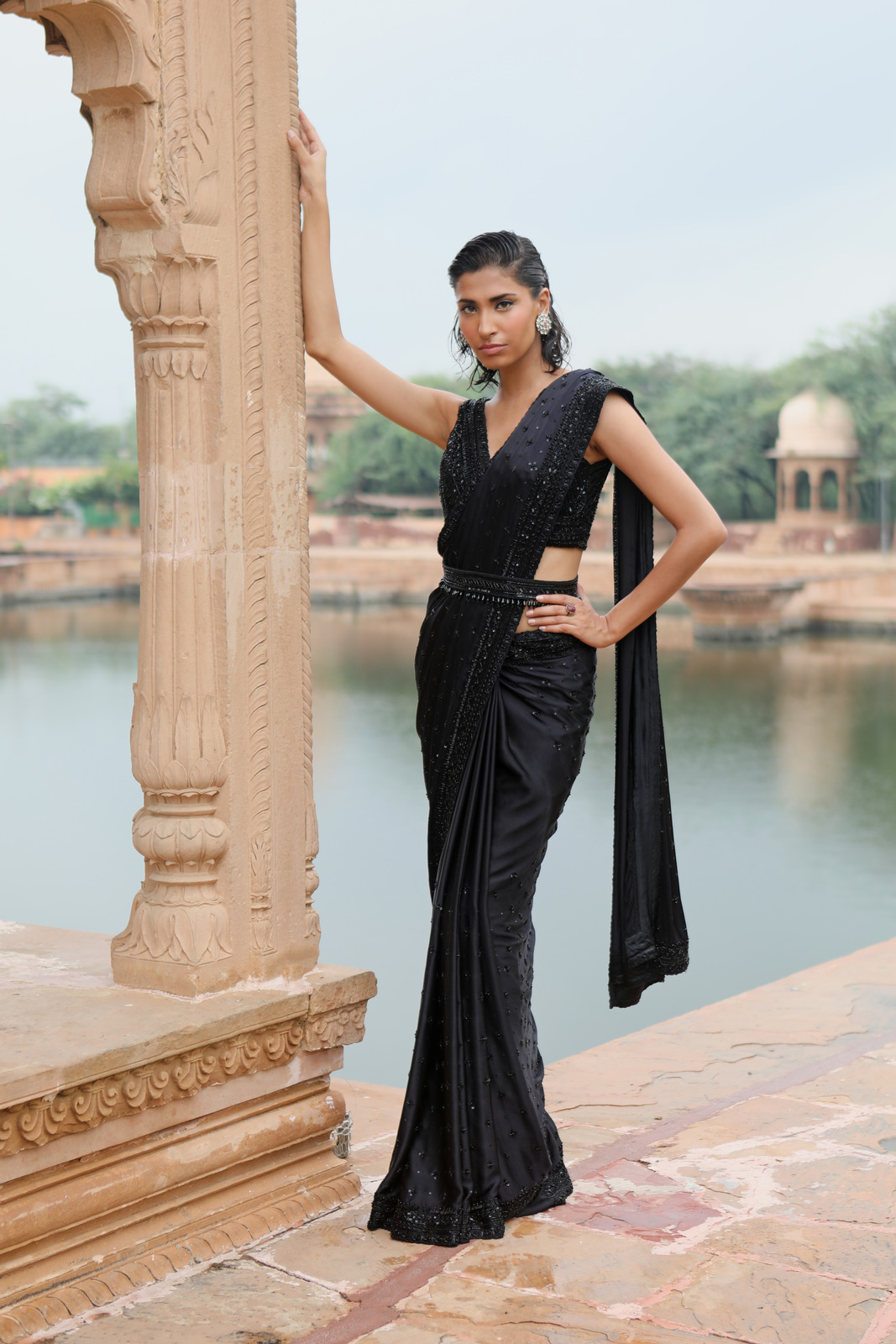 Featuring black Pure Satin saree paired with a net blouse with tone-on-tone sequin embroidery
