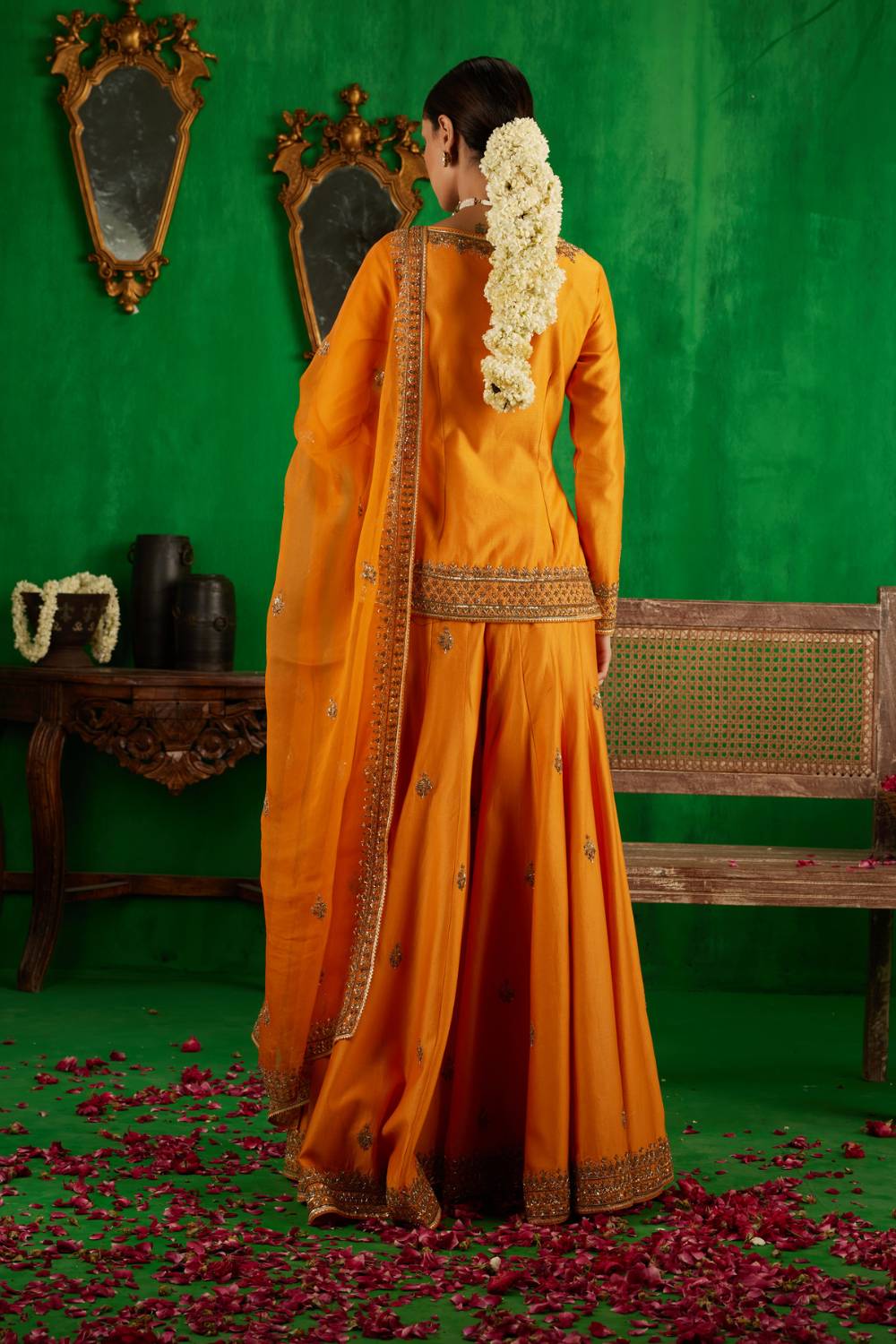 Featuring an orange Chanderi kurta sharara set paired with an organza dhupatta with antic gold dori and aari embroidery