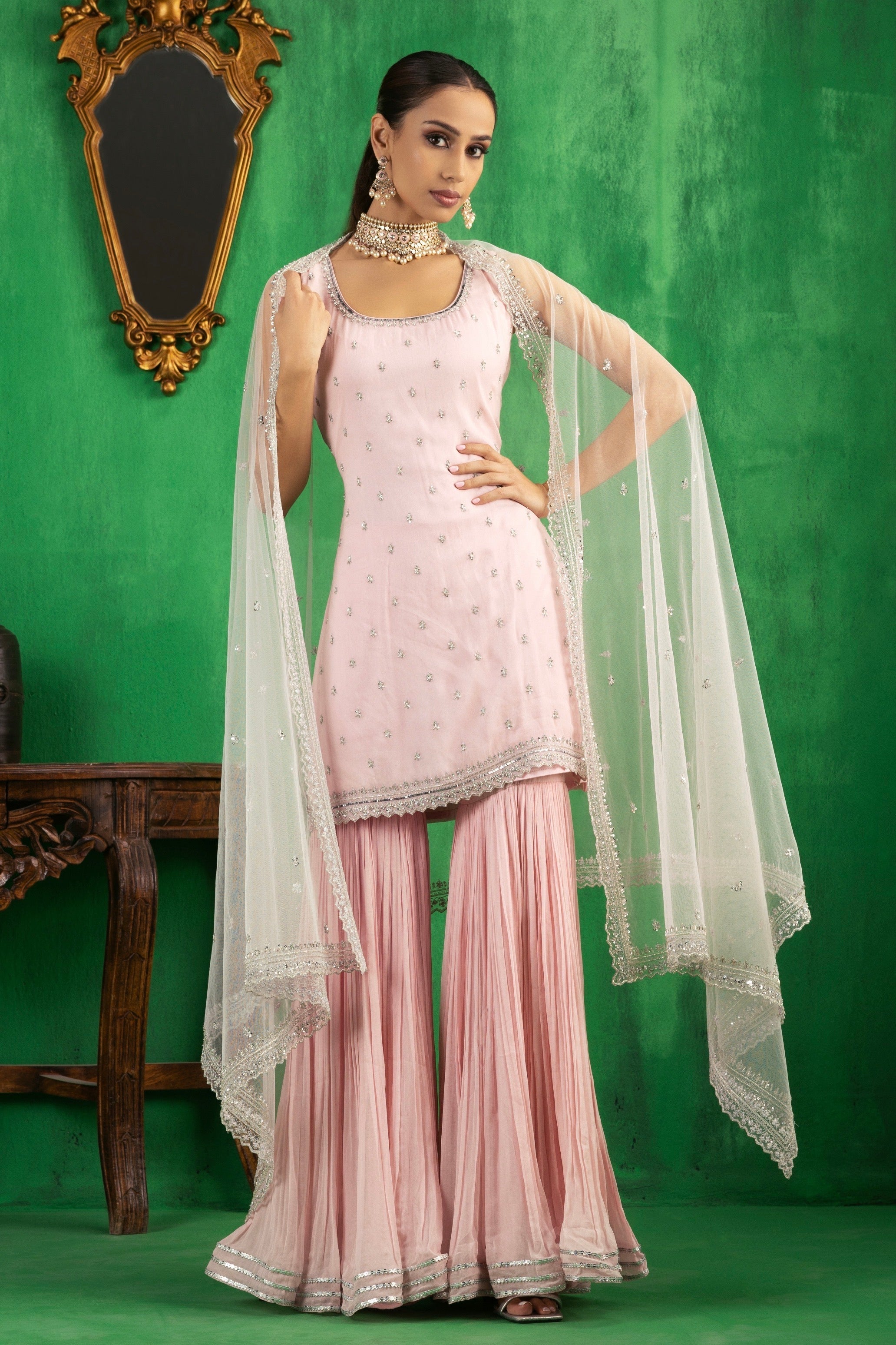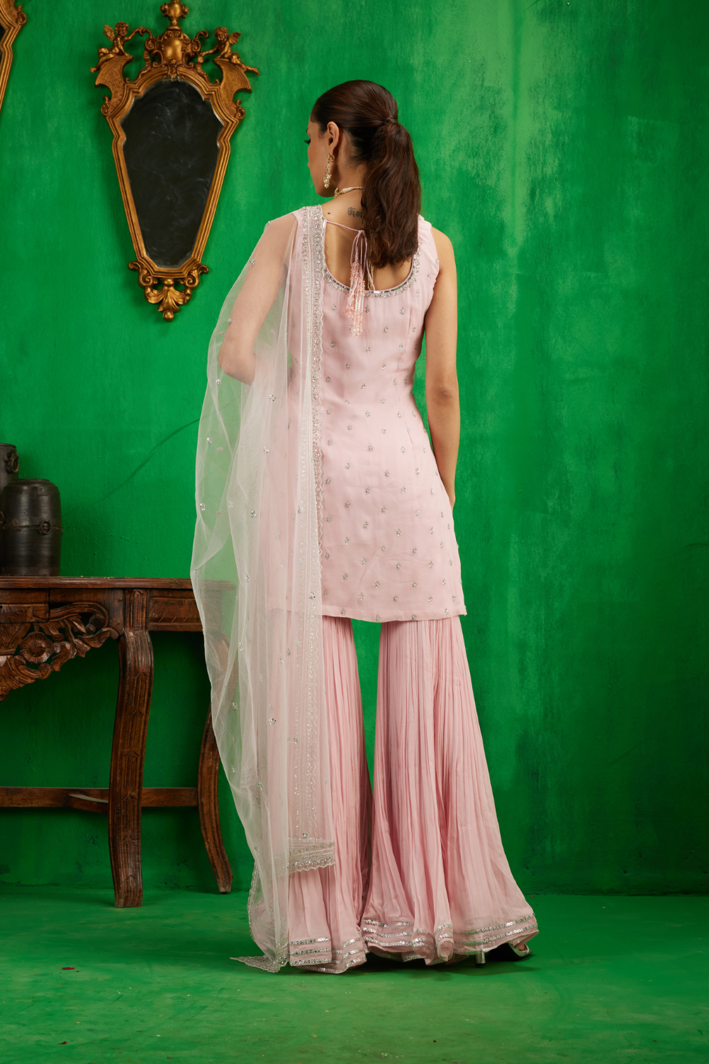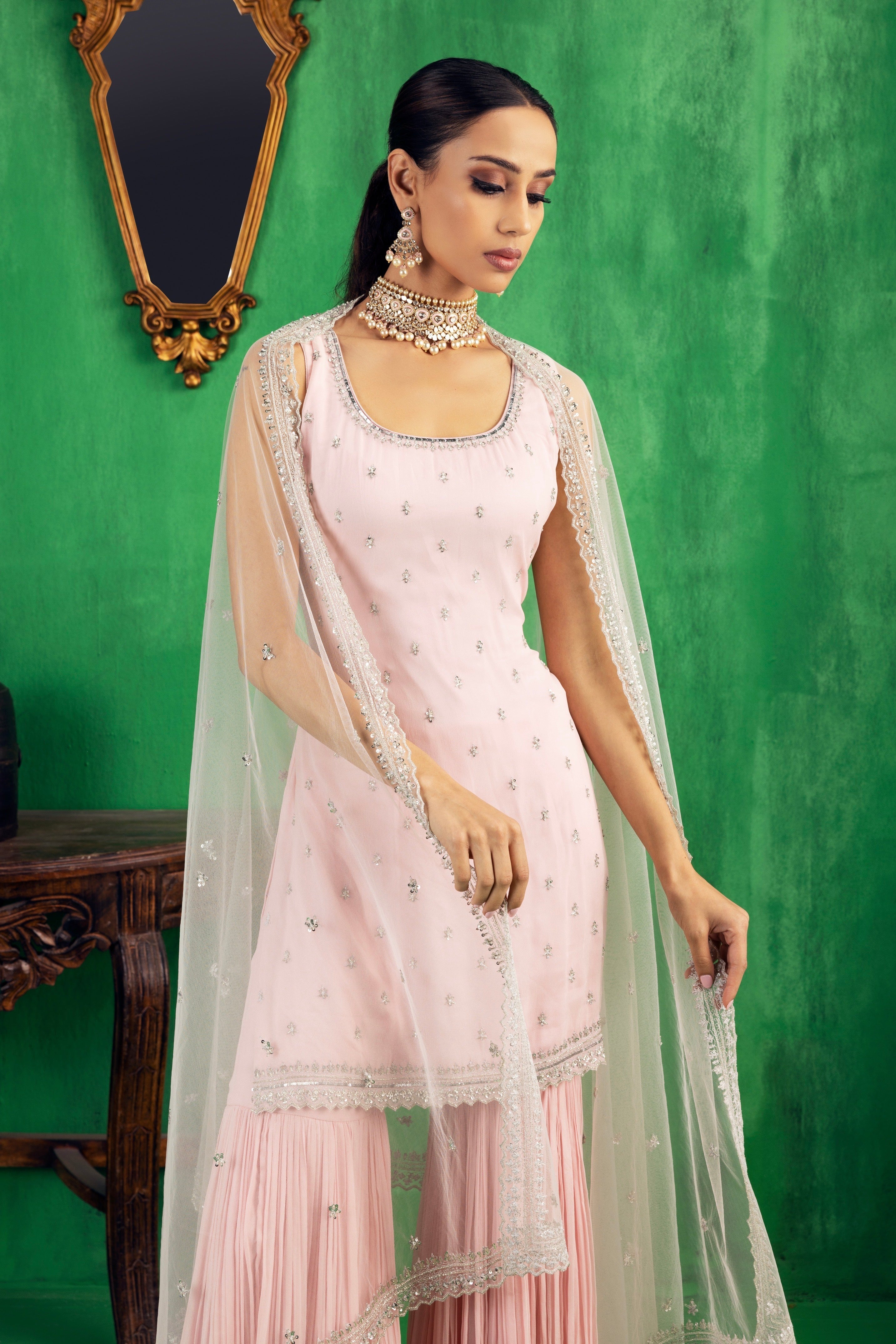 Featuring a baby pink Georgette kurta gharara set paired with a butterfly net dupatta with silver aari and zari embroidery