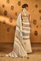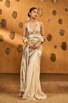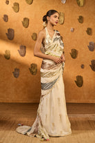 Details: This ivory saree in luxurious raw silk features a striking half-and-half layout with foil print in rich gold. The pallu is highlighted with a vibrant multicolored lampi panel, adding festive brilliance and texture to the drape. It is paired with a halter gota blouse featuring delicate foil detailing and a plunge neckline—perfect for a bold yet elegant look.
