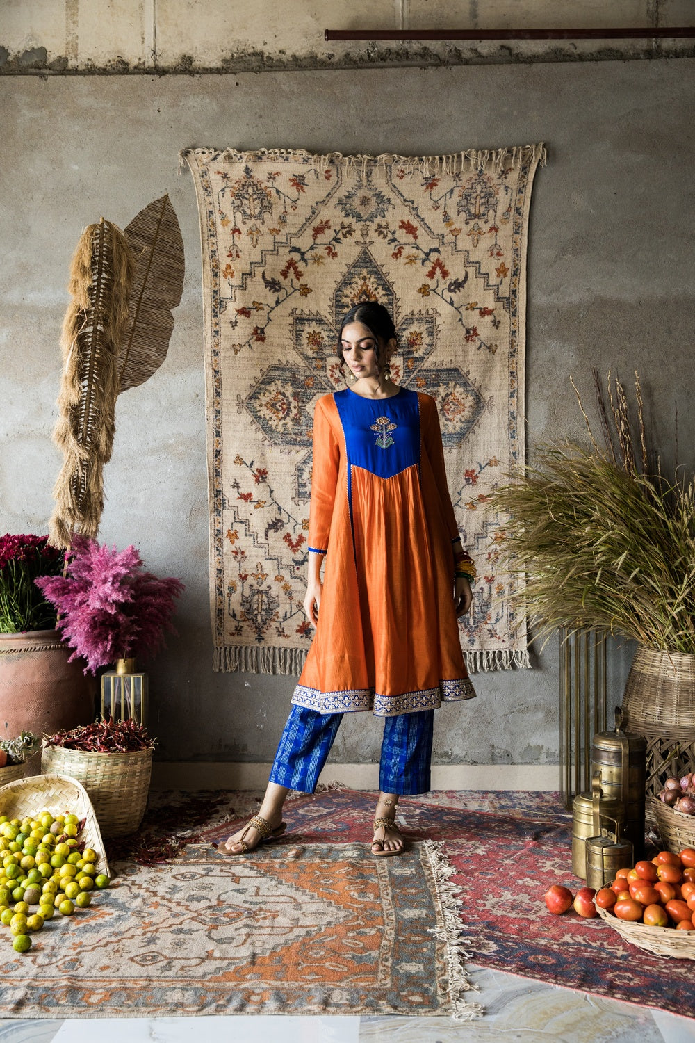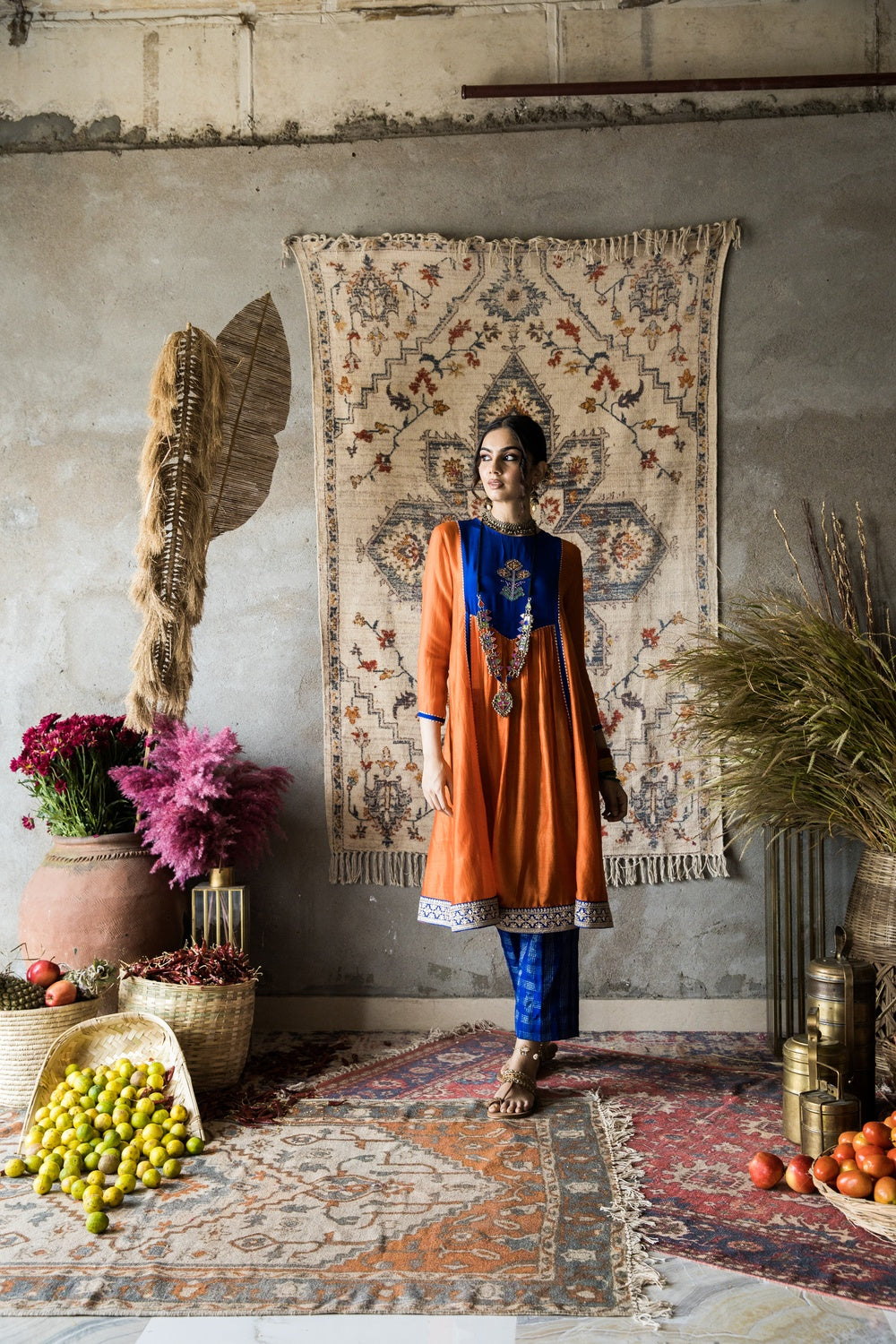 A seraphic citrus orange Chandheri kurti set, bestowing the wearer with elegance. This piece is made with exotic Chandheri and silk fabrics exemplifying exclusivity and luxury. This ensemble is perfect for festive occasions.