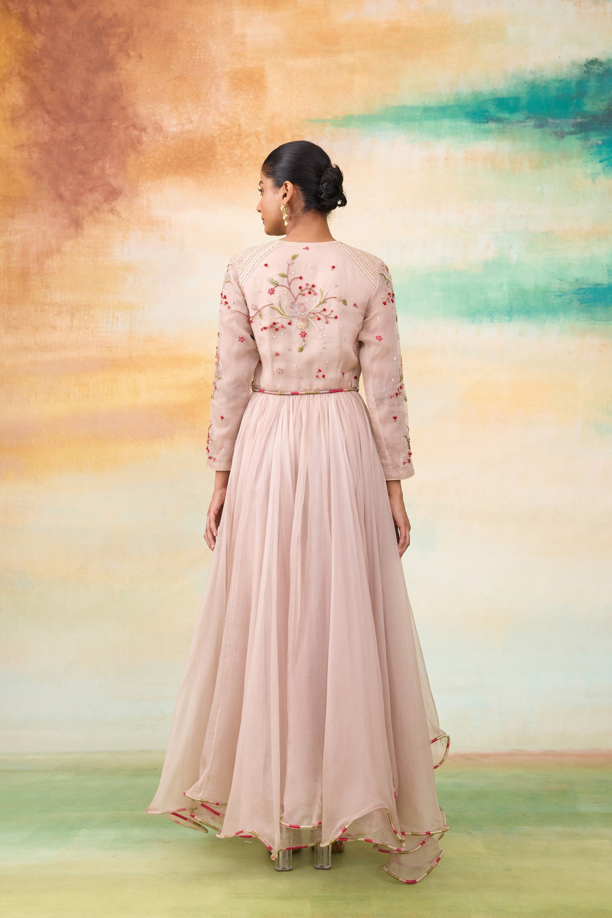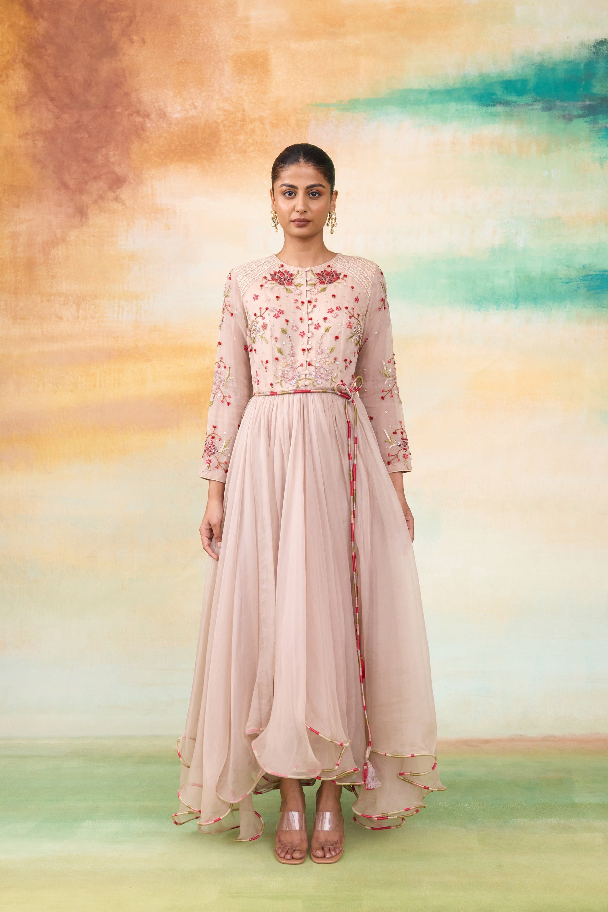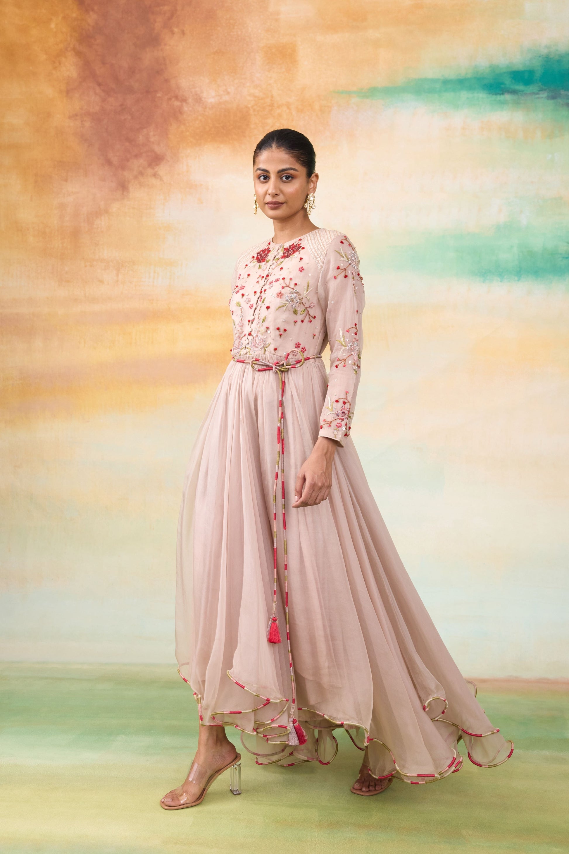 Our Blossom dress in a captivating rose hue, perfect for day functions and celebrations. This enchanting dress features colorful dori detailing at the hem, enhanced with intricate sequin, bead, and threadwork for a touch of glamour. The look is complete with a charming dori belt adorned with delicate thread tassels.